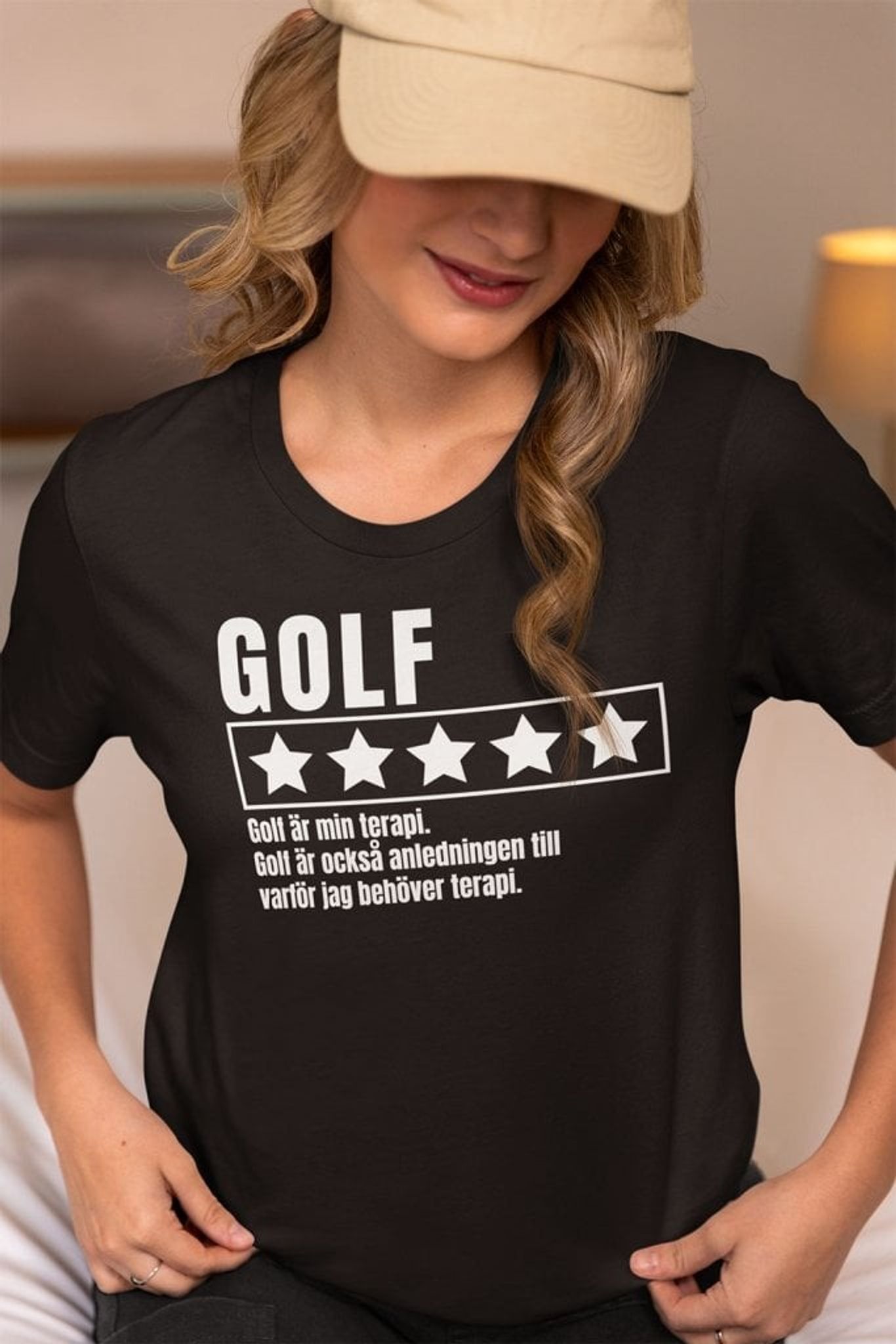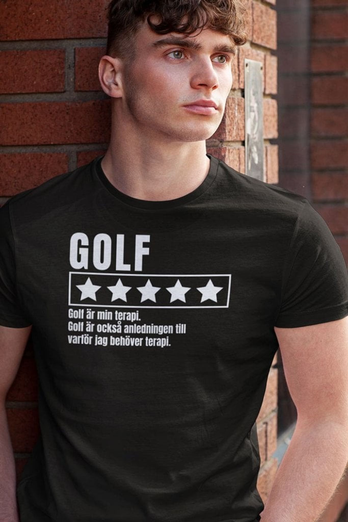 Denna T-shirt är perfekt för alla som älskar golf och kan relatera till de känslomässiga toppar och dalar som spelet erbjuder. Med den humoristiska texten "Golf är min terapi. Golf är också anledningen till varför jag behöver terapi" fångar den essensen av att vara en golfentusiast.