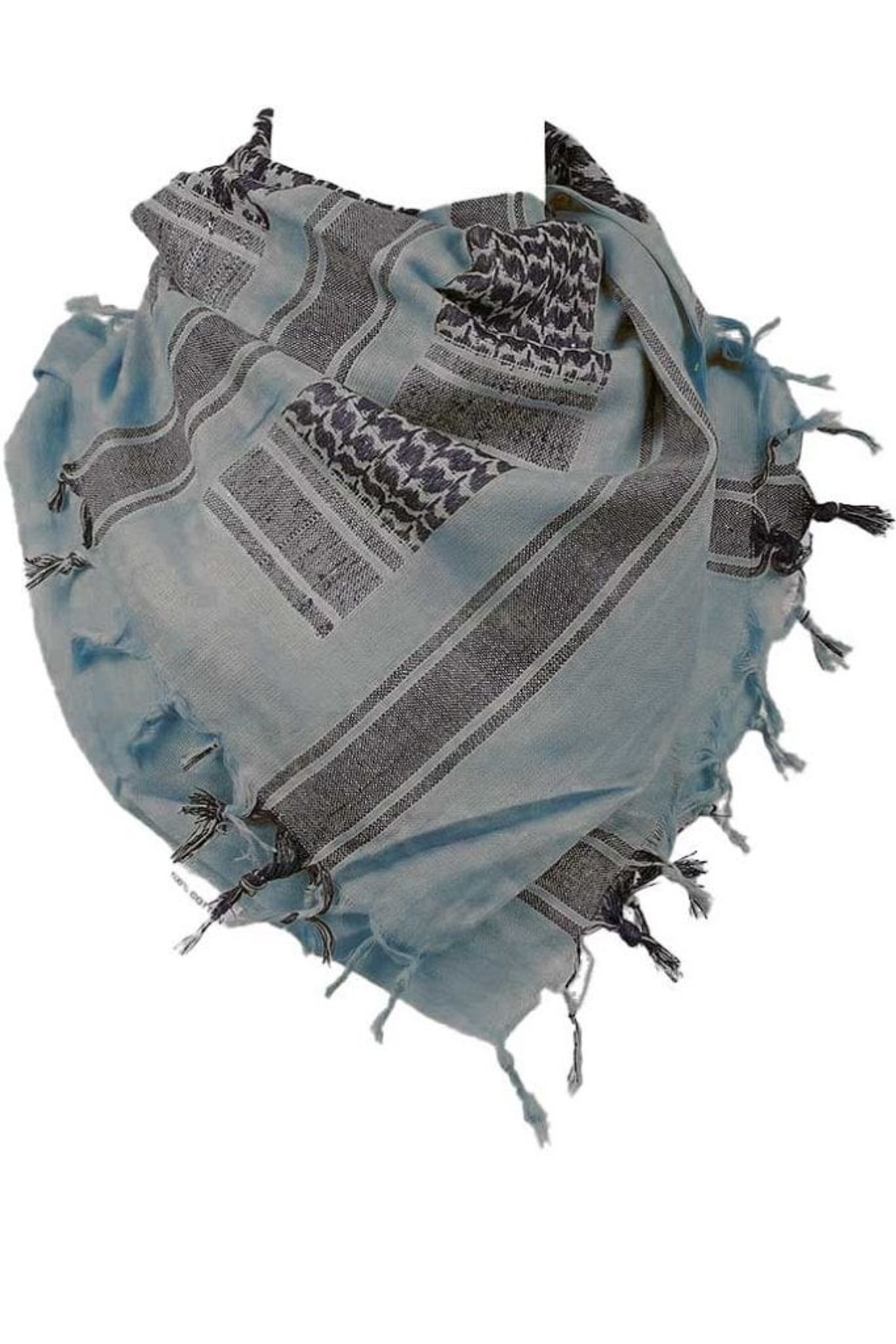 Denna eleganta Palestinasjal, även känd som Keffiyeh eller PLO-sjal, i en sofistikerad gråblå och svart färgkombination, är ett mångsidigt och stilfullt tillägg till din garderob.