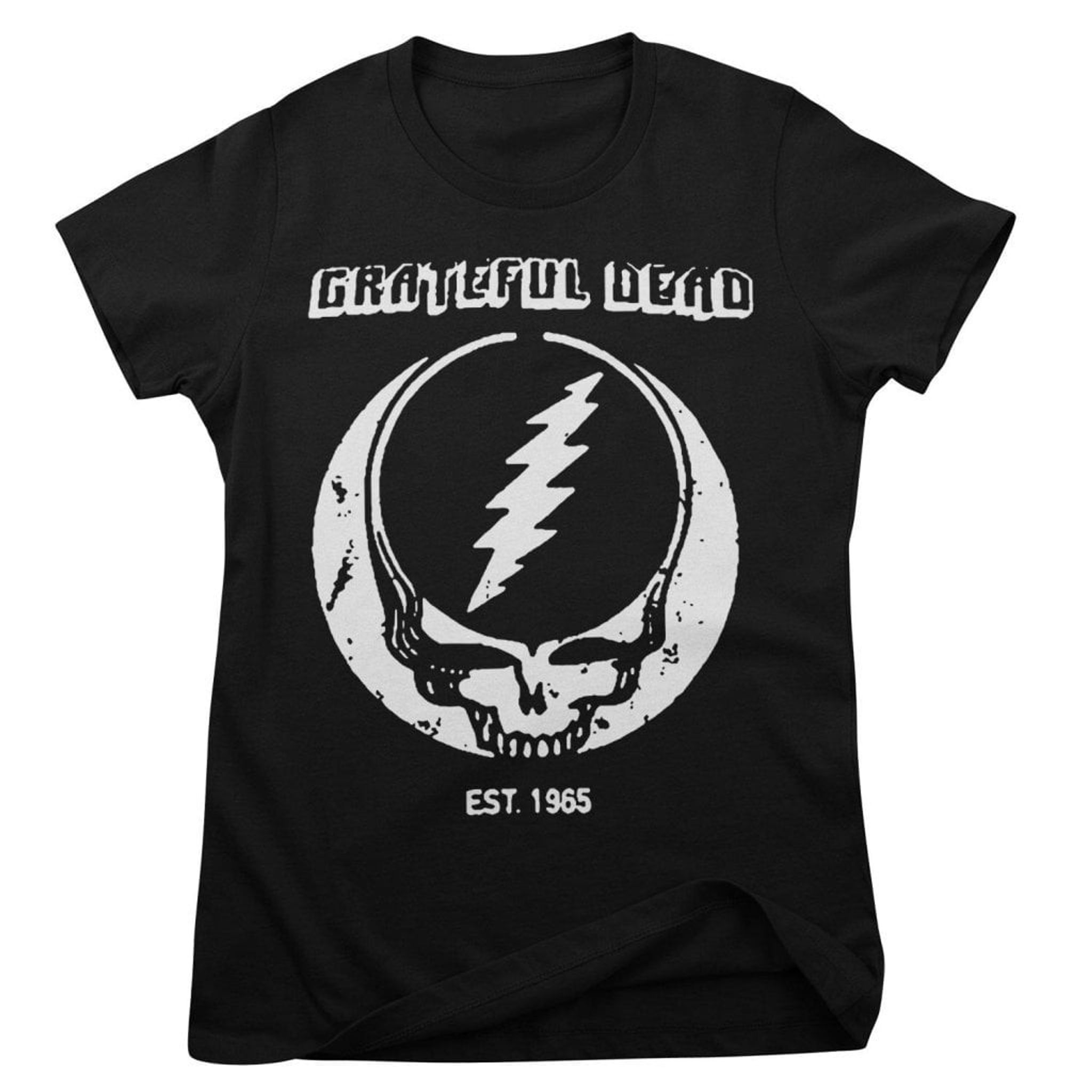 Framsidan pryds av det klassiska "Steal Your Face"-motivet i svart och vitt, med en dödskalle och blixt omgiven av en cirkel. Texten "Grateful Dead" visas i vintage-stil ovanför, medan "Est. 1965" markerar bandets grundande år nedanför designen. Det minimalistiska trycket ger en ren och autentisk känsla.