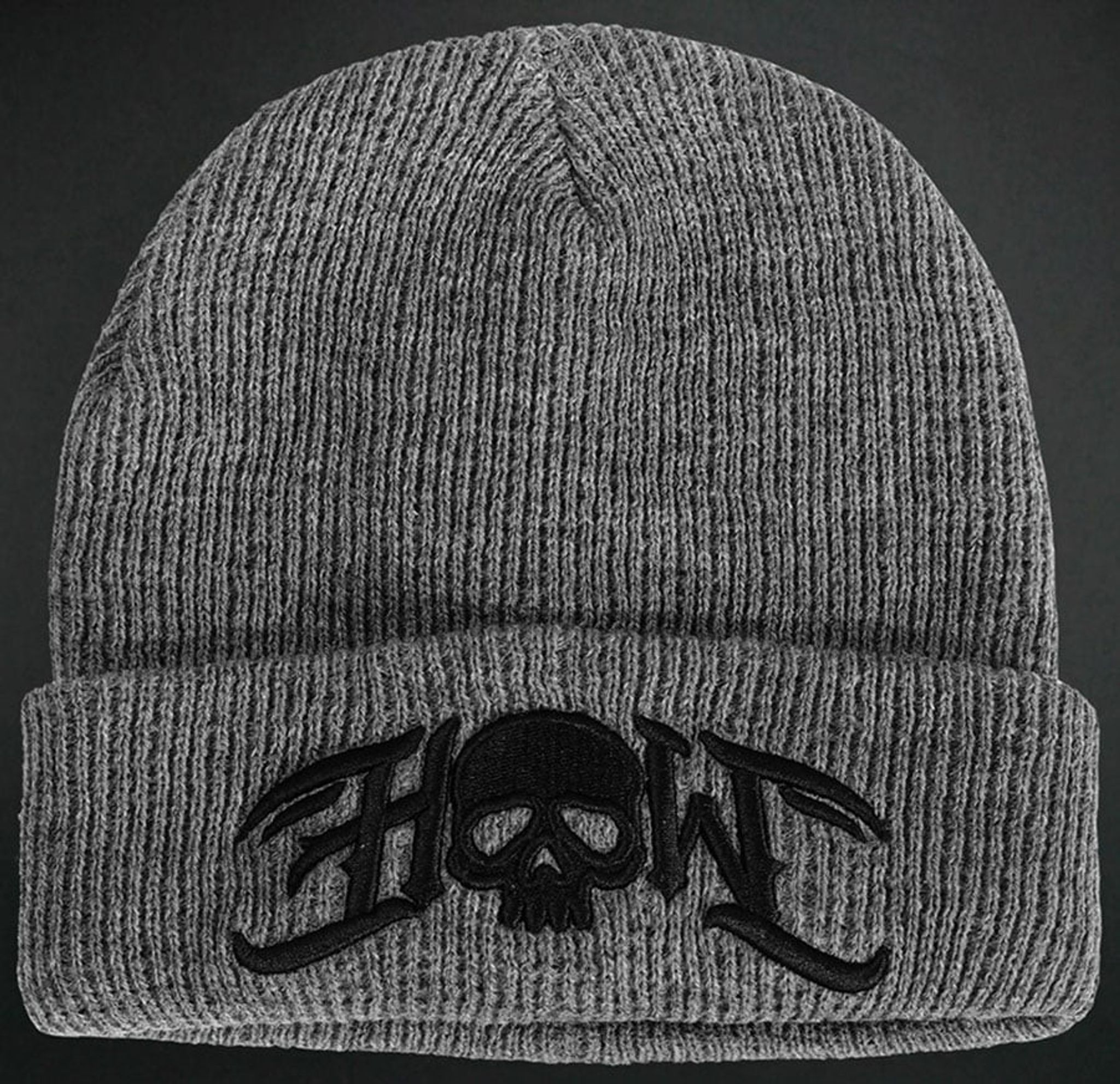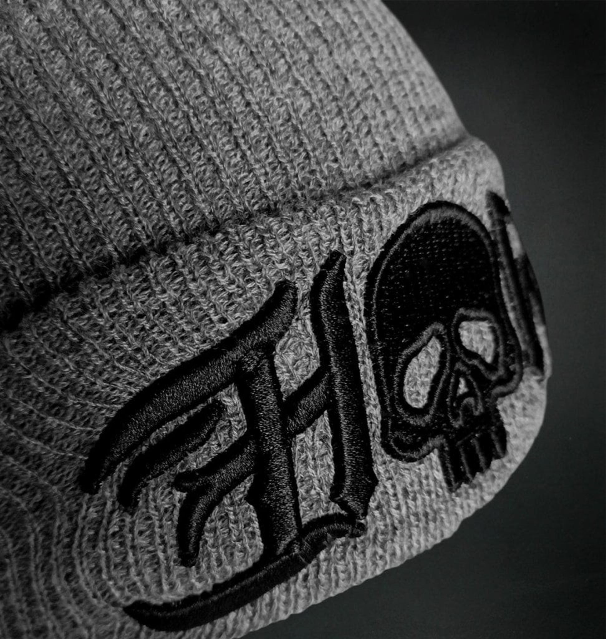 En stickad mössa med uppvikt kant och Hyraws logotyp broderat i svart över den uppvikta kanten. Logotypen ska enligt märket Hyraw ha fått inspiration från Castle Grayskull från Masters Of The Universe.