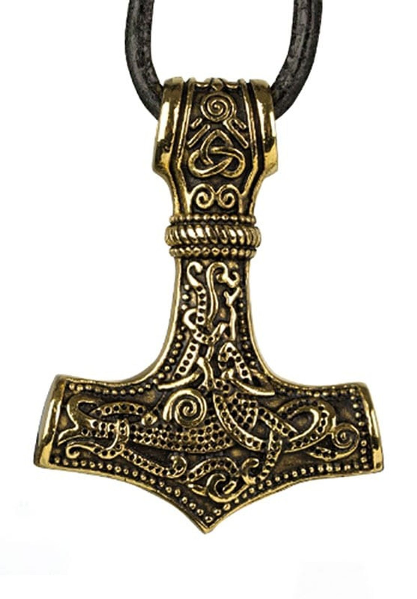 En fint mönstrad version av Tors hammare med en blank guldfärgad yta med svart skuggning.