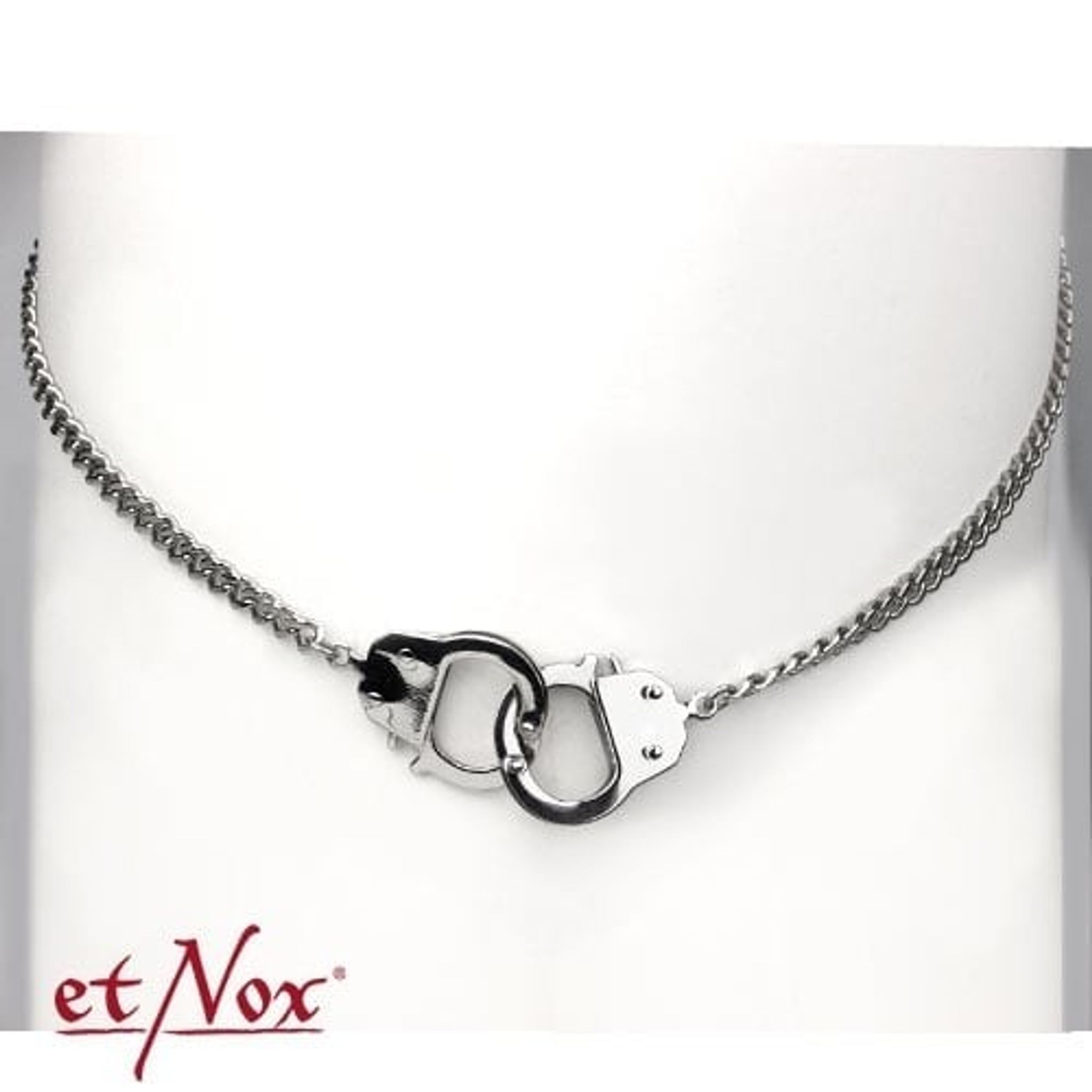 Ett halsband av rostfritt stål som har ett par små handbojor fram. Handbojorna kan fästas ihop på olika sätt.
