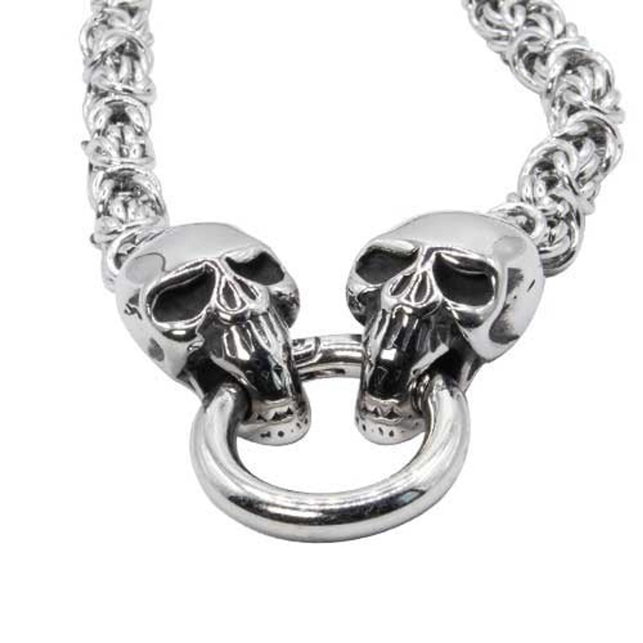 Denna imponerande halskedja är ett mästerverk av modern design med en nypa uråldrig mystik. Den robusta kedjan, vävd i en intrikat mönster av rostfritt stål, mäter 0,7 cm i tjocklek och erbjuds i längder om 60 eller 70 cm för att passa en rad personliga stilar och preferenser. Centralt i dess design är två döskallar som håller en ring mellan sina tänder - en djärv och kraftfull symbol som tycks utmana livets flyktighet.