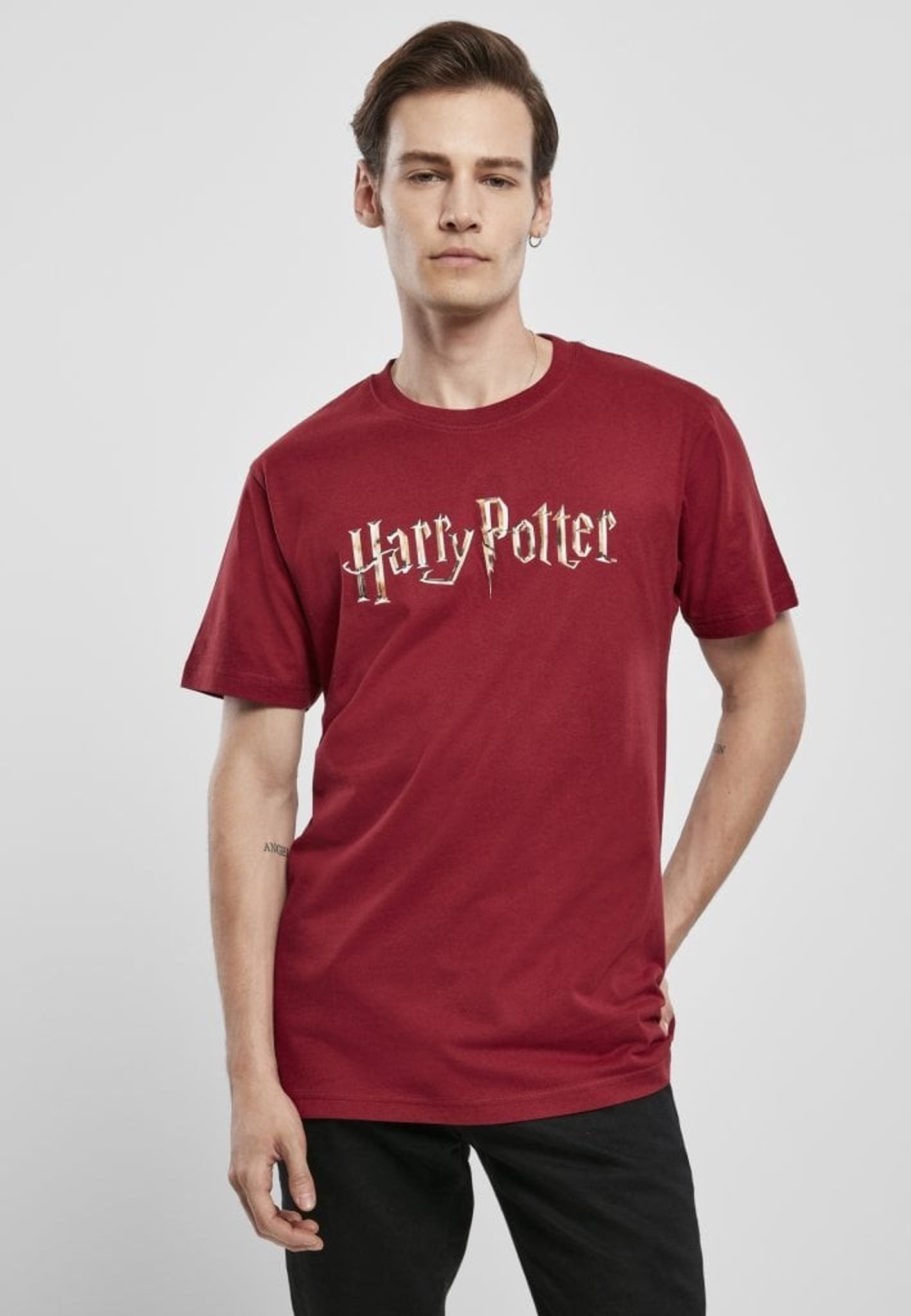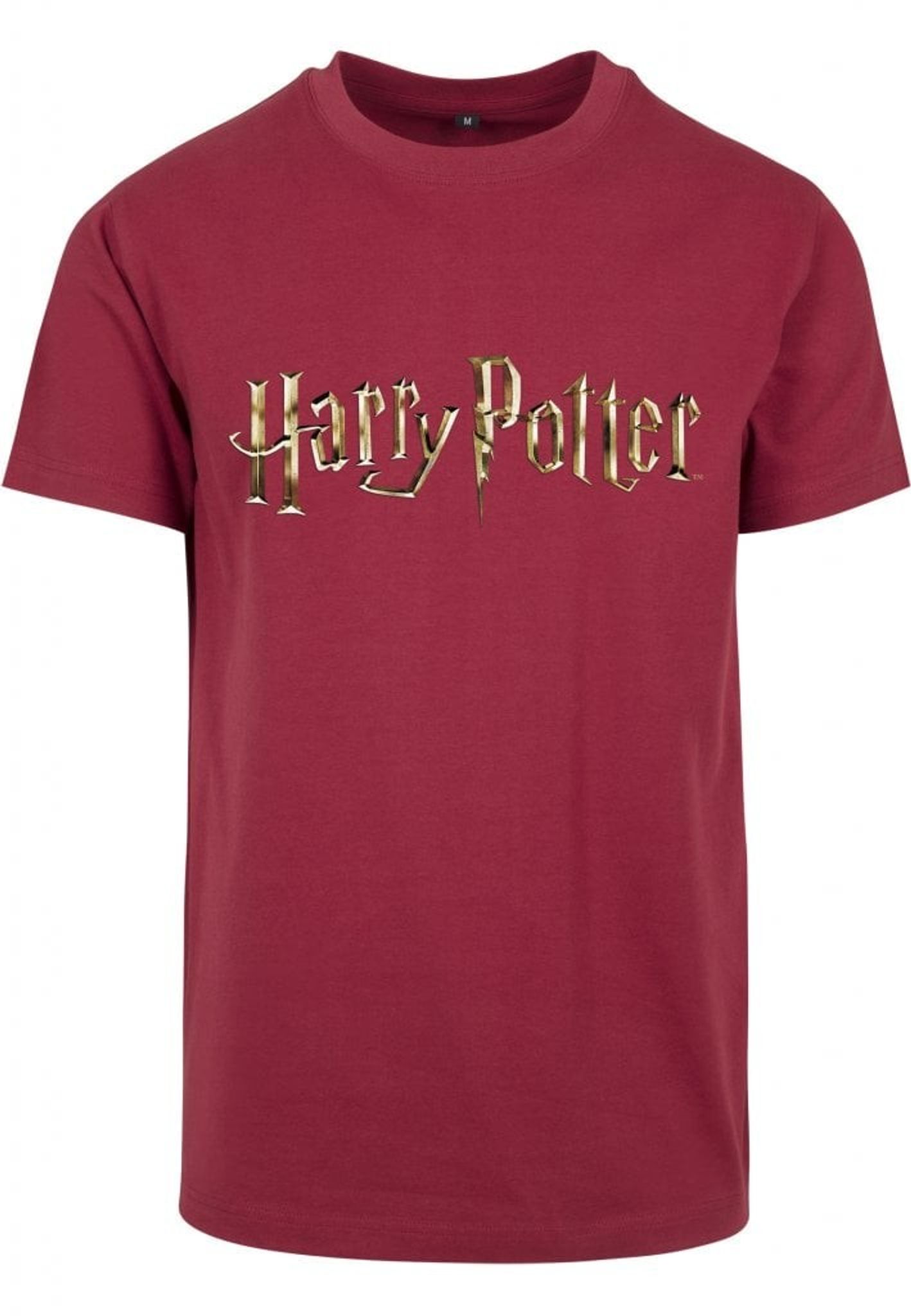 En vinröd T-shirt med den klassiska logotypen till J.K. Rowlings Harry Potter.