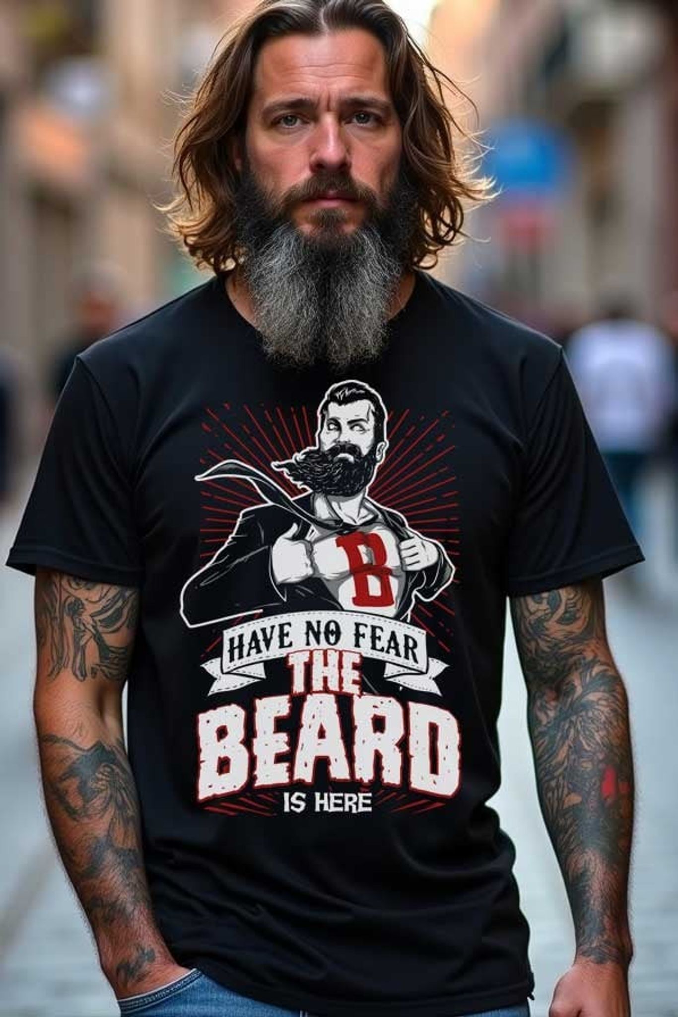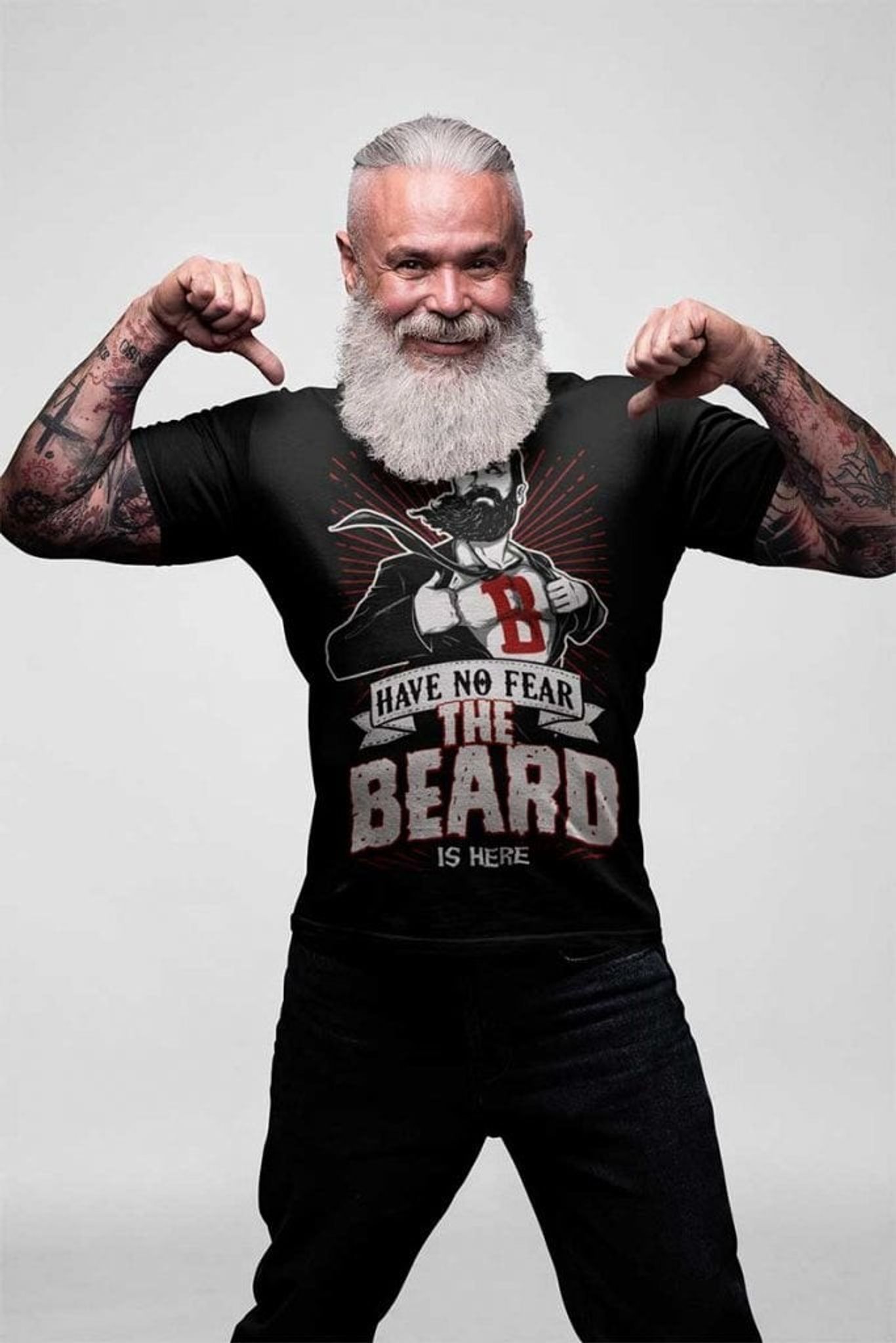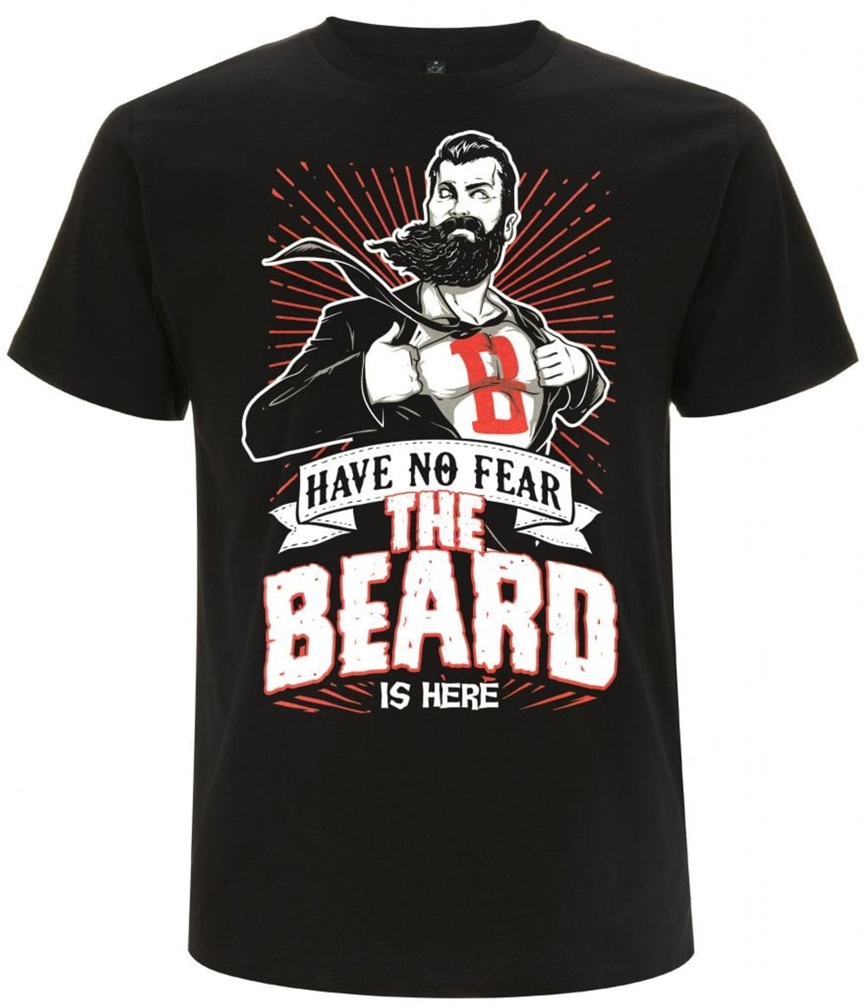 Den svarta bakgrunden gör att de vita och röda detaljerna i trycket verkligen poppar, vilket skapar en kraftfull visuell effekt. Detta är en t-shirt för dig som vill visa att ditt skägg inte bara är ett stubb, utan en superkraft.