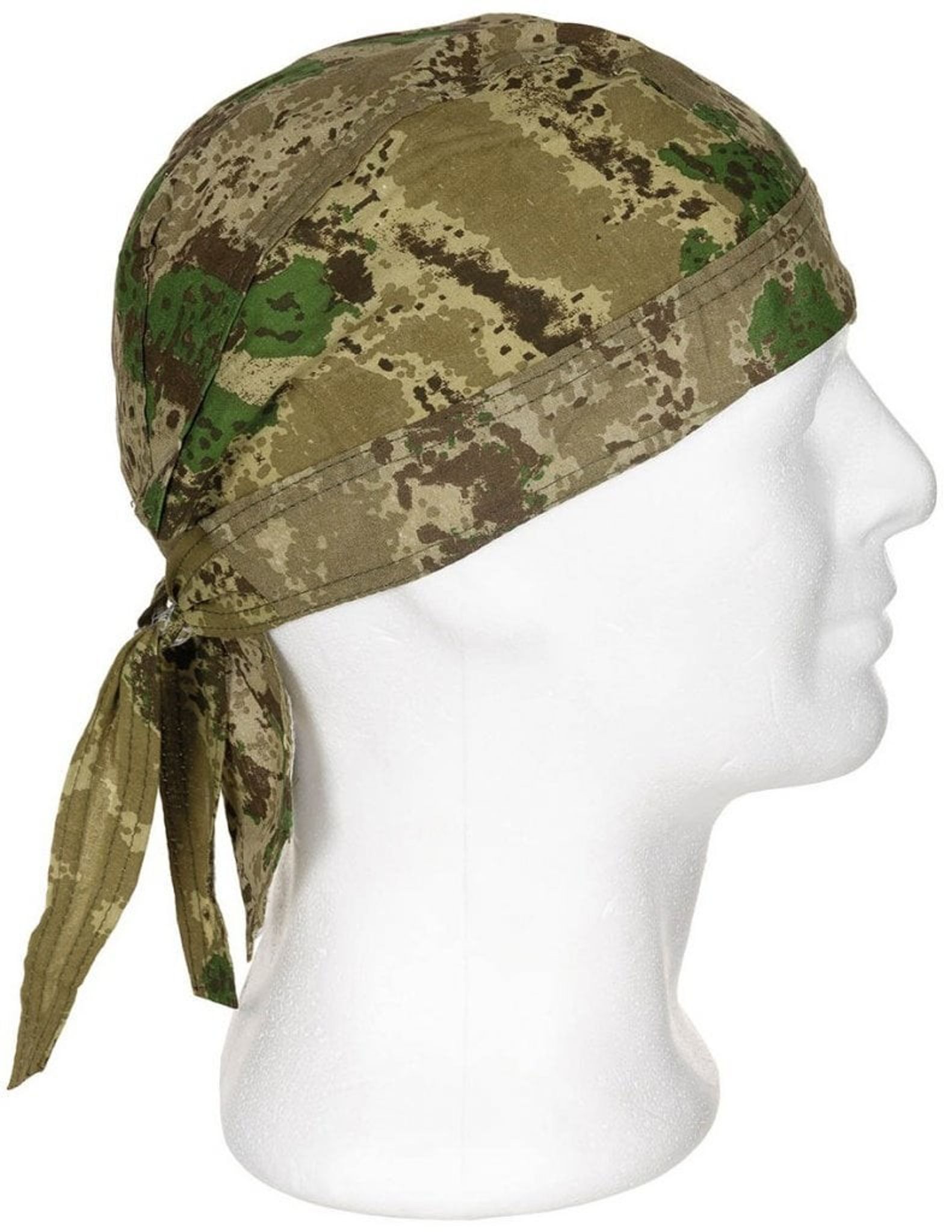 Denna huvudbandana är tillverkad i HDT-camo FG (High Definition Terrain camouflage Flecktarn Green) mönster, en avancerad typ av kamouflage som är avsett att smälta in väl i skogsmiljöer. HDT-camo FG är särskilt utformad för att bryta upp användarens silhuett och sammanfoga med de gröna nyanserna av skogsmark. Bandanan är tillverkad av 100 % bomull, vilket gör den mjuk, andningsbar och absorberande, egenskaper som är mycket uppskattade under fysiska aktiviteter och i varma klimat. Den är designad för att kunna knytas bakom huvudet för en anpassningsbar och säker passform, vilket gör den idealisk för personer med olika huvudstorlekar.