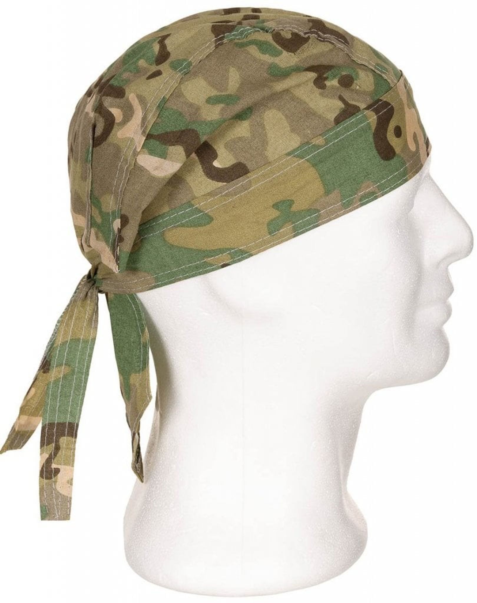 Denna produkt är en huvudbandana med kamouflagemönstret "Operation camo". Det är ett klassiskt huvudomslag som knyts på baksidan, vilket gör det möjligt för bandanan att passa alla storlekar. Bandanan är gjord av 100 % bomull, vilket gör den idealisk för användning under varma förhållanden eftersom den är skön mot huden och absorberar svett effektivt. Med en vikt på cirka 18 gram är den lätt och enkel att bära.