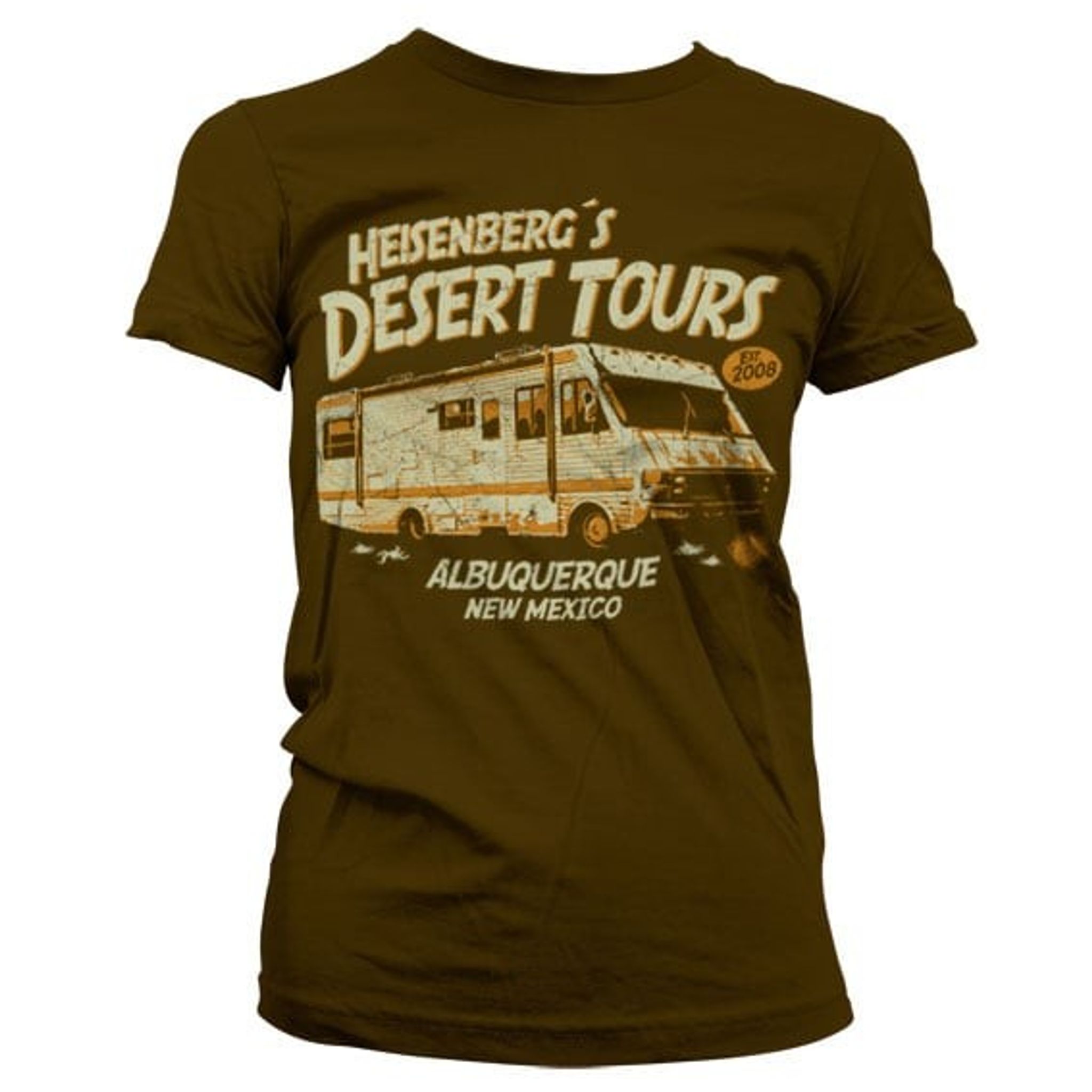 Heisenberg´s Desert Tours Girly T-Shirt är en trollande hyllning till TV-serien "Breaking Bad". Illustrationen av den gulbruna husbilen, central för seriens kreativa kemiska karriärändring, lockar med en spännande twist till sightseeing i Albuquerque.