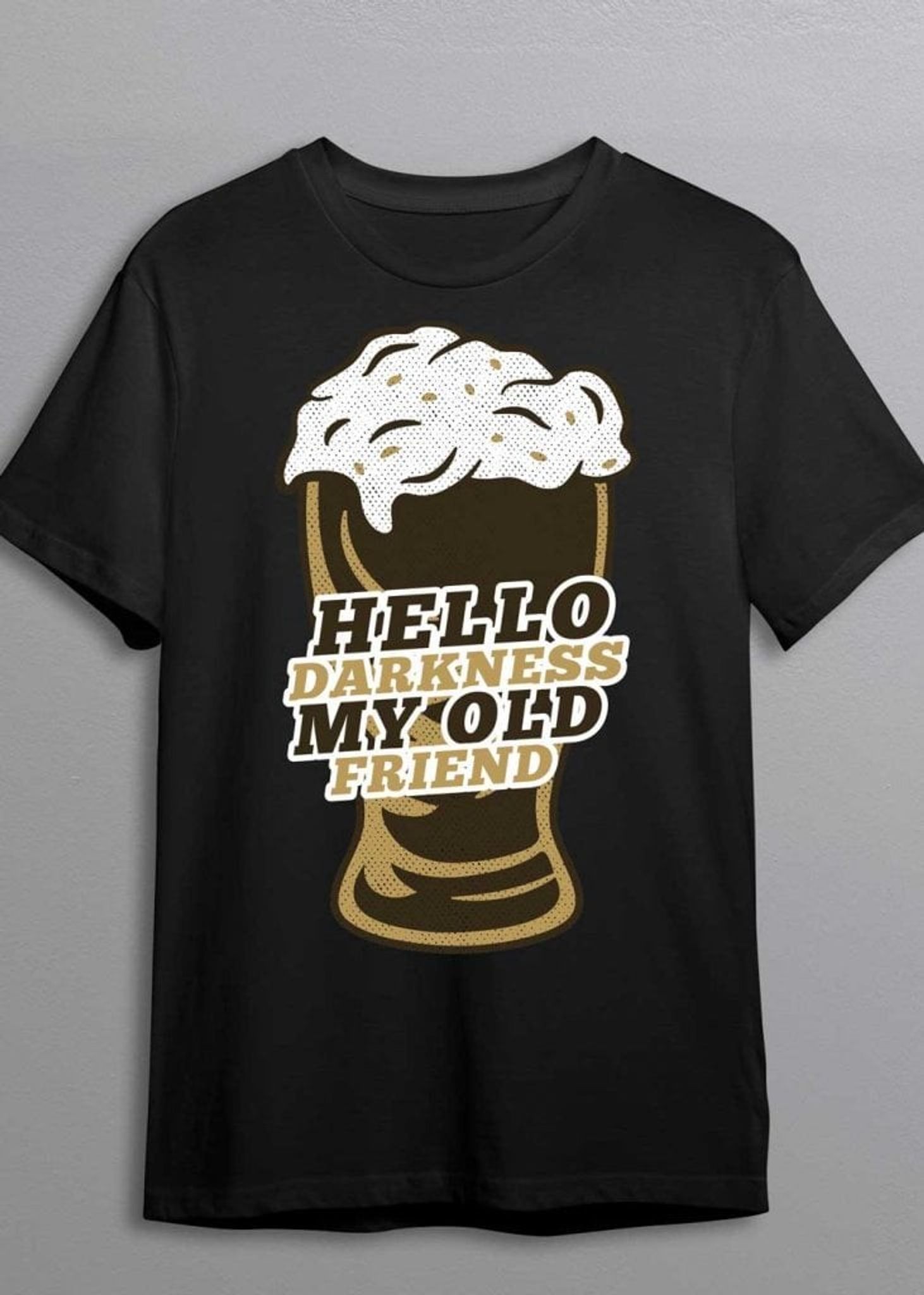 Med inspiration från Simon & Garfunkels ikoniska låttext "Hello Darkness My Old Friend," hyllar denna humoristiska t-shirt det mörka, fylliga ölet vi alla älskar.