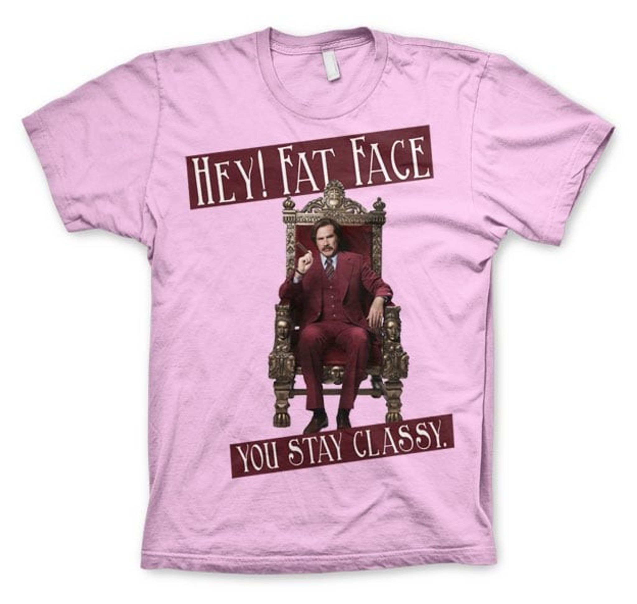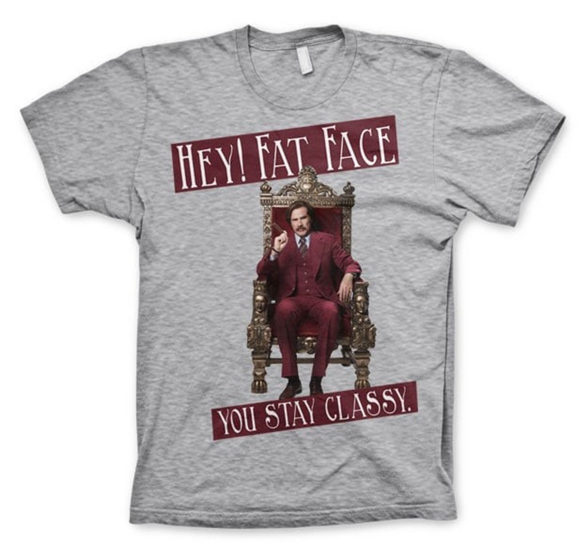 Det humoristiska motivet på Hey! Fat Face T-Shirt är en hyllning till filmen "Anchorman", med en karaktär som utstrålar en kunglig aura med sin överdådiga stol och 70-tals mustasch. En skämtsamt förolämpande fras ovanför figuren och en ikonisk uppmaning till värdighet och stil under skapar en kontrast som speglar filmens humor. Med referenser till karaktären och filmens signaturcitat blir denna design ett måste för fans av den komiska klassikern. Se till att addera lite humor till din garderob med denna unika och fängslande t-shirt!