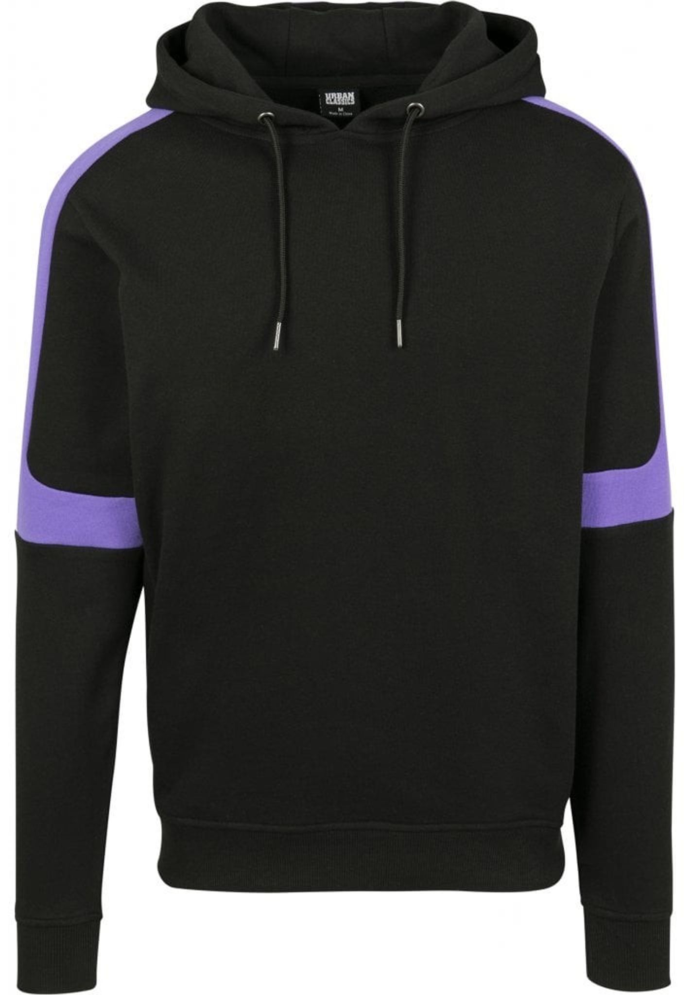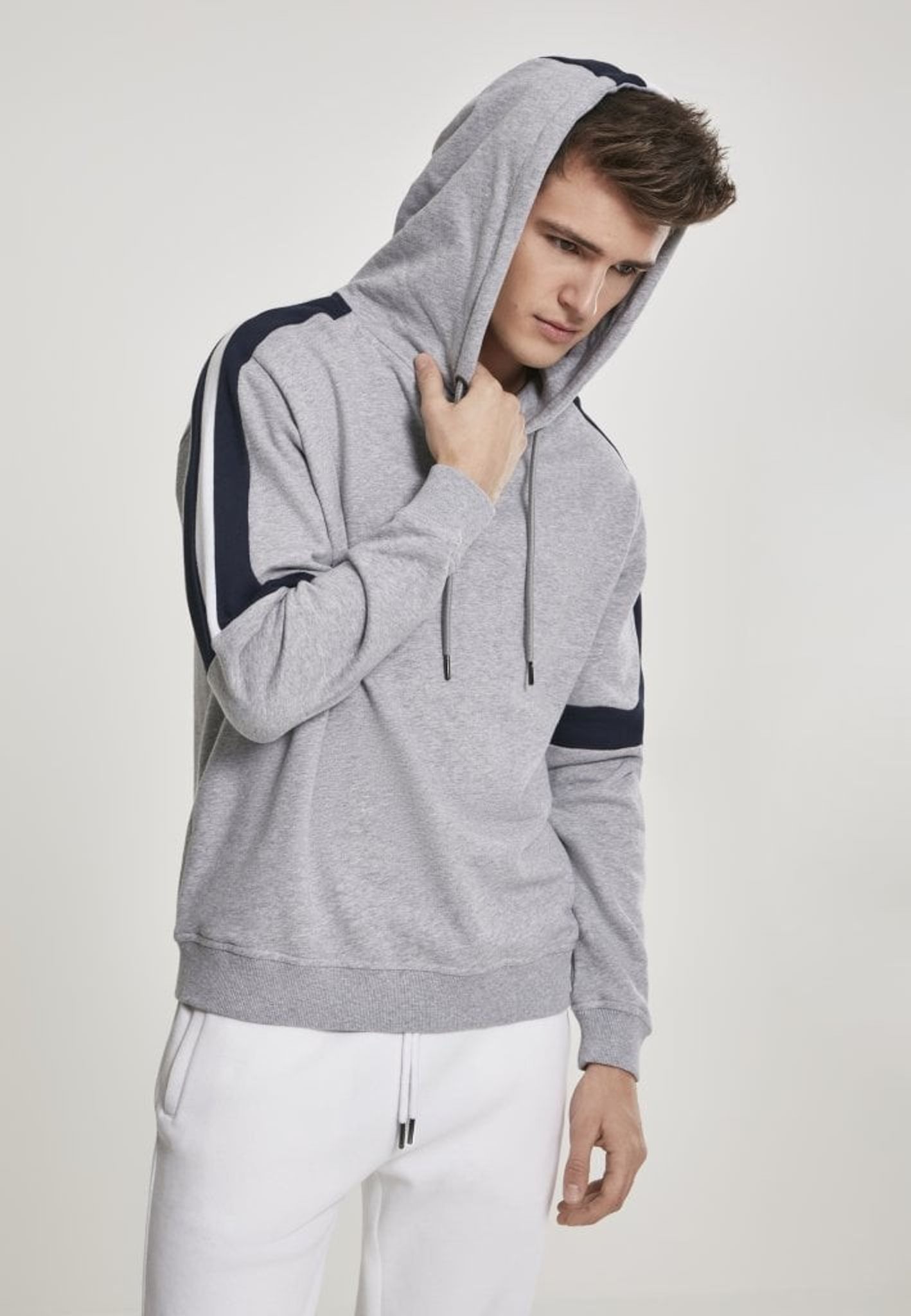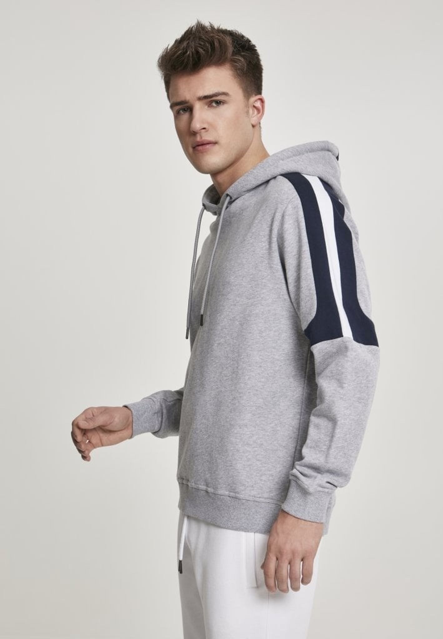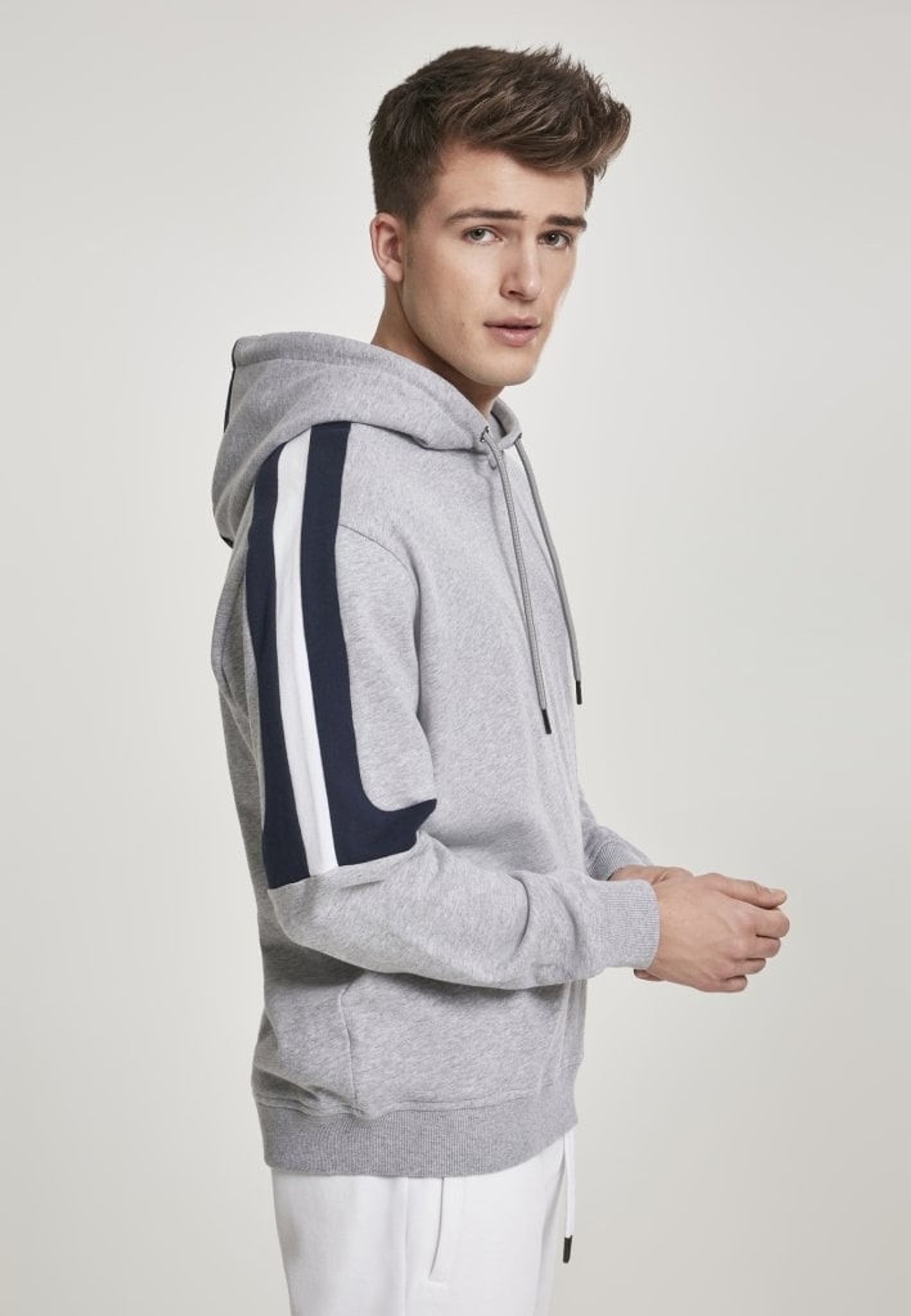 På axelpartiet och ner på halva armen är det ränder och mudd finns på armsluten och nederdelen av hoodien.