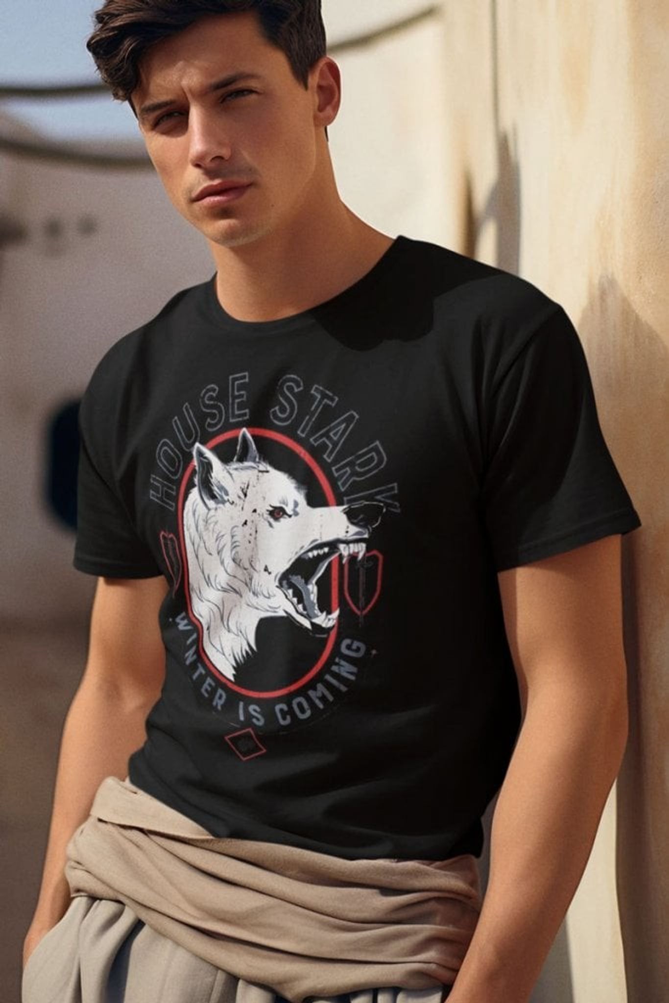 Vintern är på väg, och vilket bättre sätt att förbereda sig för de hårda vintrarna i Westeros än med denna majestätiska House Stark T-shirt? Med ett kraftfullt och skrämmande varghuvud, symbolen för House Stark, utstrålar denna design styrka, lojalitet och en krigaranda som skulle göra till och med Jon Snow stolt.