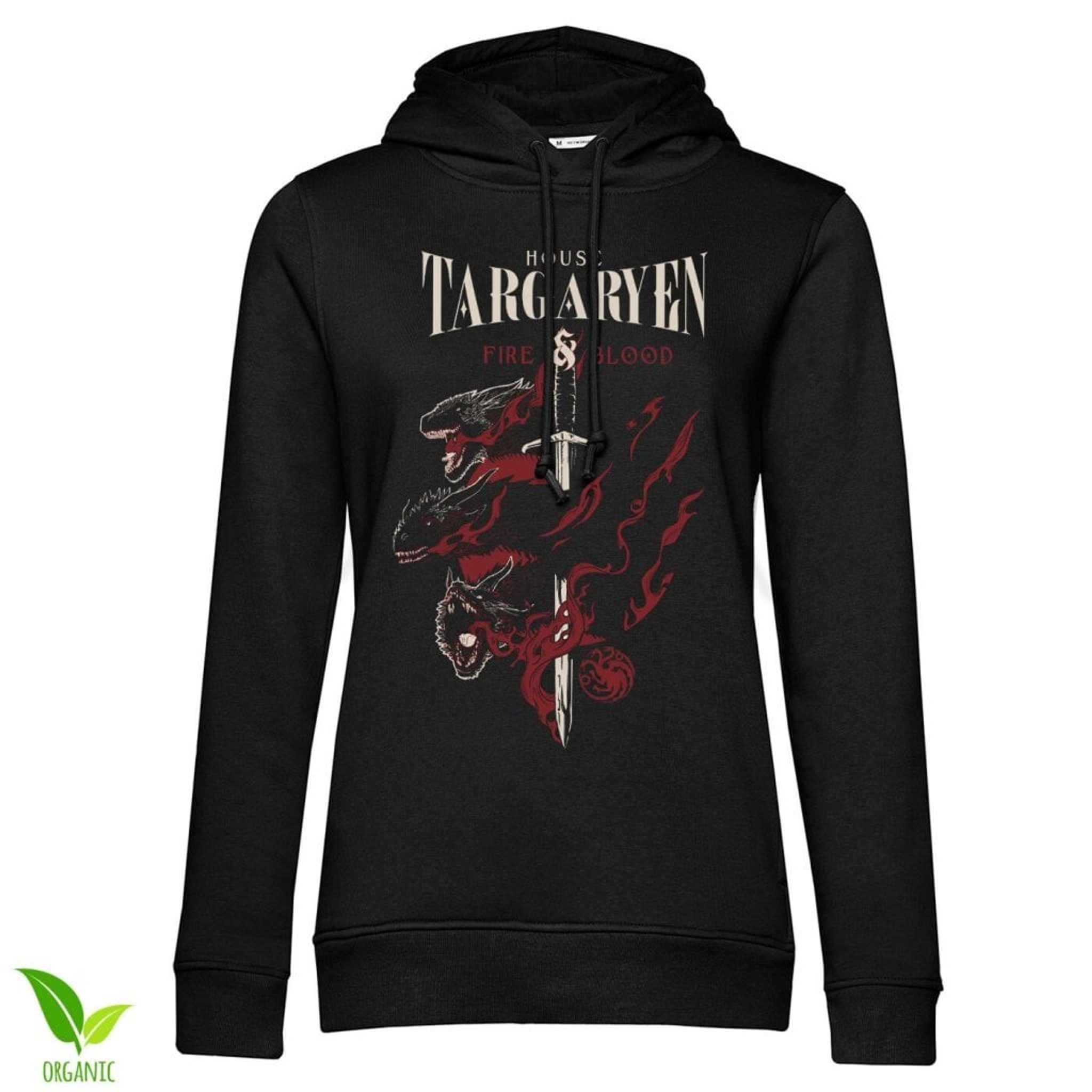 Den här Girls Hoodien är inte bara en vanlig tröja - den är en symbol för styrka, passion och eld! Med motivet av de tre svarta drakhuvudena som reser sig runt ett svärd, känner du dig redo att erövra världen - eller åtminstone värma dig en kylig dag. "Fire & Blood" är inte bara ord, det är en livsstil!