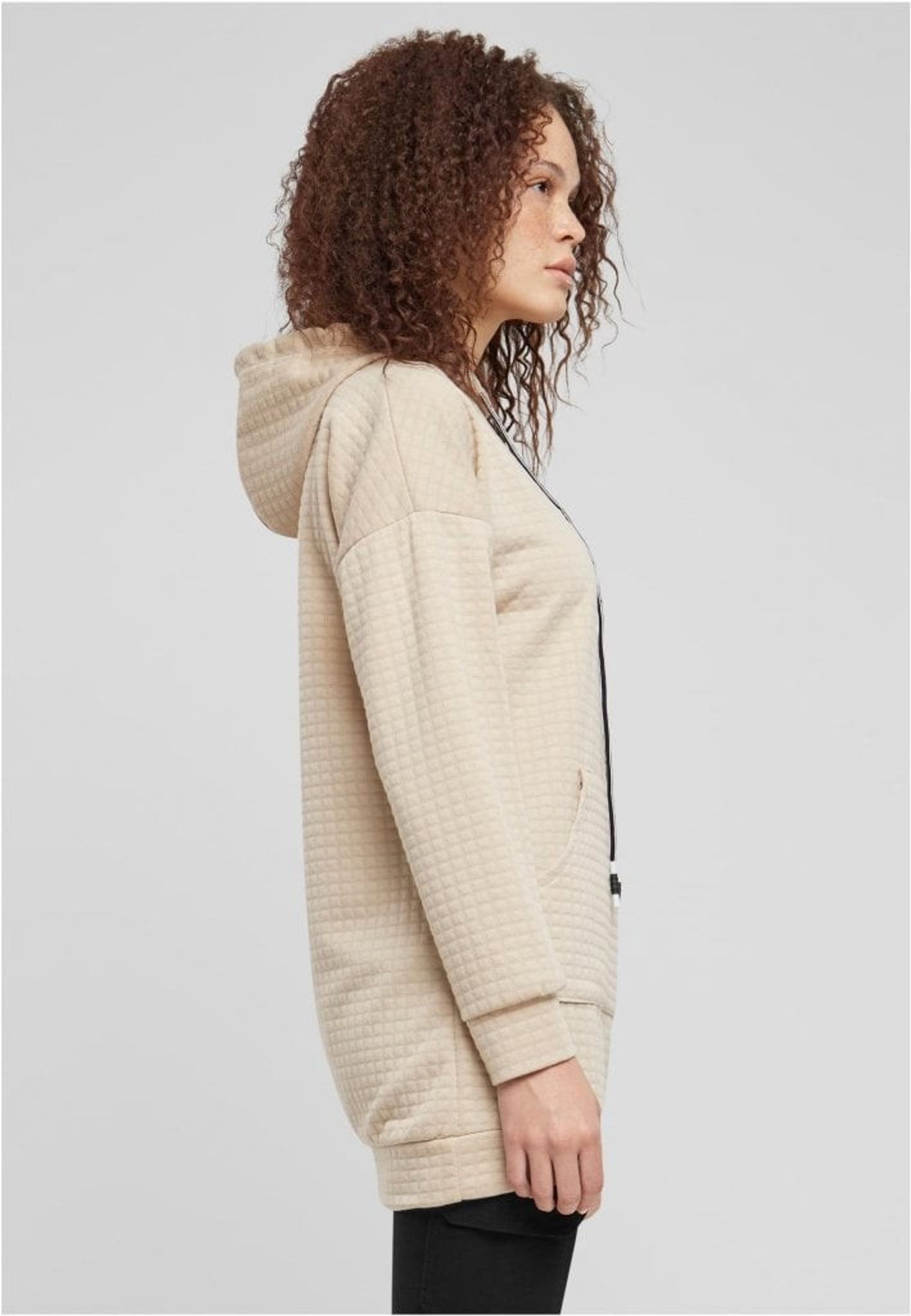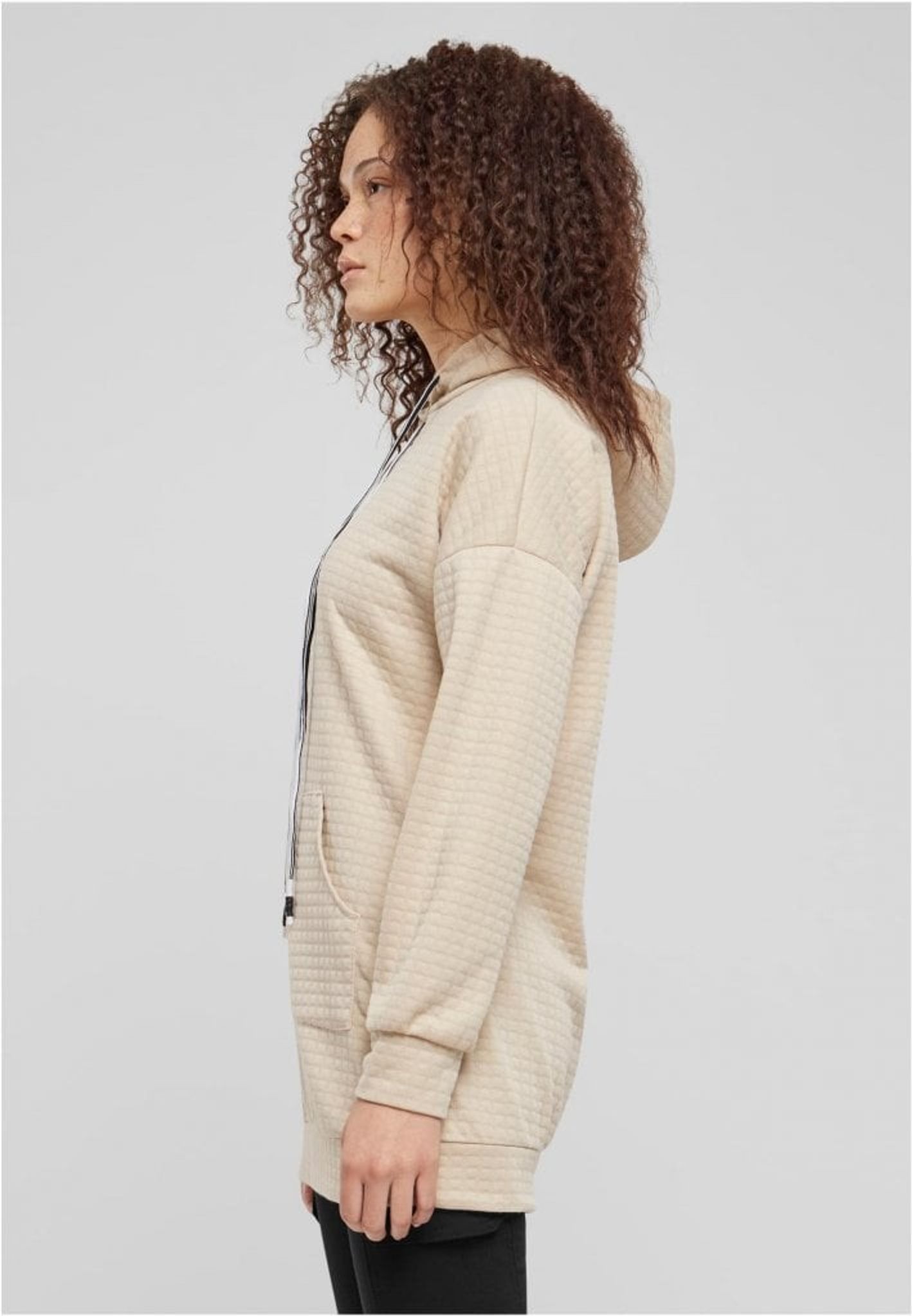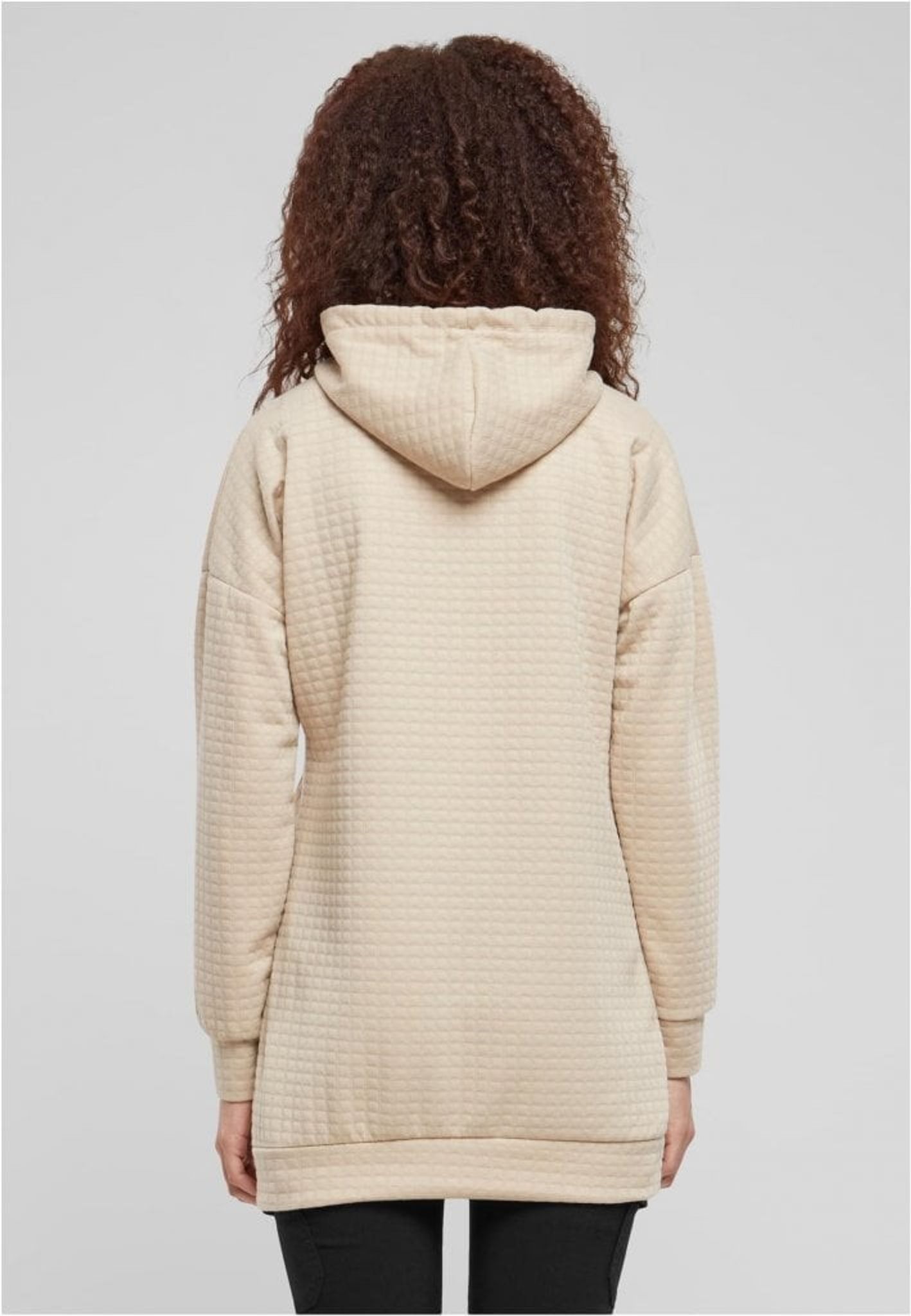 Den här huvtröjan har en längre modell som når ner till höfterna, vilket ger bra täckning och värme under kyliga dagar. Den neutrala färgen, kanske en ljus beige eller sandfärg, är perfekt att kombinera med andra klädesplagg.