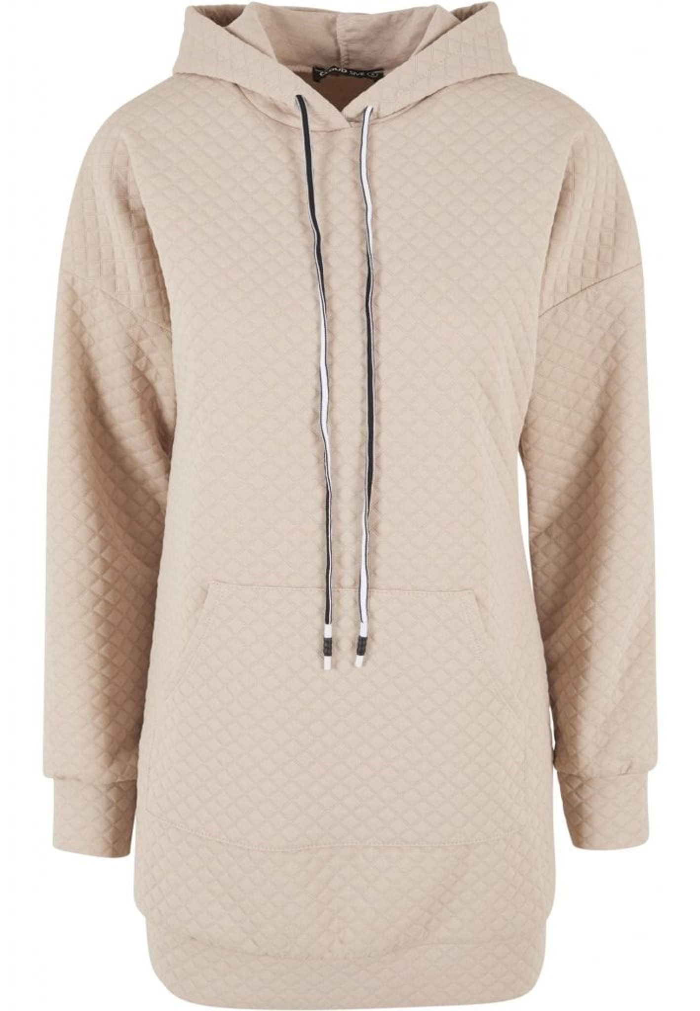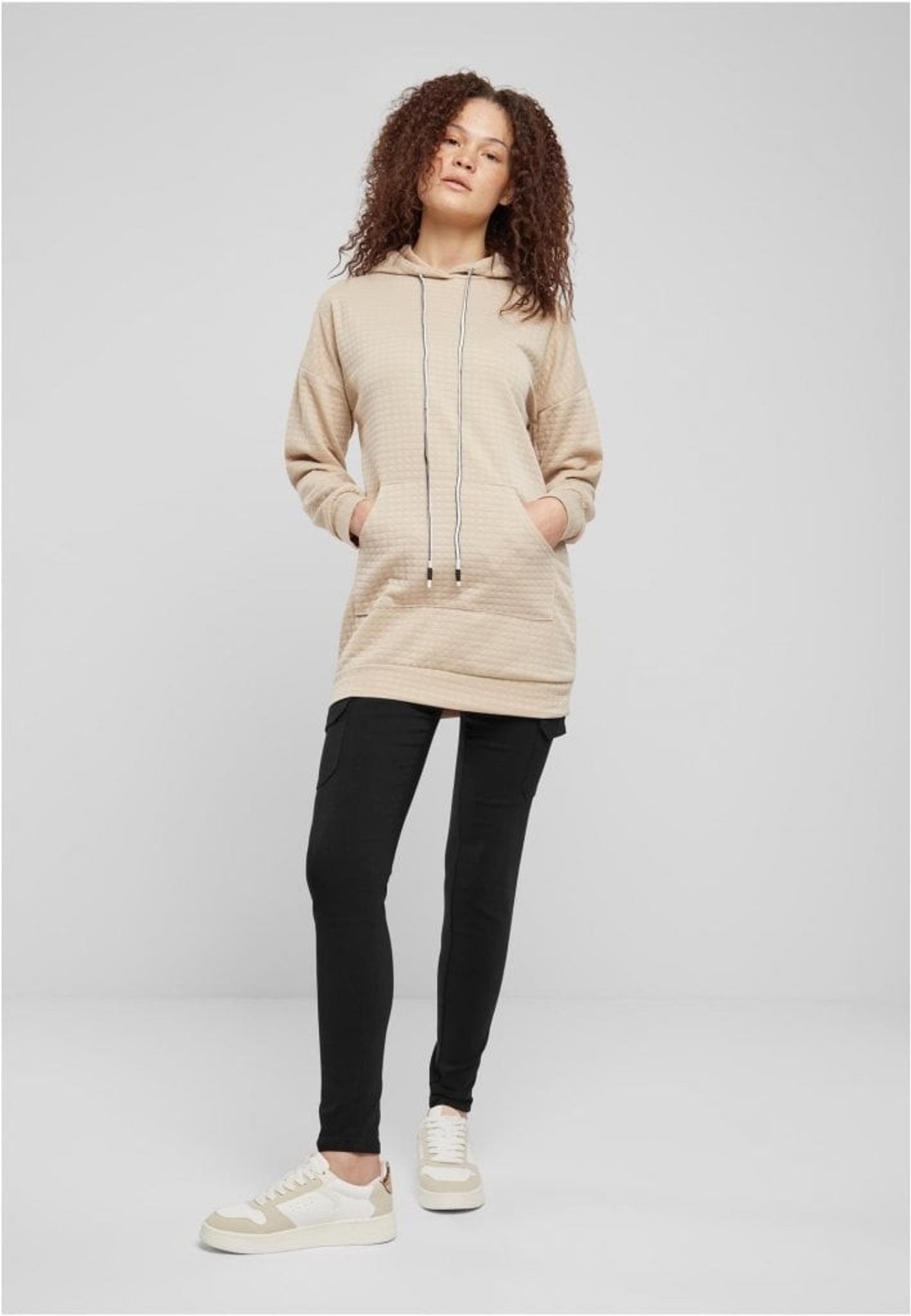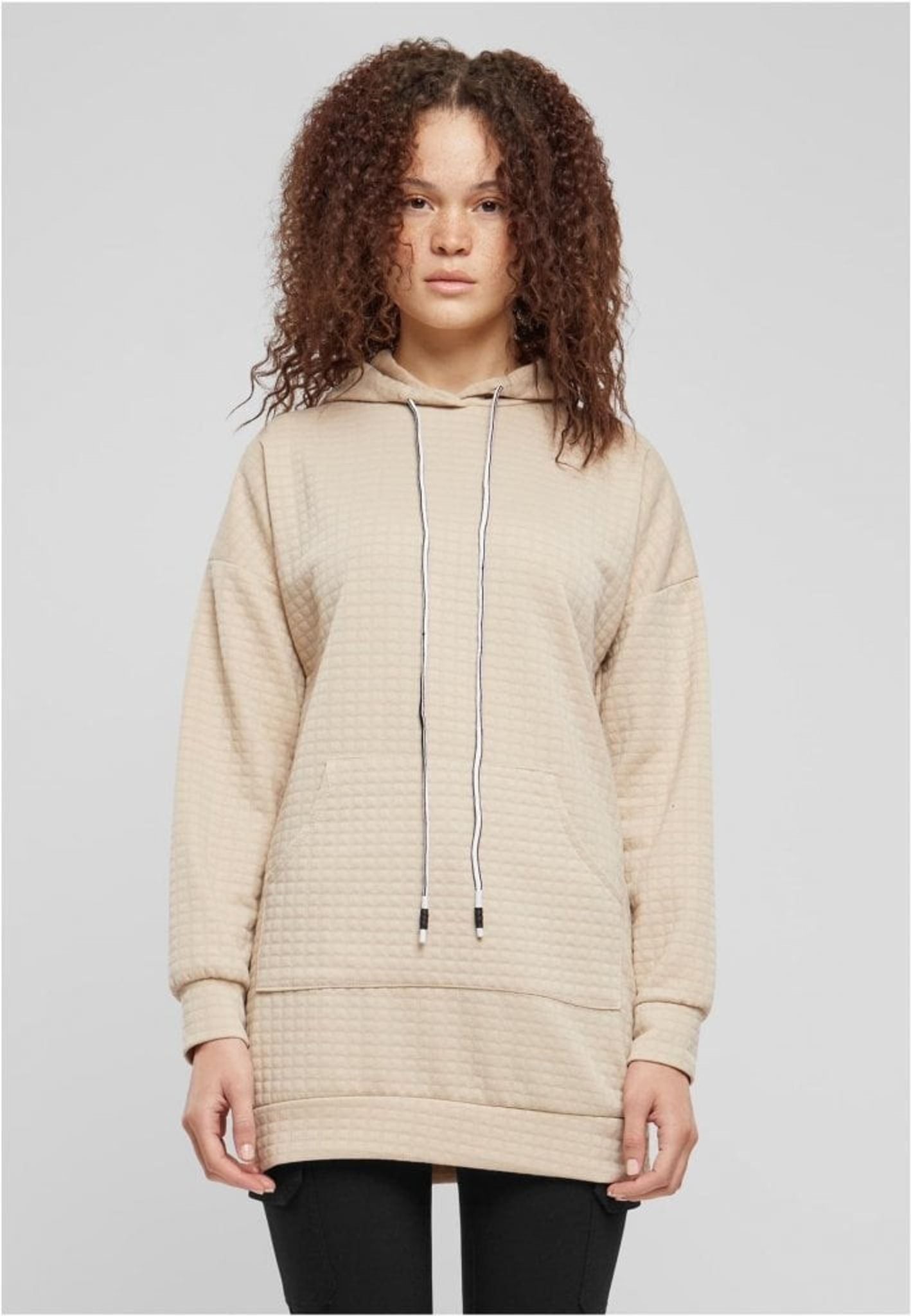 Den här huvtröjan har en längre modell som når ner till höfterna, vilket ger bra täckning och värme under kyliga dagar. Den neutrala färgen, kanske en ljus beige eller sandfärg, är perfekt att kombinera med andra klädesplagg.