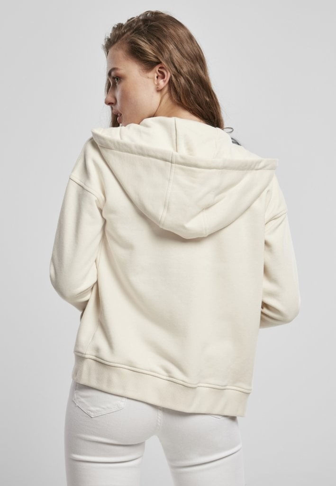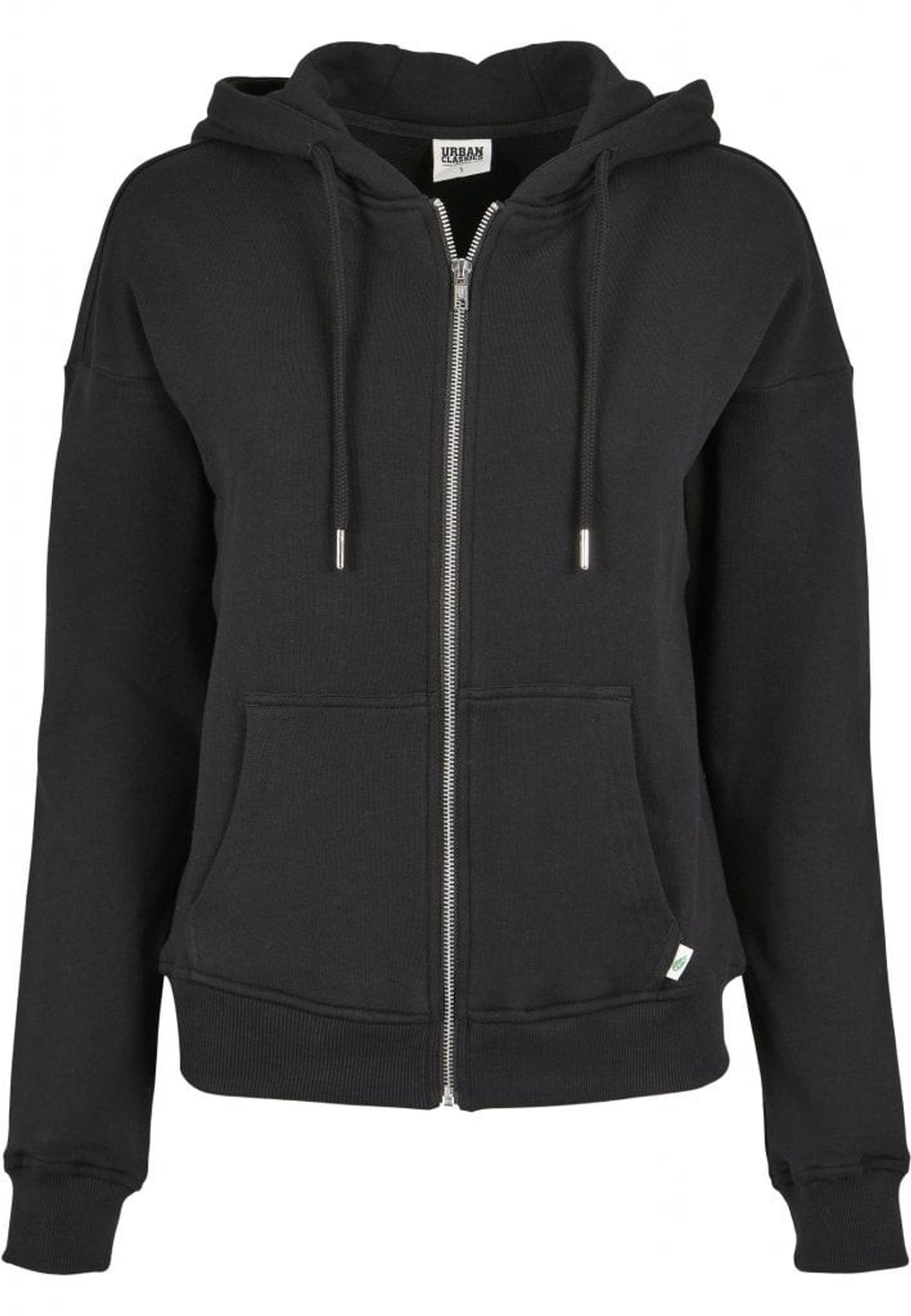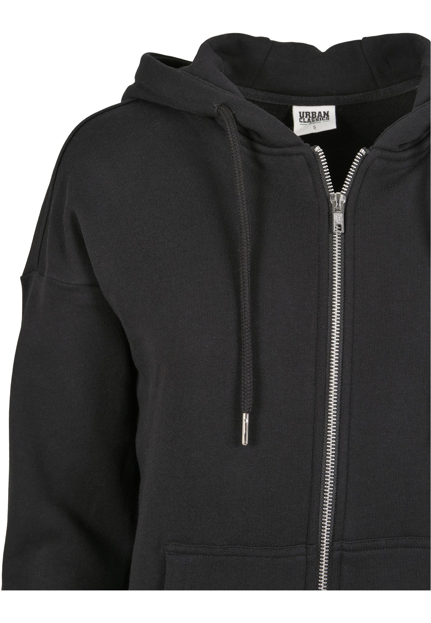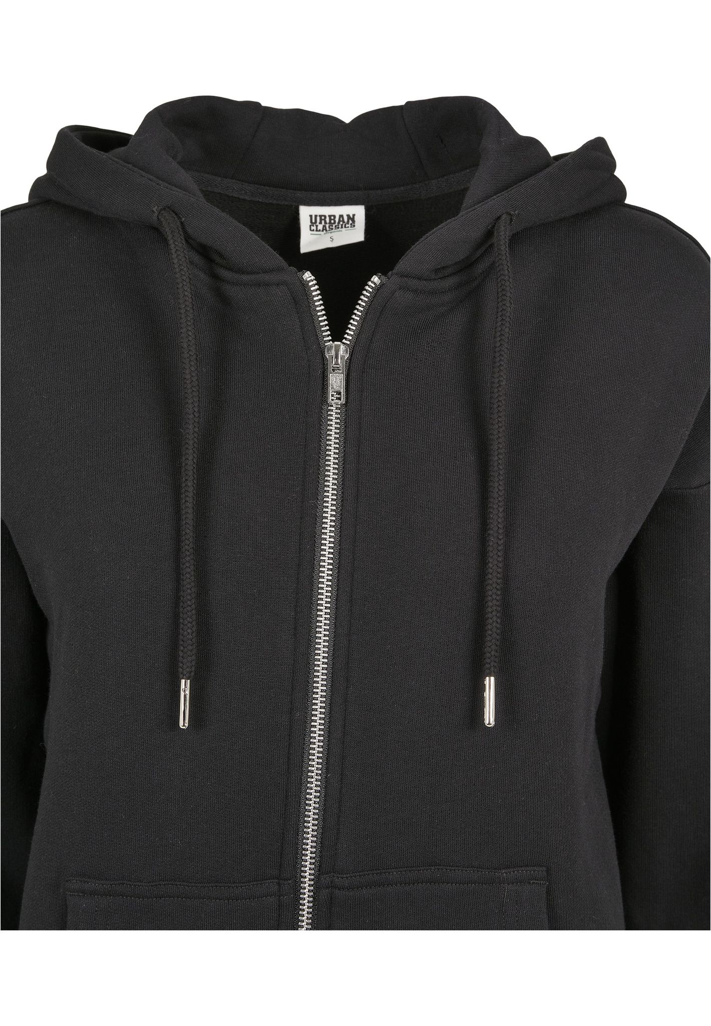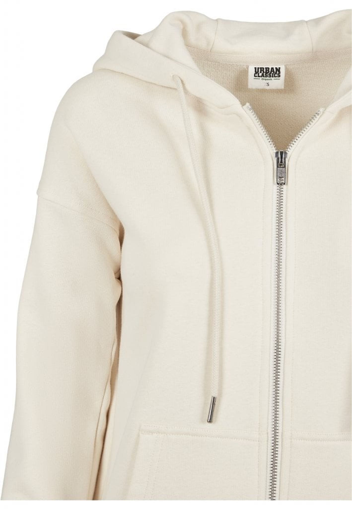 Nertill har denna tröjjacka en bred mudd och huvan har en dragsko.