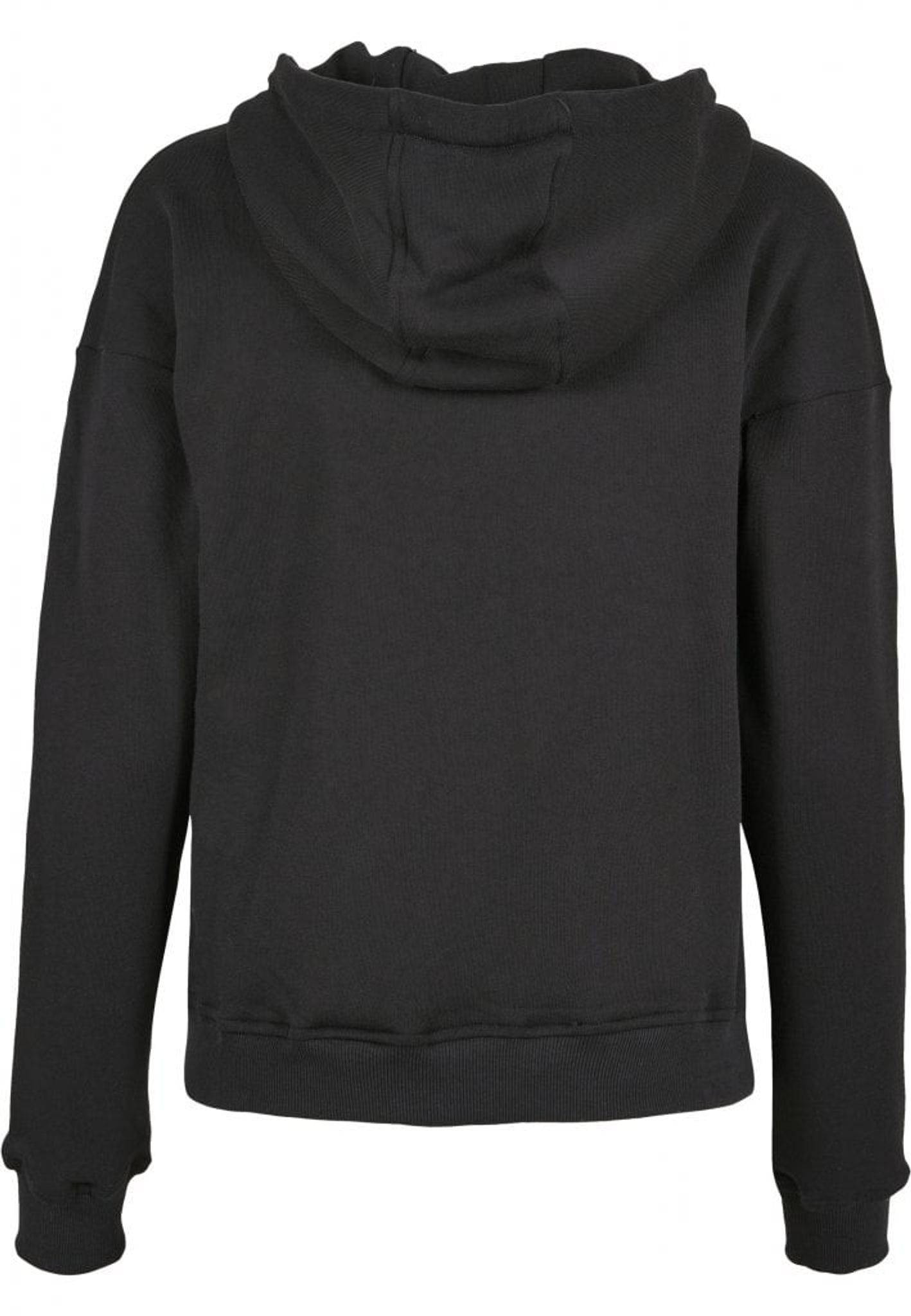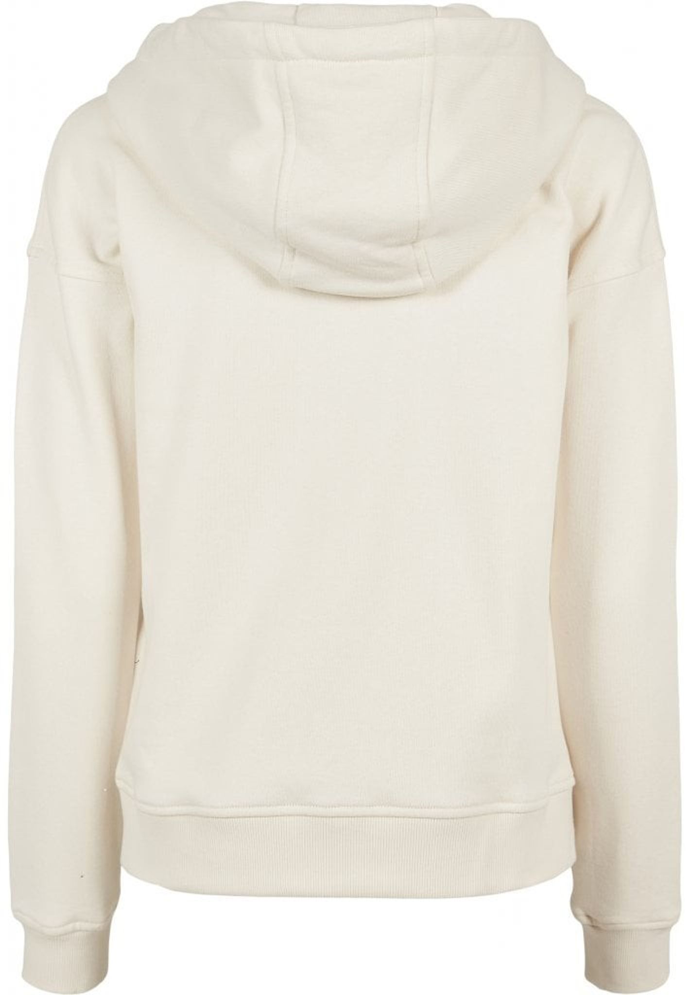 Hoodien har nedhasade armar och en bred mudd i armslutet.