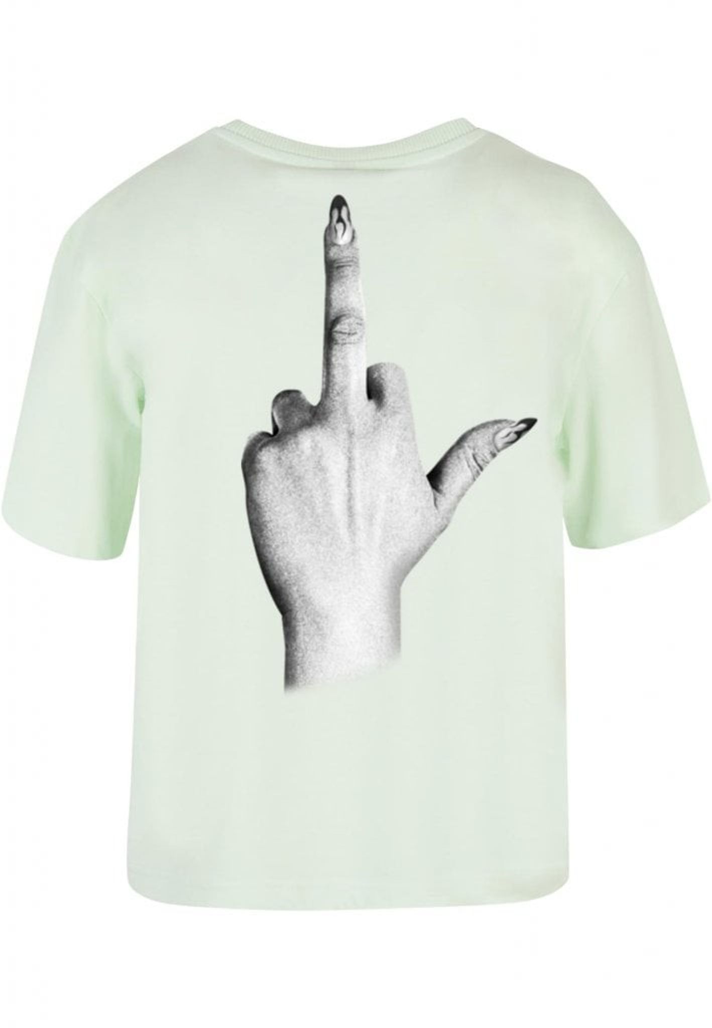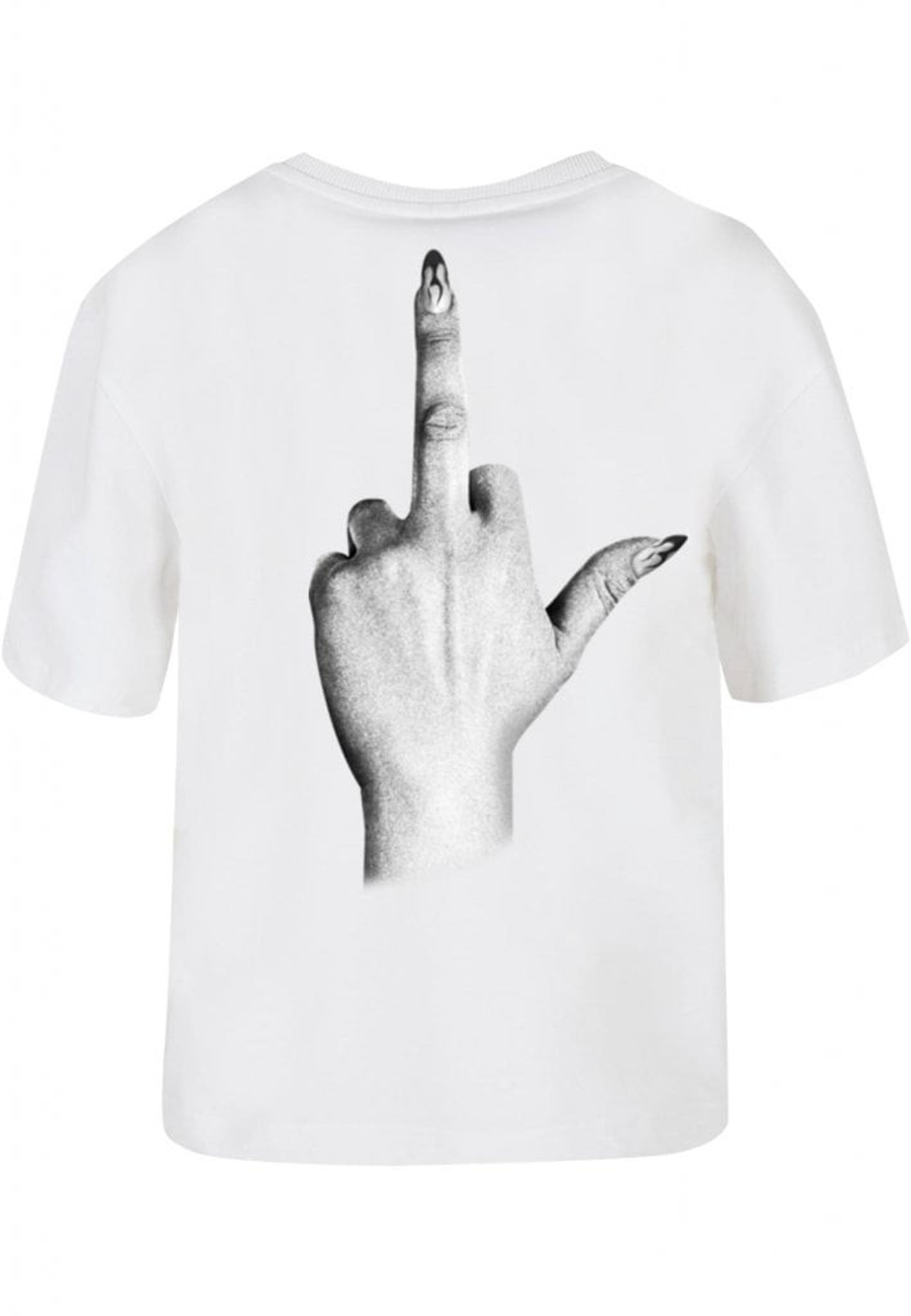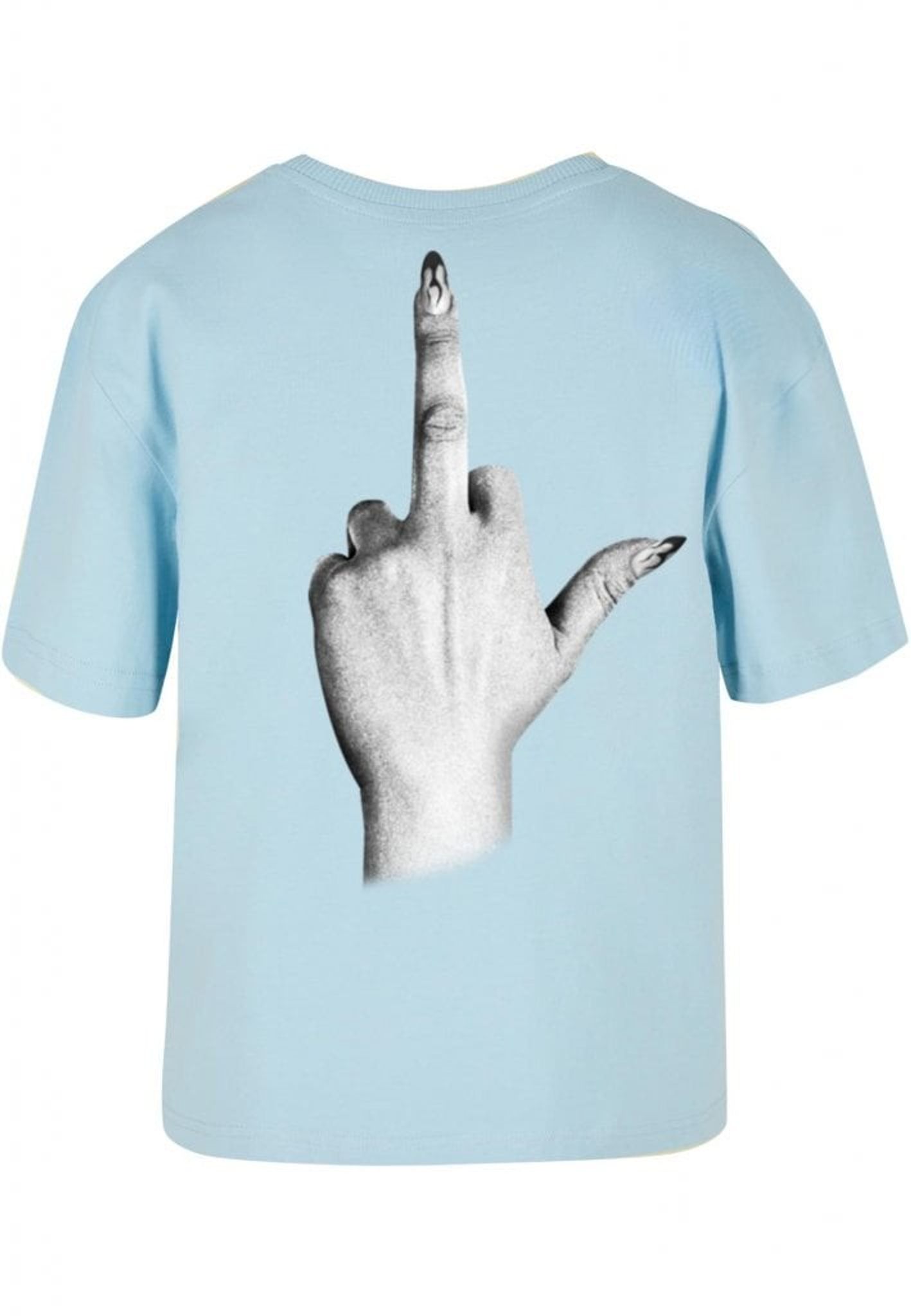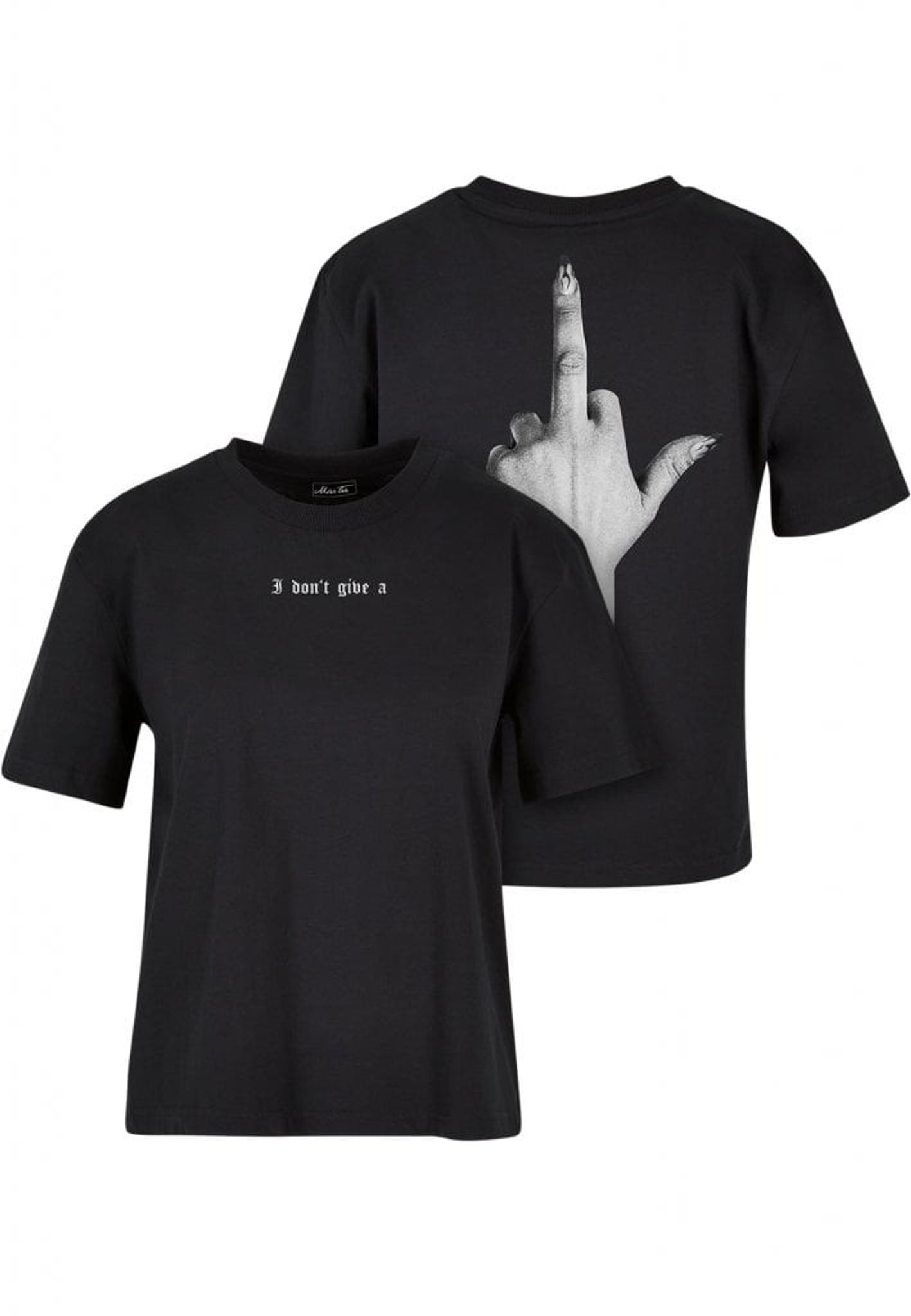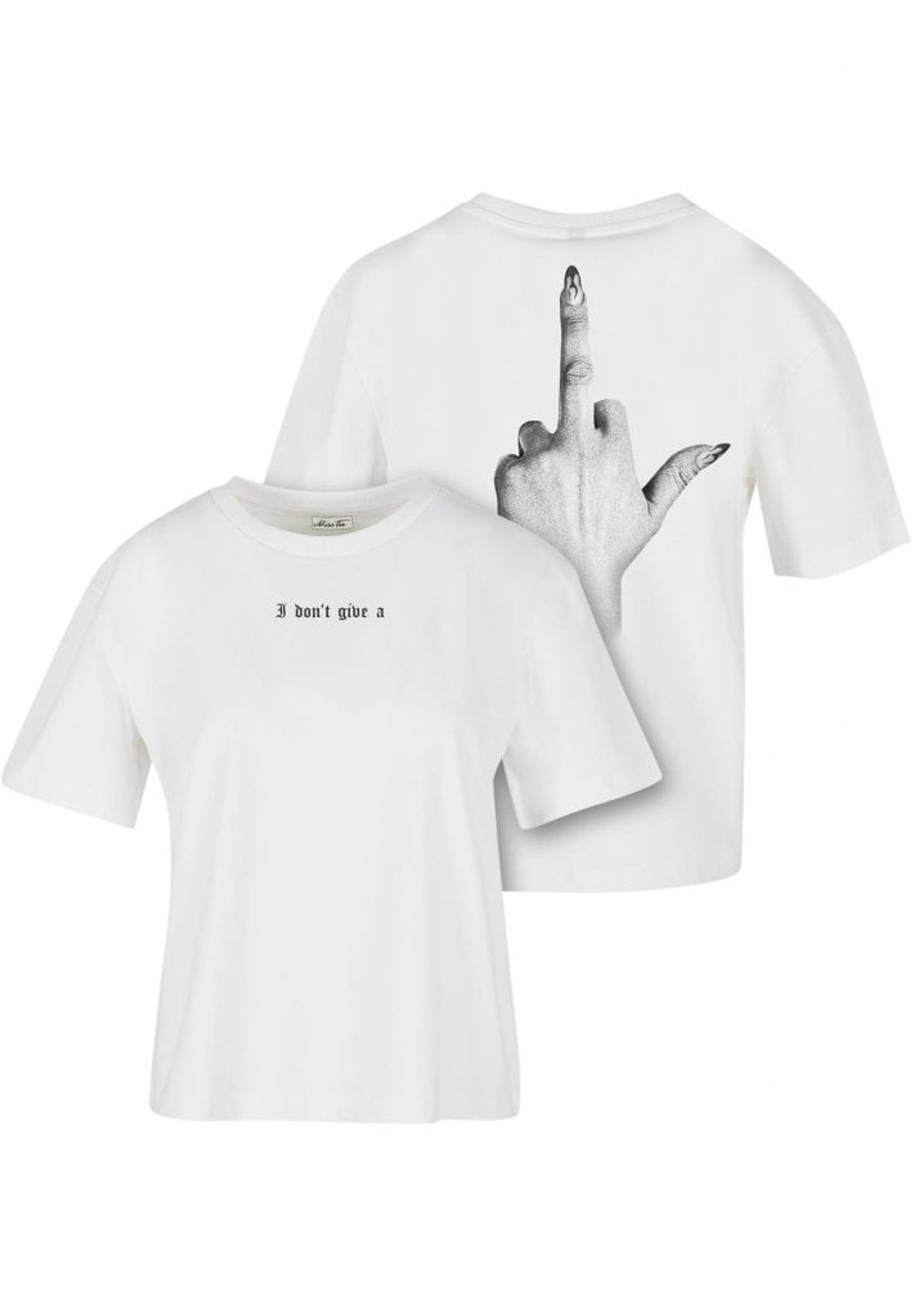 Denna t-shirt är perfekt för dig som inte bryr dig om vad andra tycker! Framsidan pryds av texten "I don't give a", medan baksidan visar en illustration av en hand som gör ett "fuck you"-tecken. Handen är elegant med långa, välmanikyrerade naglar som ger en extra touch av attityd.