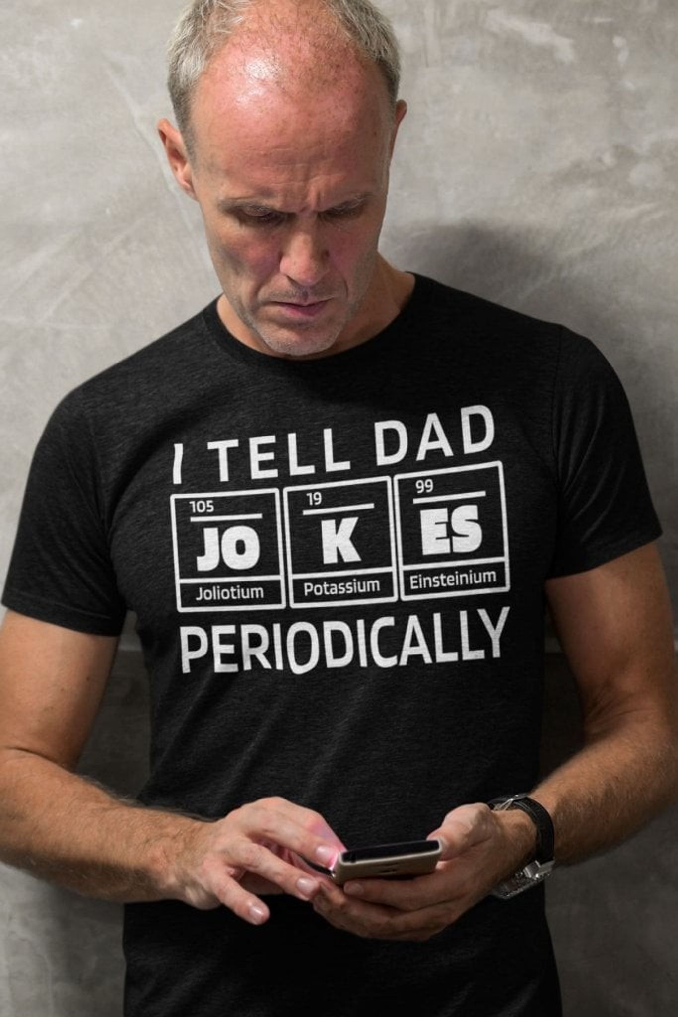 Denna T-shirt är en sann pärla för alla pappor som älskar att skämta! T-shirten är svart och har en rolig text på framsidan som lyder: "I TELL DAD JOKES PERIODICALLY". Texten är uppdelad på ett fyndigt sätt som liknar det periodiska systemet, där bokstäverna "J", "O", "K", "E", "S" representeras som grundämnen med tillhörande kemiska symboler: Joliotium (Jo, 105), Kalium (K, 19), och Einsteinium (Es, 99).