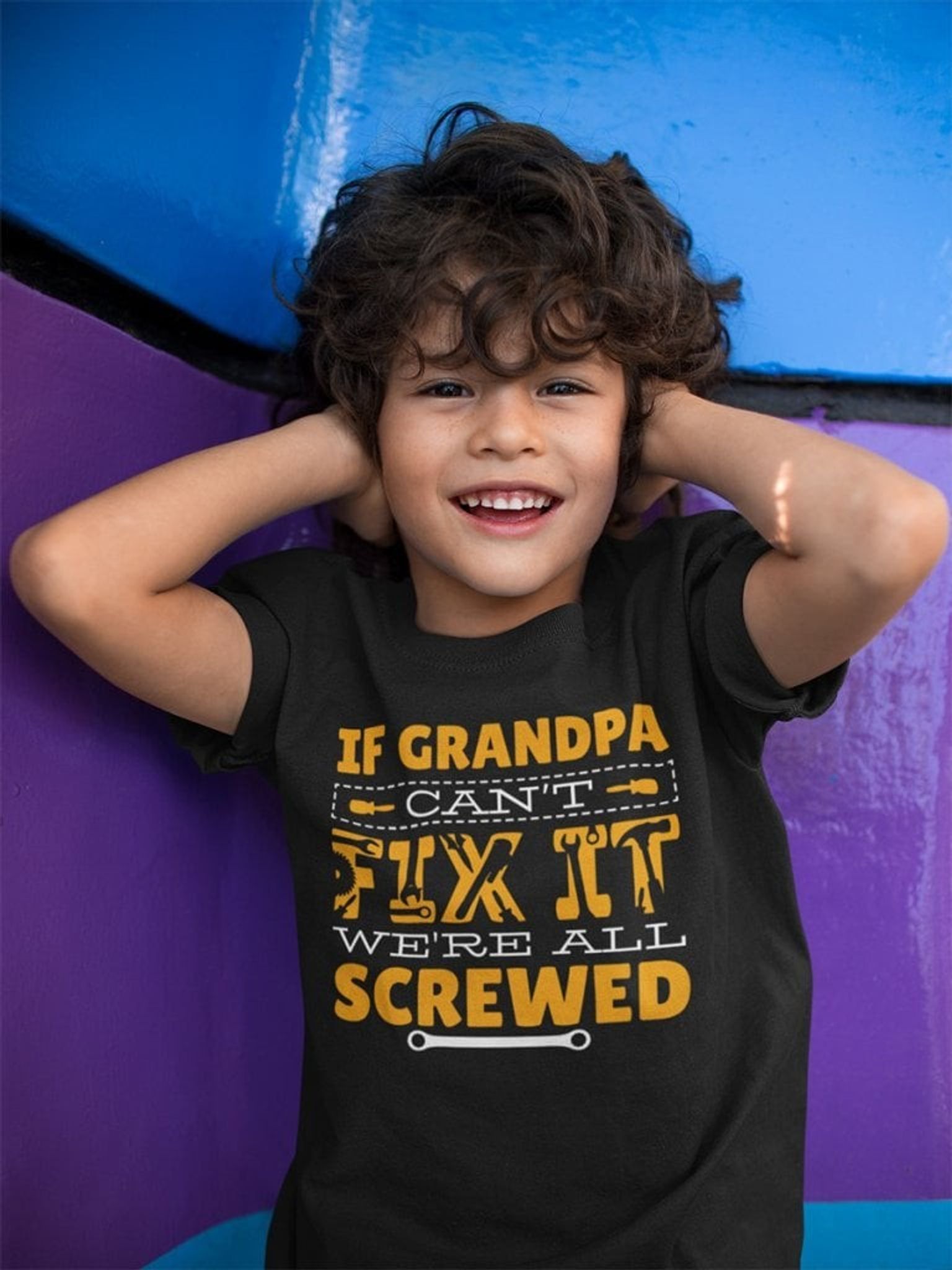 Denna svarta T-shirt är en hyllning till alla makalösa mor och farfädrar där ute, med ett humoristiskt tryck som förklarar: "If GRANDPA Can't FIX IT, We're All SCREWED". Den är en rolig nick till den klassiska bilden av farfar som familjens allkunniga fixare. Den som bär denna T-shirt erkänner stolt att när det gäller hemmareparationer, är det morfar som är hjälten med verktygslådan.
