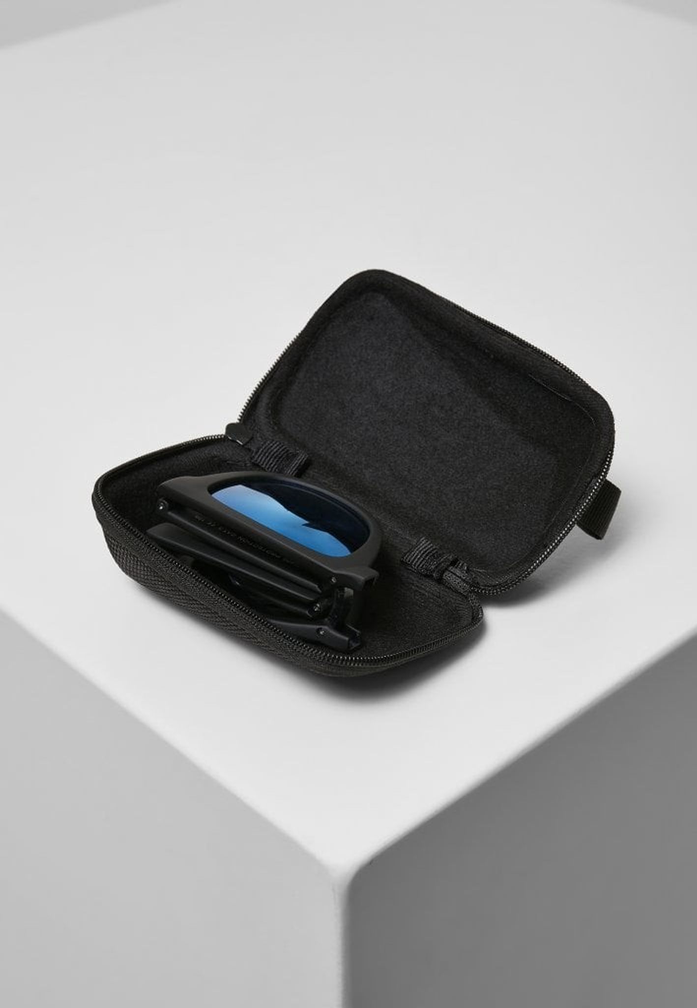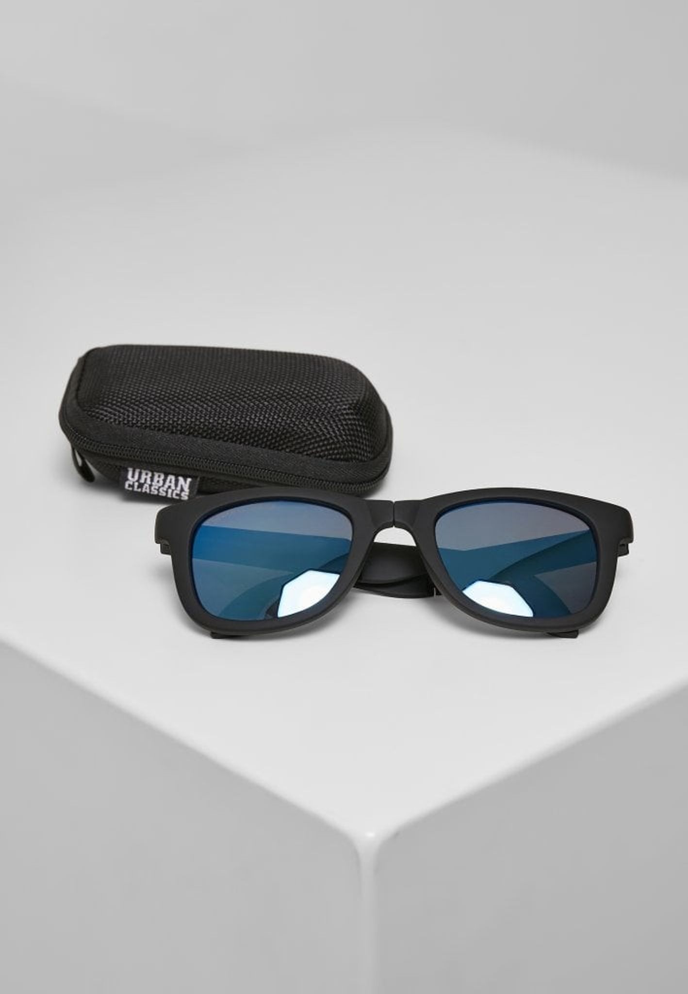 Dessa solglasögon kan fällas ihop på mitten och läggas i ett fodral med dragkedja.