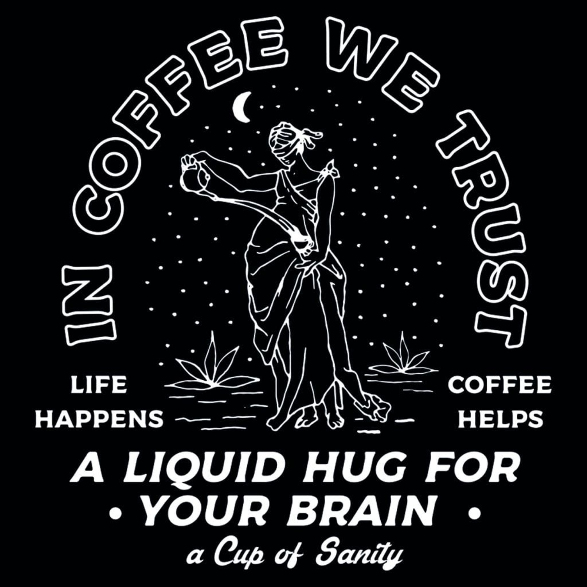 För den hängivna kaffeälskaren kommer denna svarta T-shirt med en uppiggande twist: "IN COFFEE WE TRUST. A LIQUID HUG FOR YOUR BRAIN - A Cup of Sanity". Den är det perfekta plagget för alla som förlitar sig på kaffets kraft att göra livets utmaningar lite mer hanterbara. Med en design som lika mycket är en deklaration som ett modeuttryck, bjuder den in till en värld där det första kaffet på morgonen är heligt.