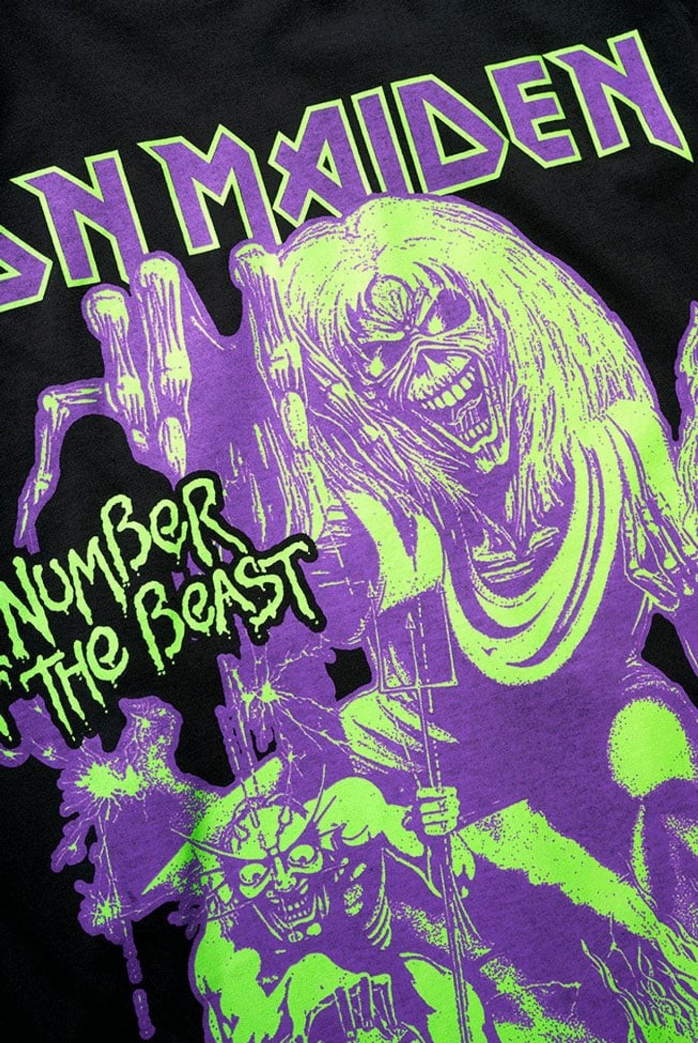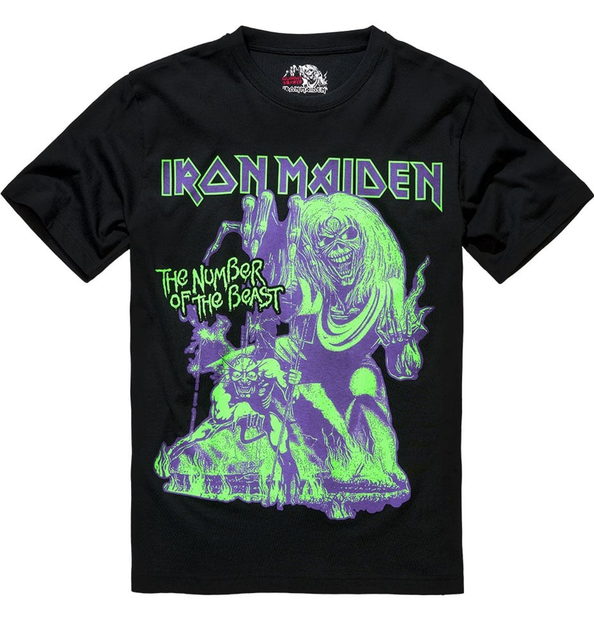 Denna officiella Iron Maiden T-shirt med motivet "Number of the Beast" är ett måste för alla fans av den legendariska heavy metal-gruppen. Med ett stort och djärvt "NOTB" print i neongrönt och lila ger denna T-shirt en unik och autentisk stil.