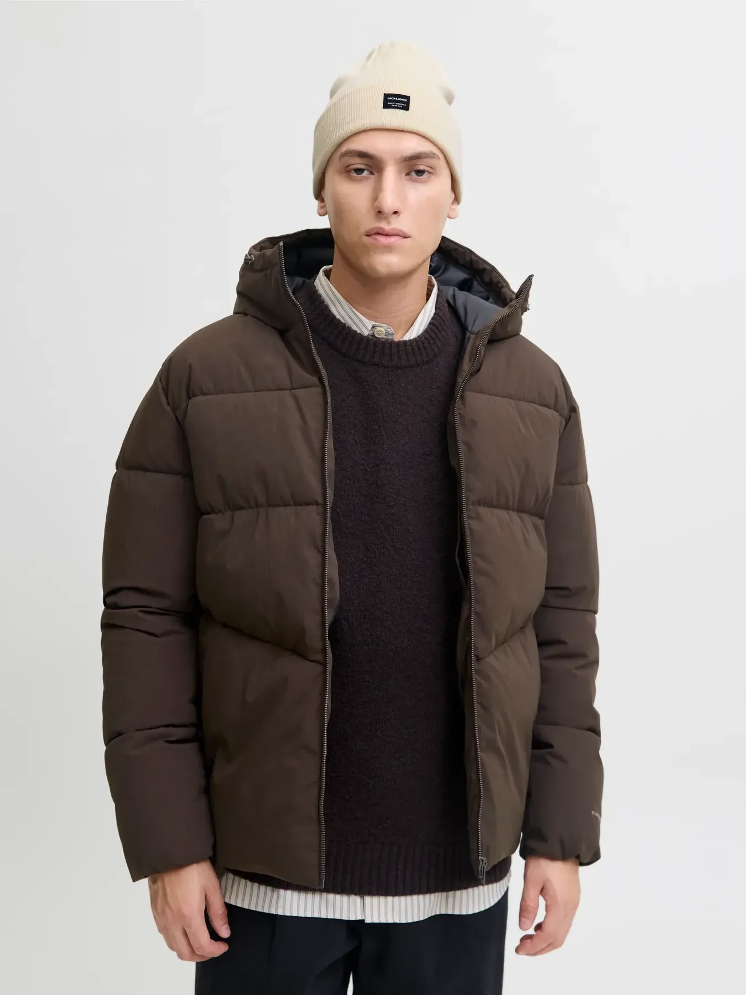 Denna naturvita ribbstickade mössa från Jack & Jones är ett stilrent och funktionellt tillskott till höst- och vintergarderoben. Den är tillverkad i ett mjukt och följsamt material som både andas och håller värmen under kyligare dagar. Den breda uppvikta kanten ger en bekväm passform och pryds av en diskret vävd etikett framtill som tillför en modern detalj.