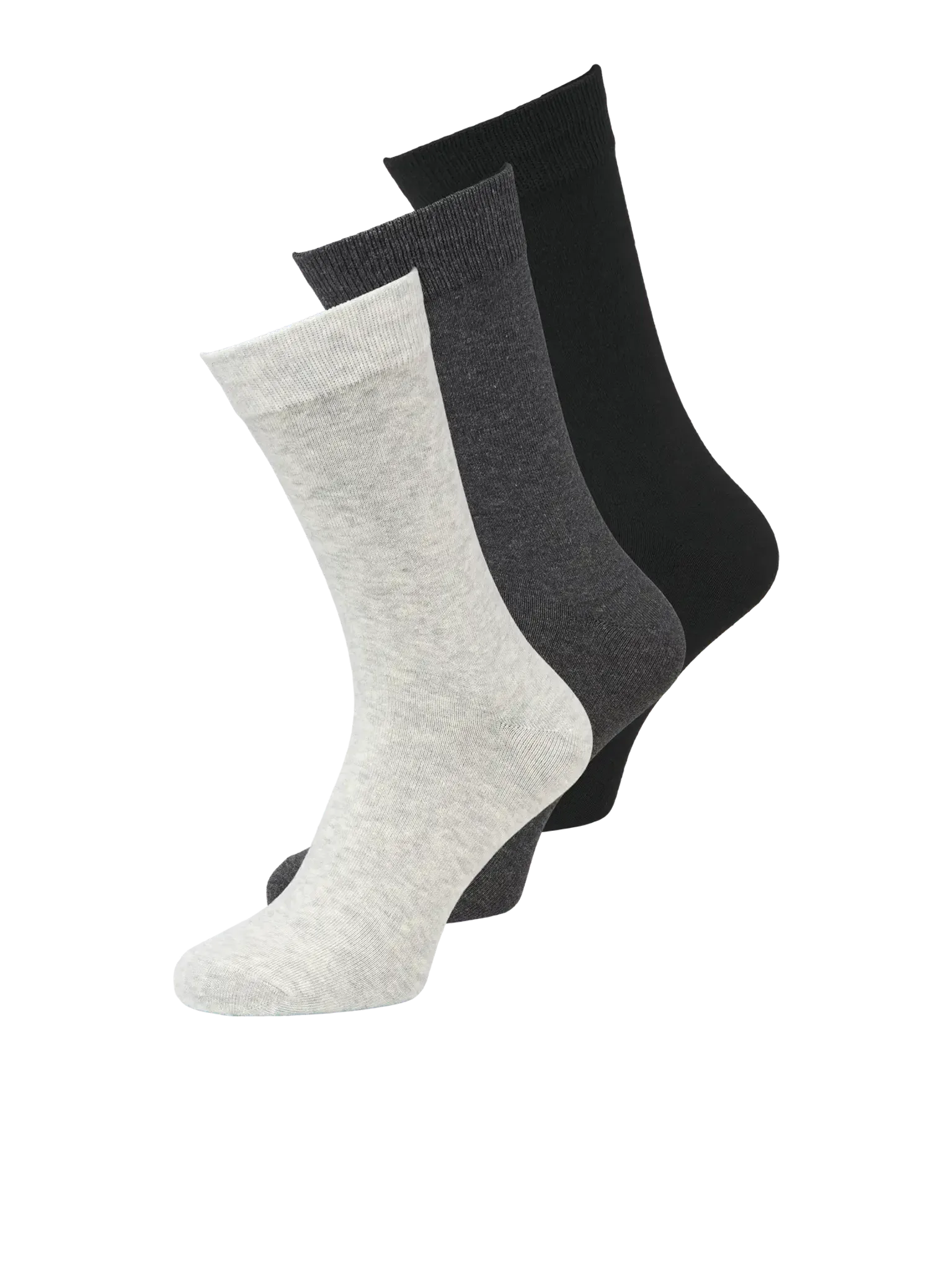 Dessa strumpor i 3-pack kommer i en stilren färgmix med svart, mörkgrå och ljusgrå – perfekta för både vardag och arbete. De är tillverkade i ett mjukt, elastiskt och ventilerande material som gör dem bekväma att bära hela dagen. Den ribbade skaften ger en säker passform och håller strumporna på plats utan att strama.