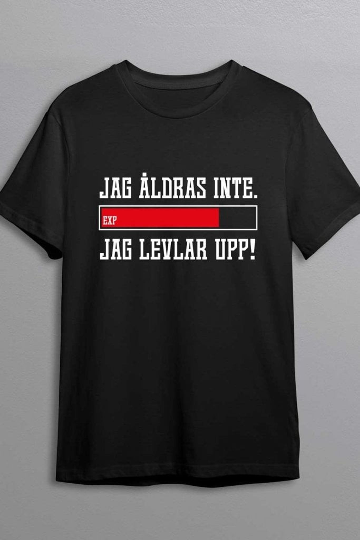 Denna svarta T-shirt är för alla som ser livet som ett stort rollspel där varje nytt år inte lägger till ålder, utan erfarenhetspoäng. Med texten "JAG ÅLDRAS INTE. JAG LEVLAR UPP!" erbjuder tröjan en humoristisk twist på konceptet att bli äldre. Den är den perfekta outfiten för gamers, fantaster av rollspel eller alla som gillar att skratta åt livets obarmhärtiga XP-grind.