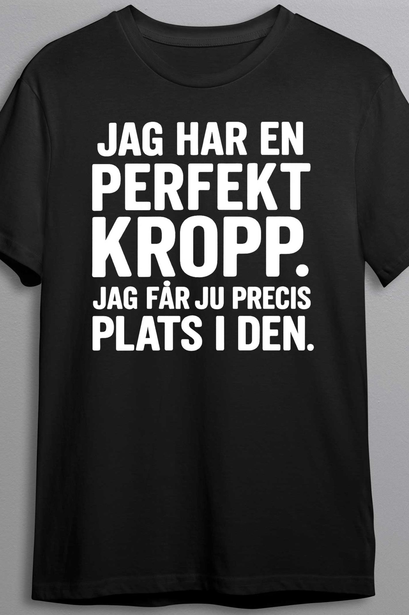 Här snackar vi självdistans på hög nivå. Den här T-shirten är för alla som tröttnat på kroppsideal och istället vill lyfta fram den enda sanningen som faktiskt spelar någon roll: kroppen är perfekt – för du får ju plats i den!