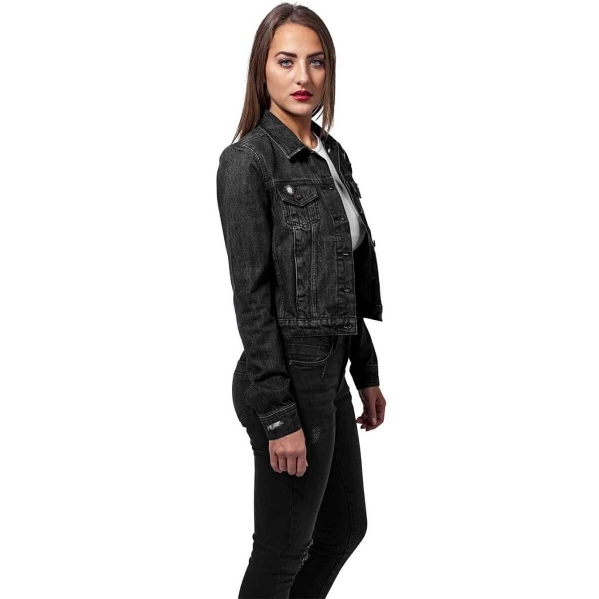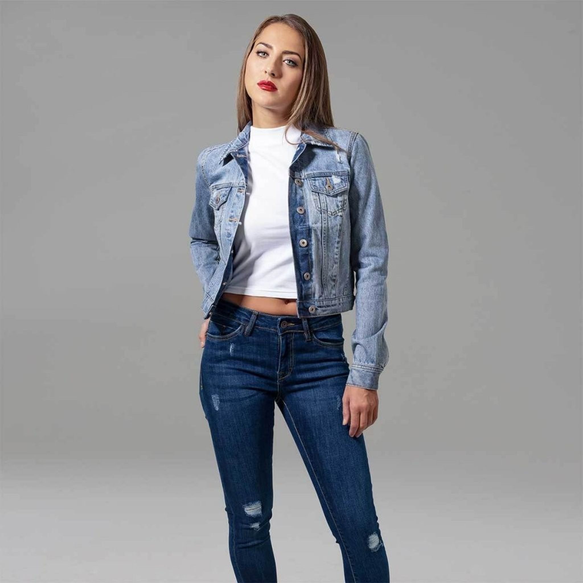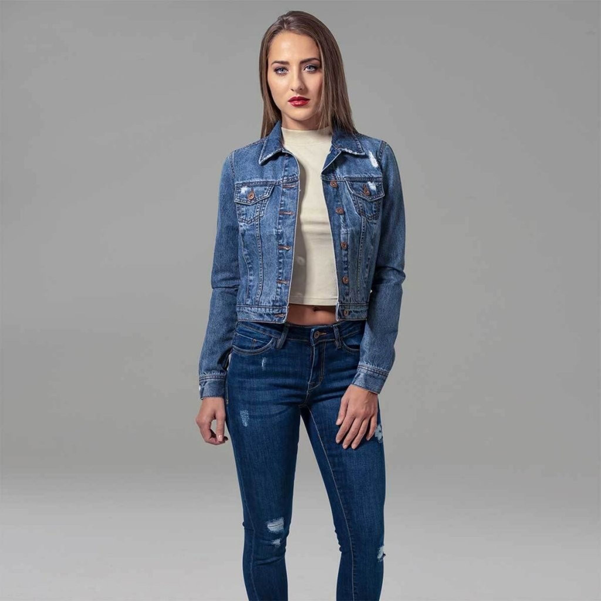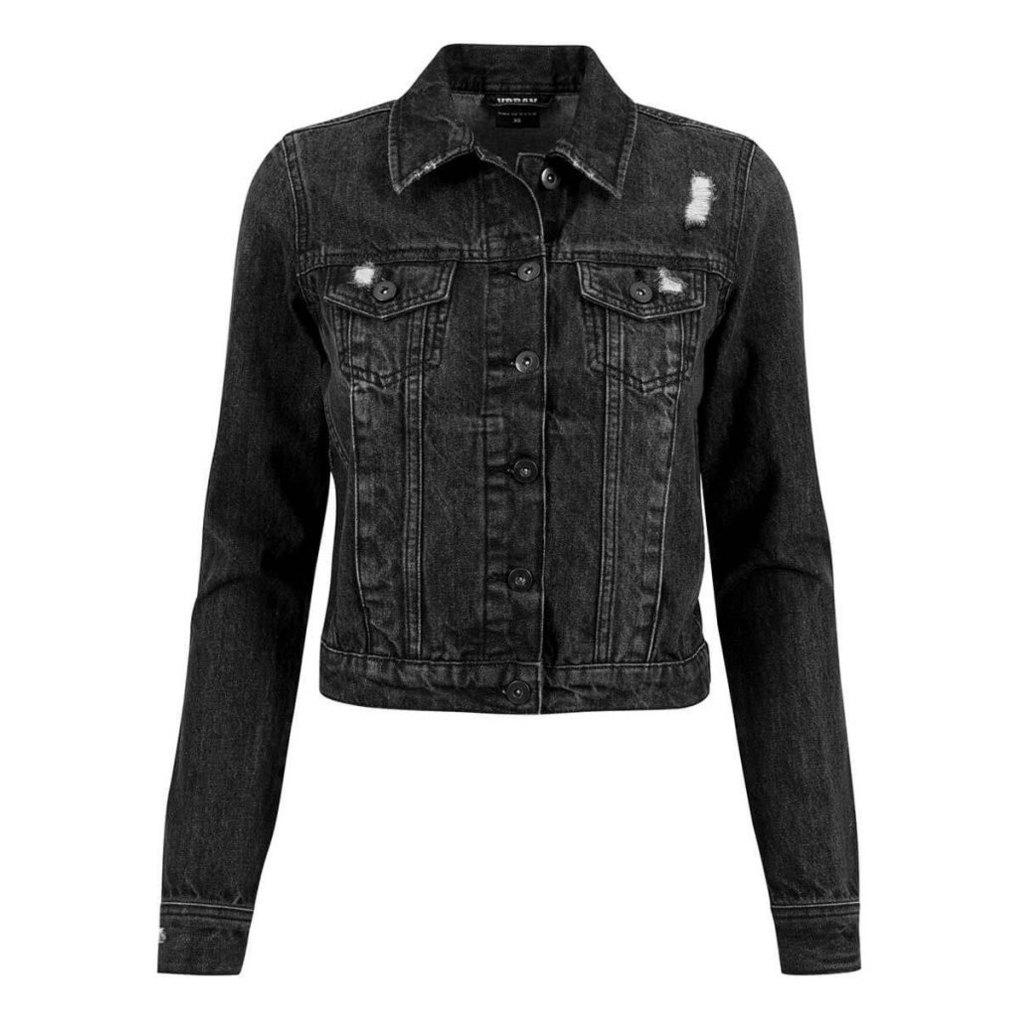 Jeansjackor är inne och här har du en riktigt snygg jeansjacka i dammodell med slitningar och två fickor fram.