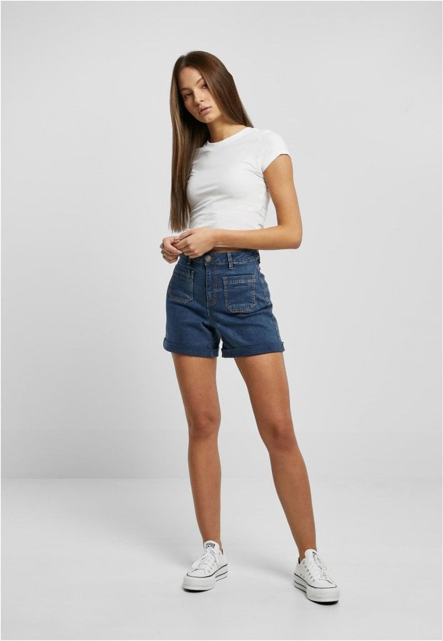 Jeansshorts med hög midja för tjejer är tillverkade av stretchigt denimtyg som ger en bekväm passform. De har två söta, quiltade fickor framtill och sitter bekvämt högt på höfterna i en normal passform. Shortsens uppvikta fåll ger en fin detalj till designen.