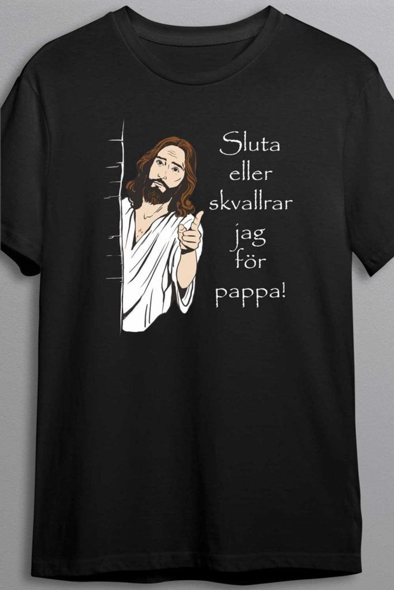 Med texten "Sluta eller skvallrar jag för pappa!" och en illustration av Jesus som pekar direkt på dig, kombinerar den lekfullhet med en liten dos allvarlig charm.