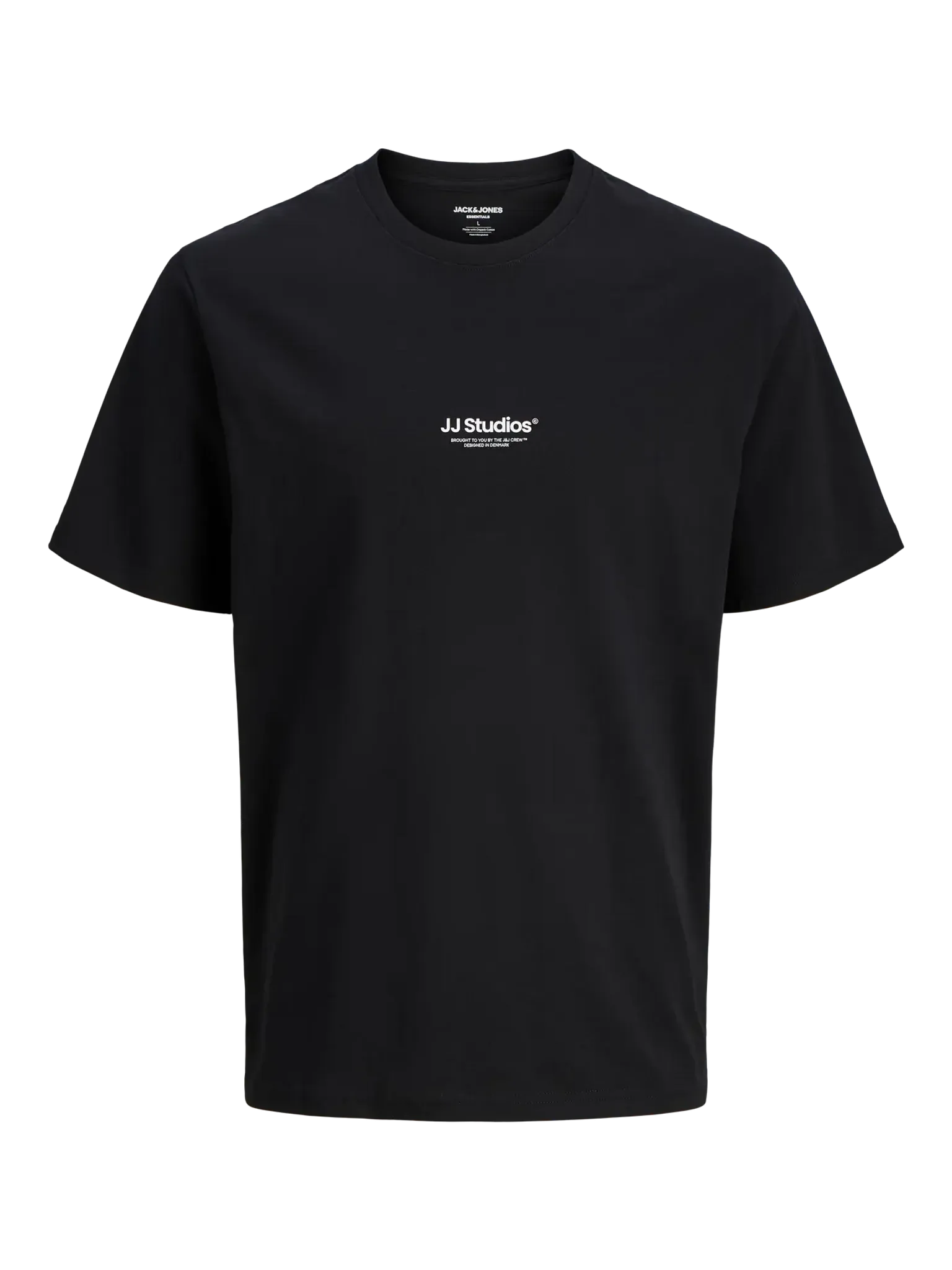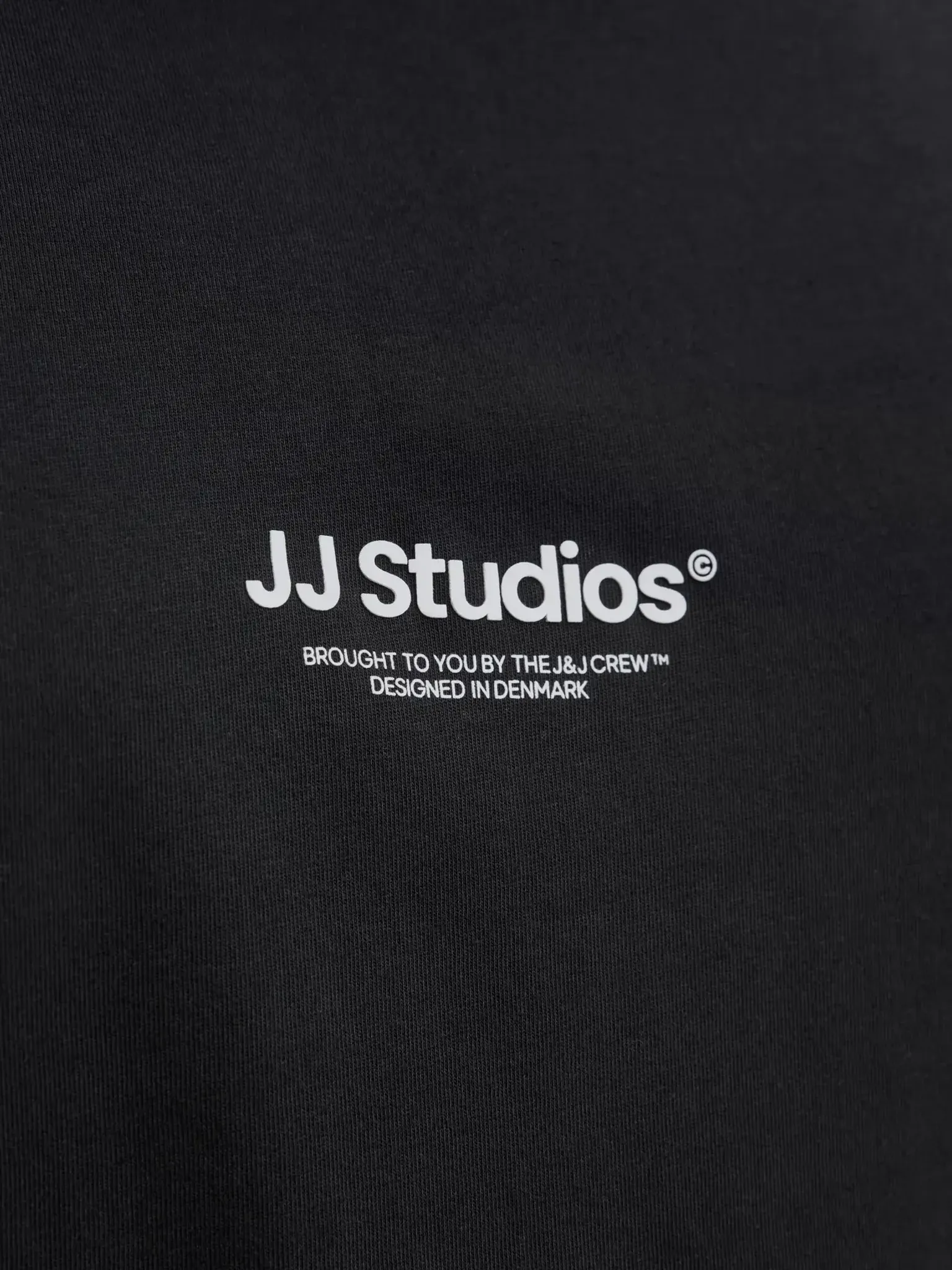 En svart T-shirt är alltid ett säkert kort i garderoben och denna variant från Jack & Jones kombinerar enkel design med hög komfort. Den minimalistiska JJ Studios-loggan på bröstet ger en modern touch utan att ta över, vilket gör tröjan lätt att bära både till vardags och mer avslappnade tillfällen.