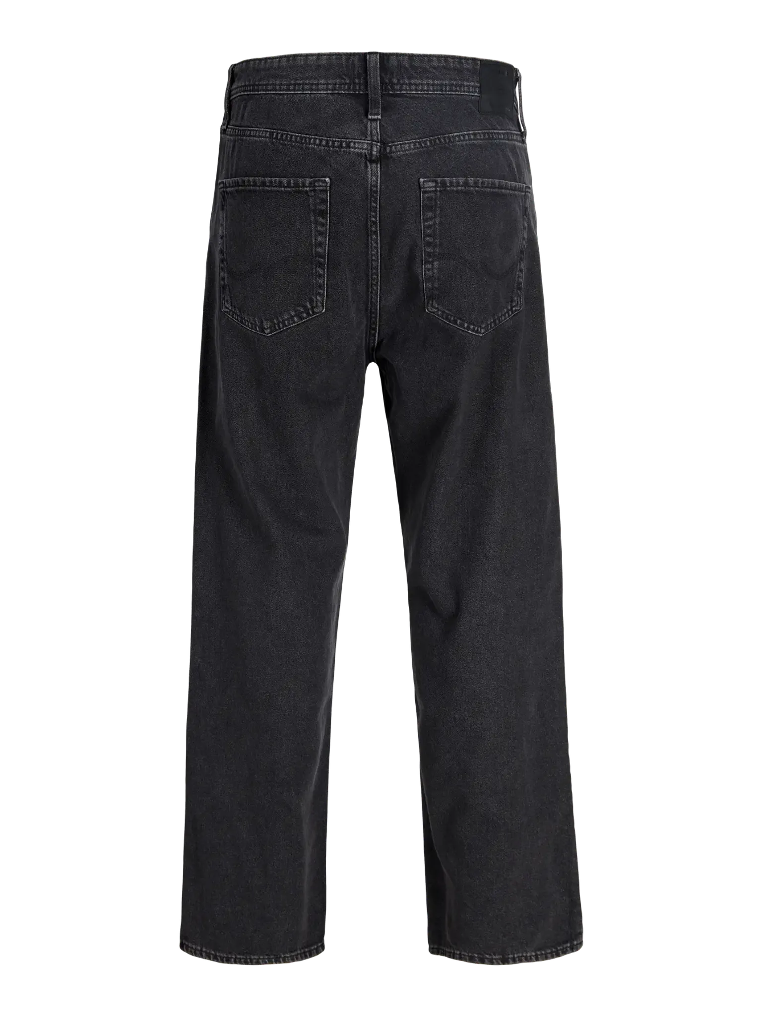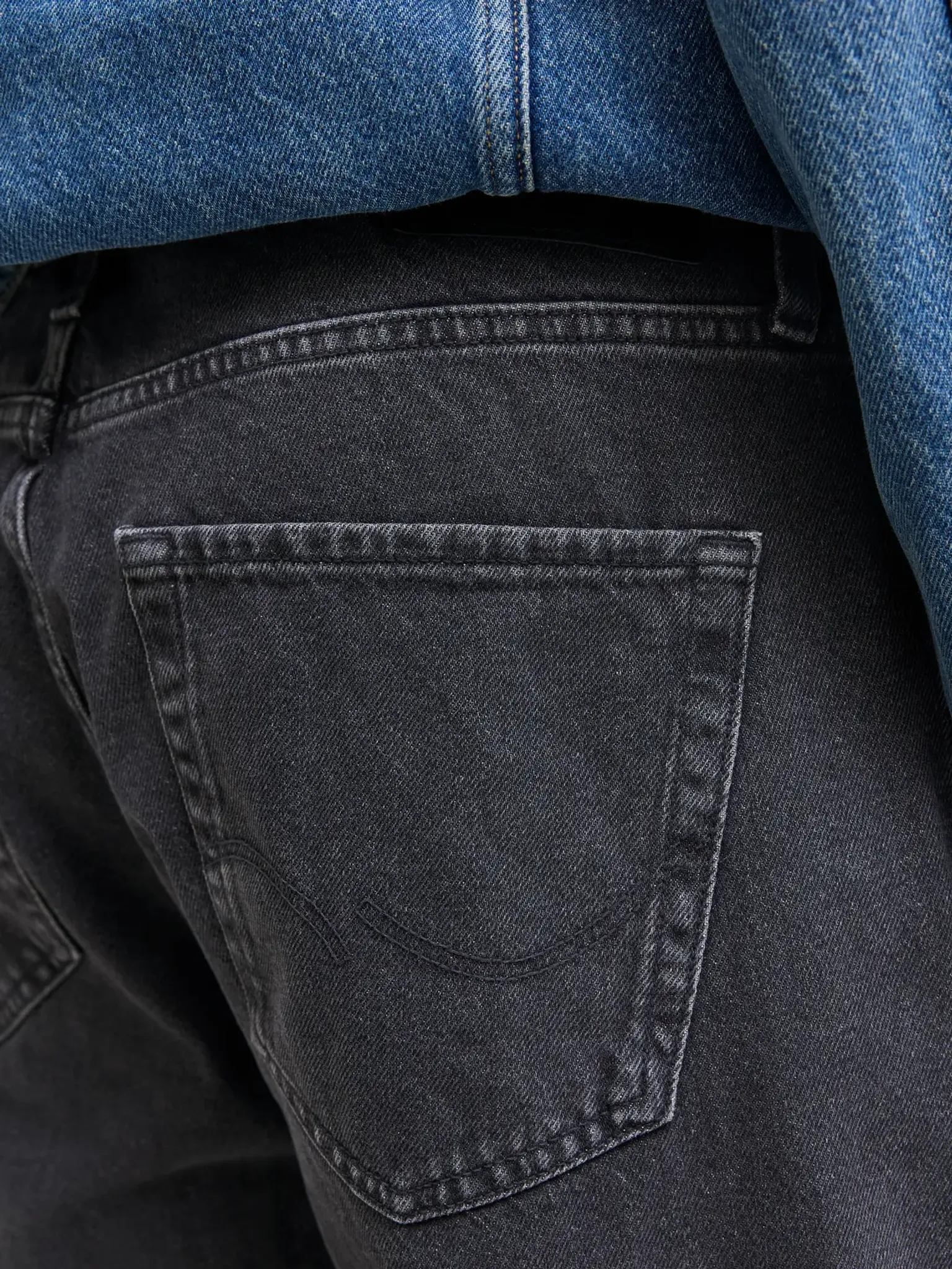 Den svarta denimfärgen är behandlad med stonewash, vilket ger ett urtvättat och slitet uttryck för en trendig vintagekänsla. Tyget är vävt i twill, vilket skapar den karakteristiska denimstrukturen med diagonala linjer som gör jeansen slitstarka och hållbara.