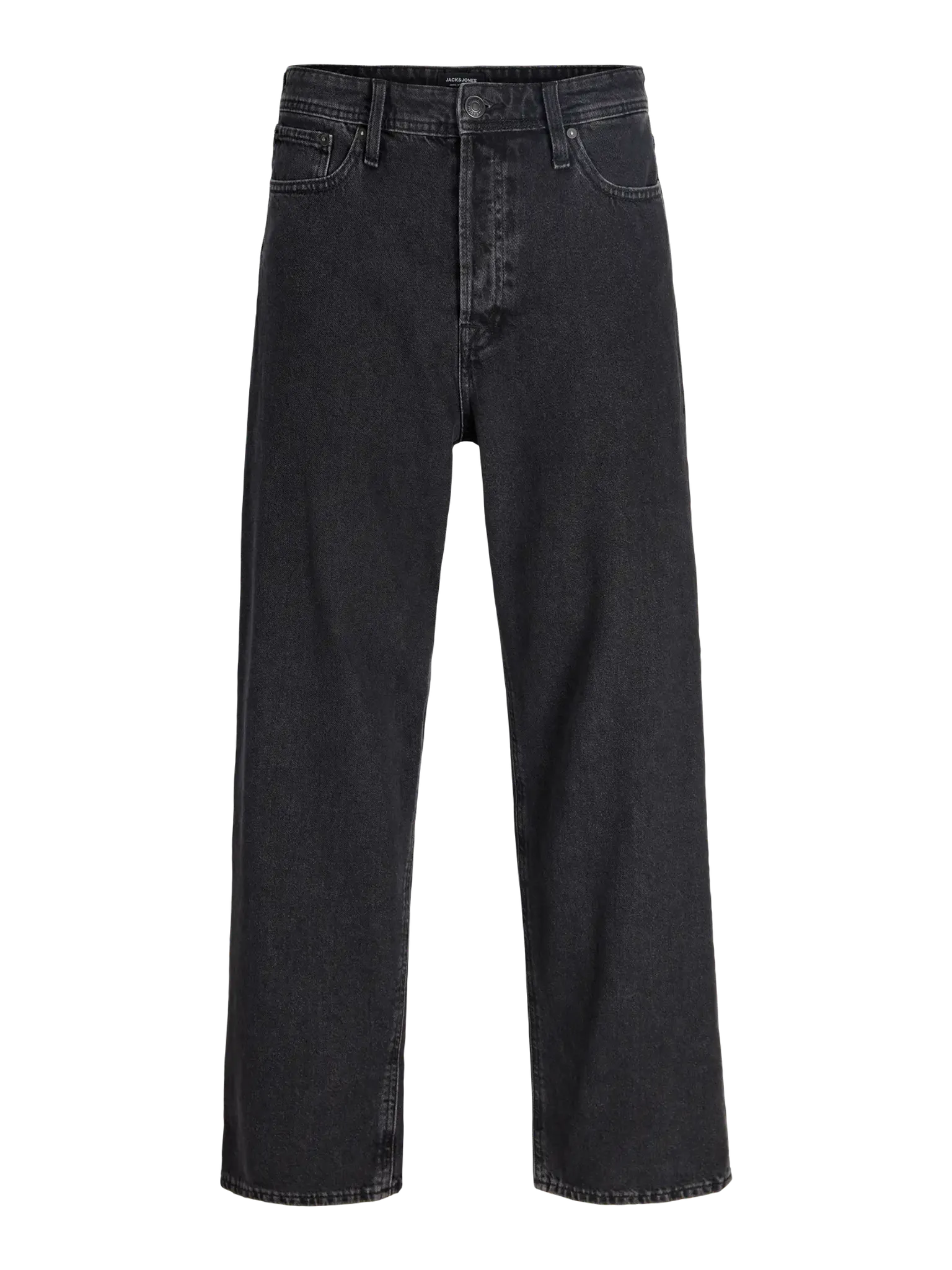 Svarta relaxed fit jeans med hög midja är ett tidlöst basplagg med klassisk femfickorsdesign. Passformen är avslappnad över lår, knän och benslut, vilket ger en bekväm känsla och en ledig silhuett som passar perfekt för vardagsbruk.