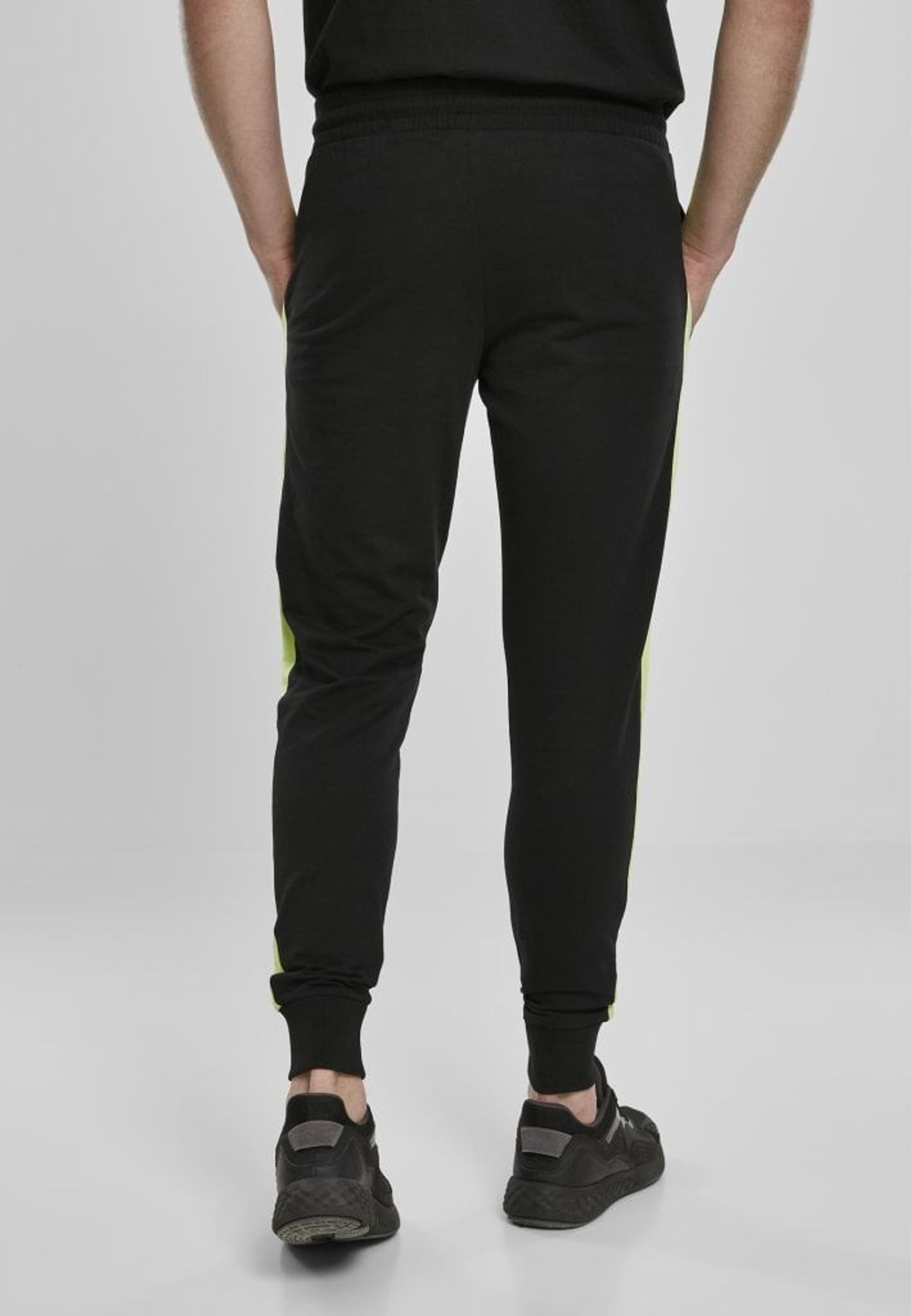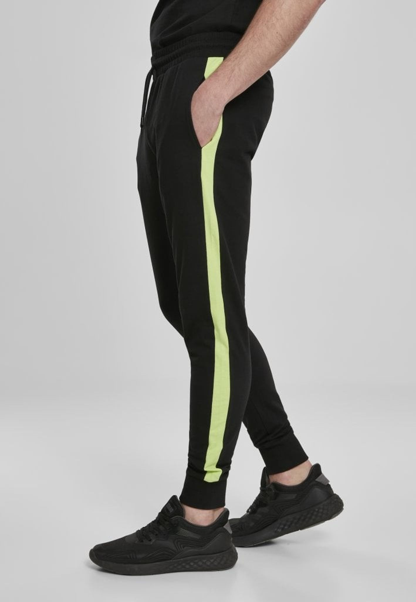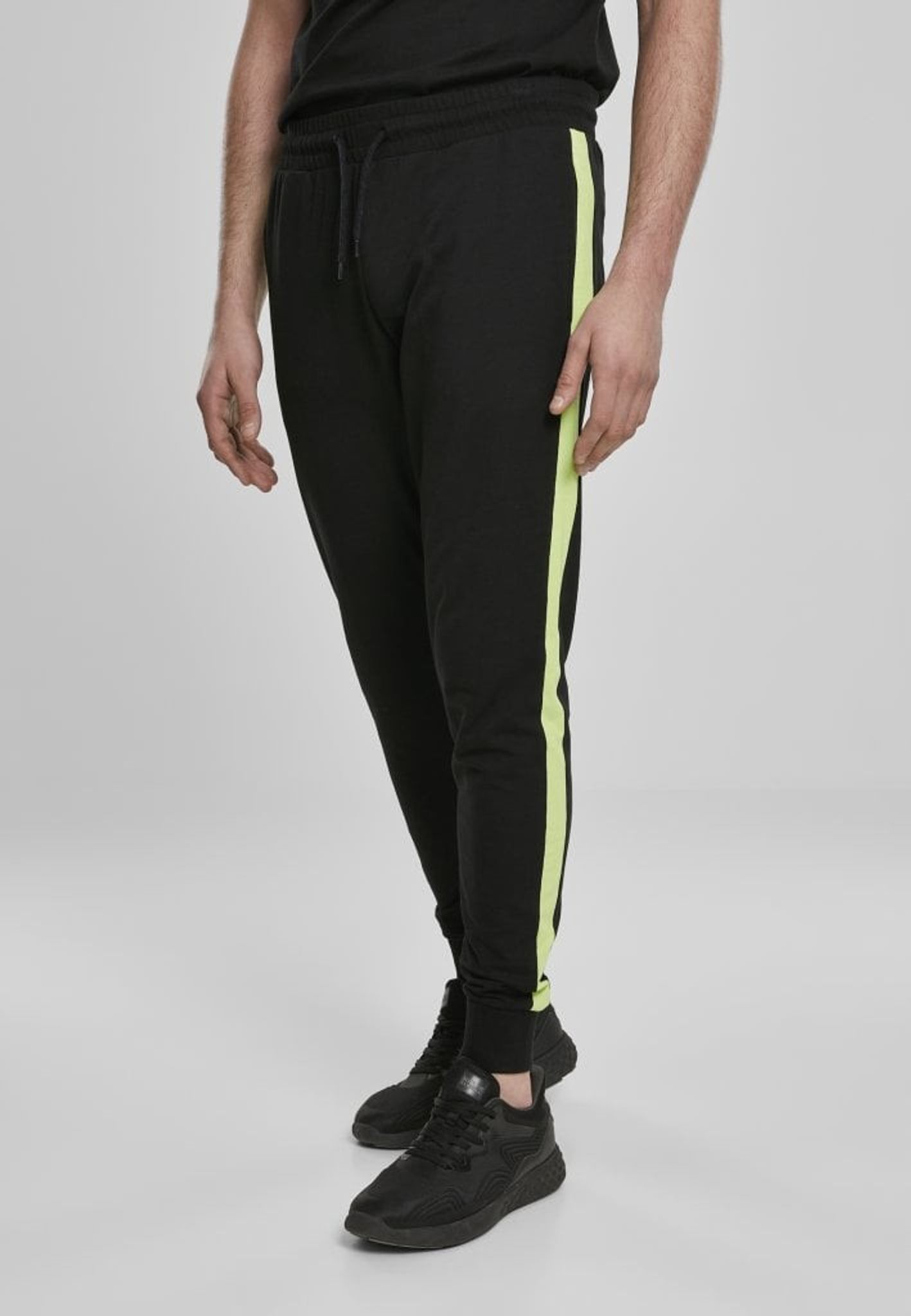 Ett par stilrena joggingbyxor med en rand längs benet i neonfärg.