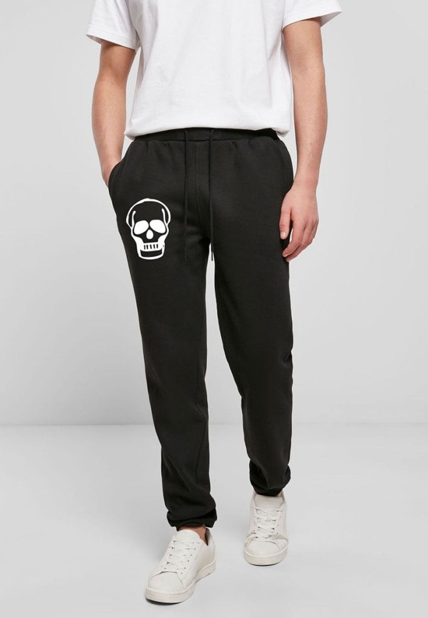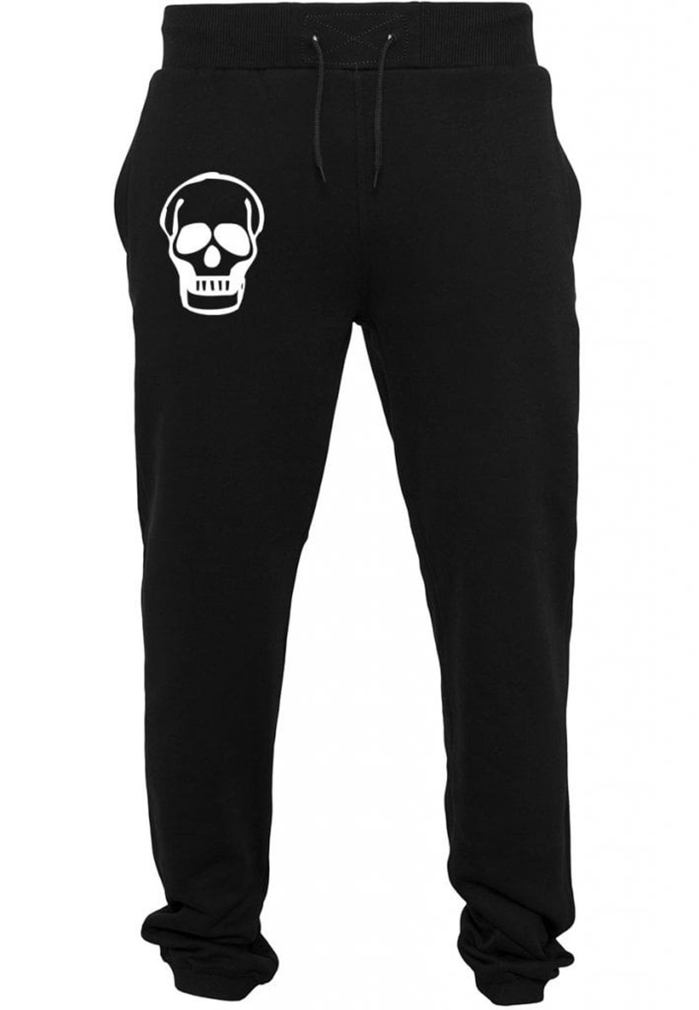 Ett par sköna mjukisbyxor med bred mudd i midjan och med elastisk mudd i bensluten. På högra sidan finns konturerna av en skalle.