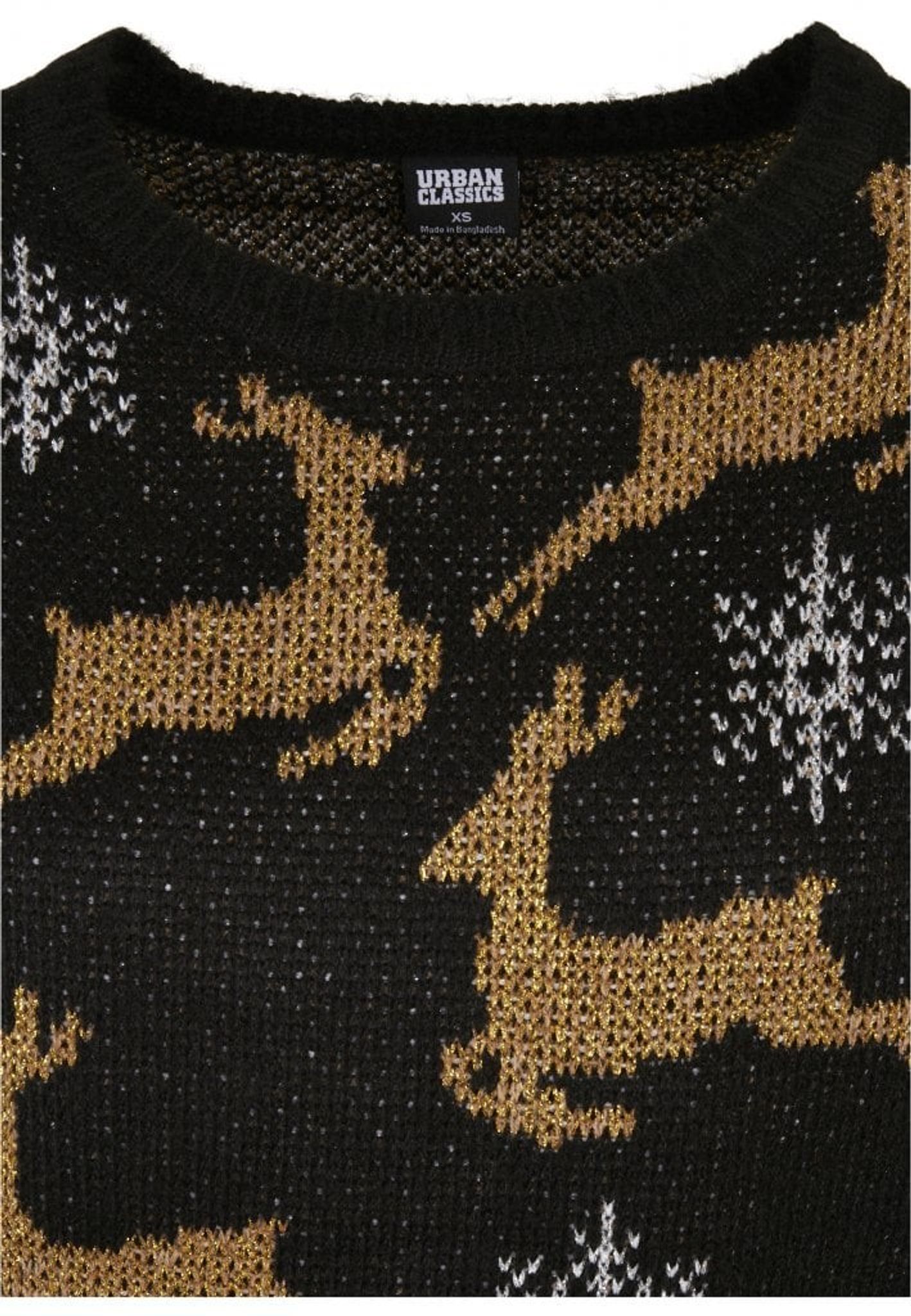 Tröjan med julmotiv har en stickad mudd i nederkanten, i armsluten och i halsen.