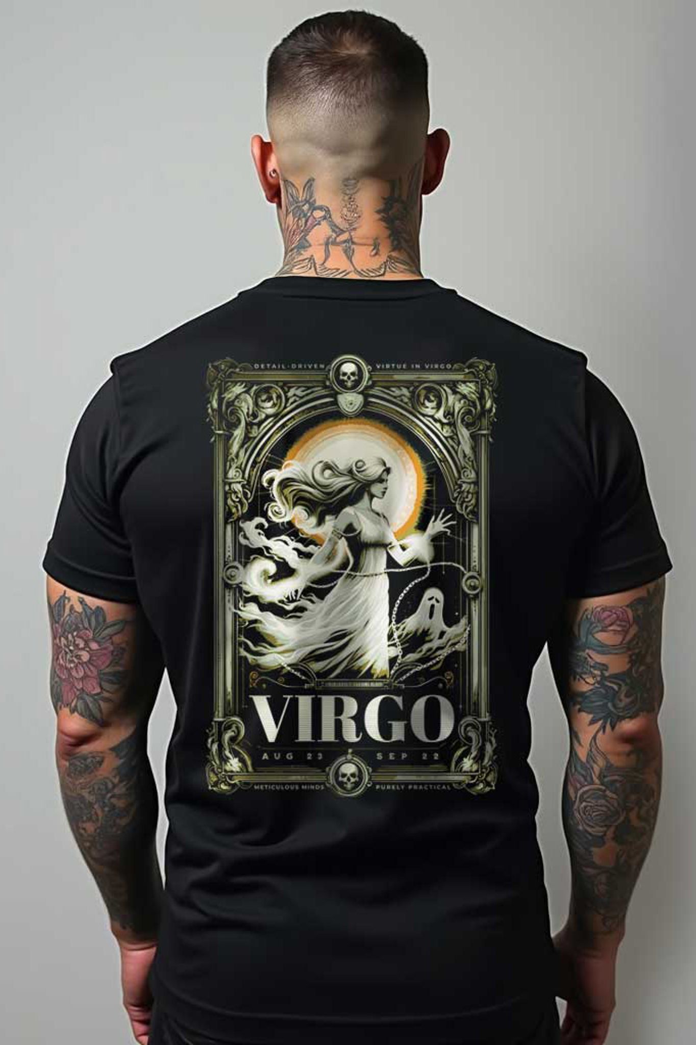 Denna eleganta T-shirt är perfekt för dig som är född i stjärntecknet Jungfrun. På bröstet finns den stilrena texten "Virgo" och på ryggen ett detaljrikt tryck som visar en mytisk kvinnofigur omgiven av naturens symbolik – en hyllning till Jungfruns analytiska, jordnära och omtänksamma egenskaper.