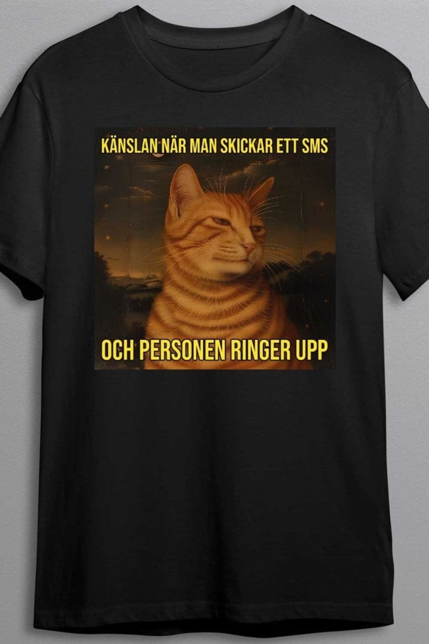 Den här T-shirten är för dig som älskar memes, humor och att uttrycka livets små frustrationer på ett stilrent (och kattigt) sätt. Perfekt för casual dagar, AW eller när du vill undvika telefonprat men ändå göra ett intryck.