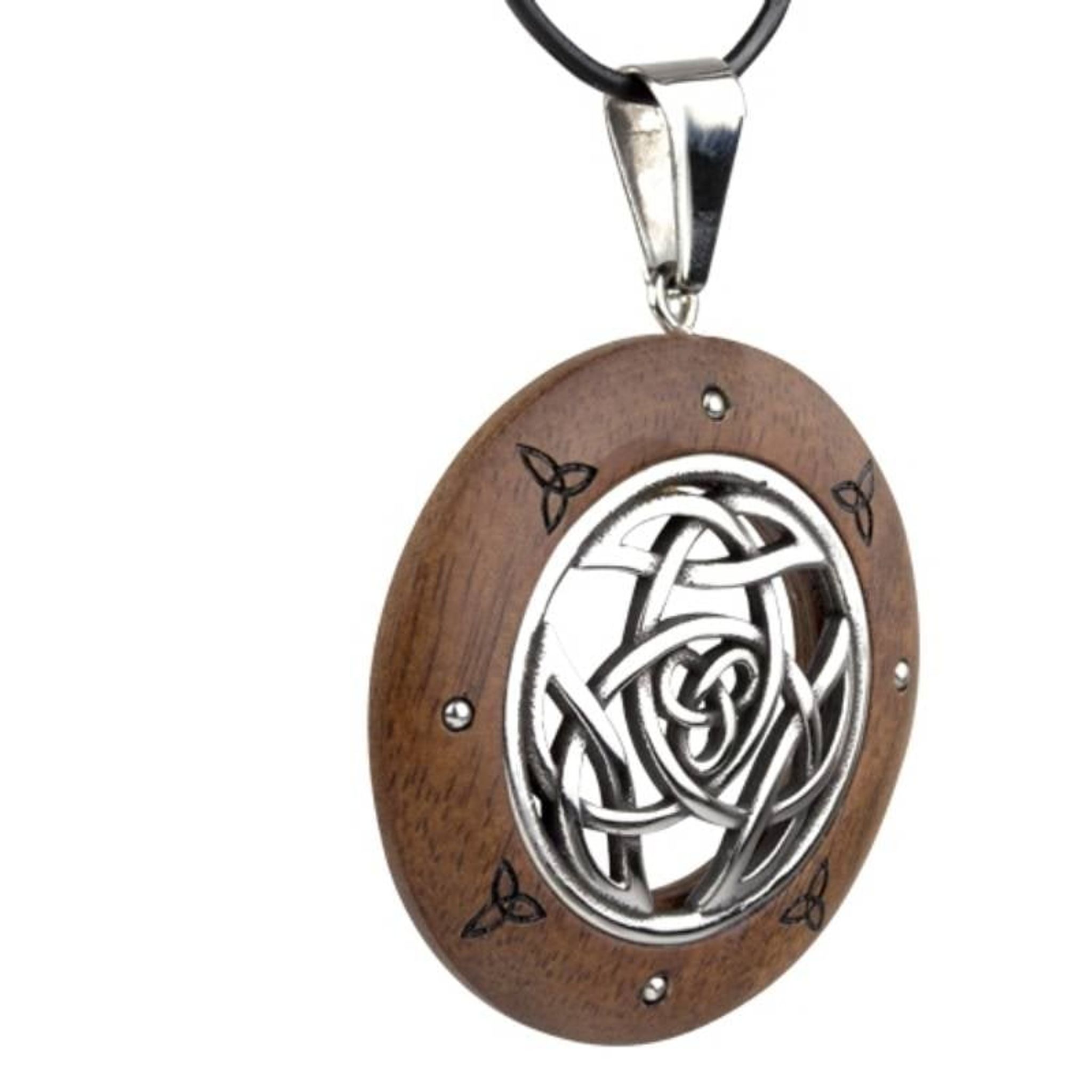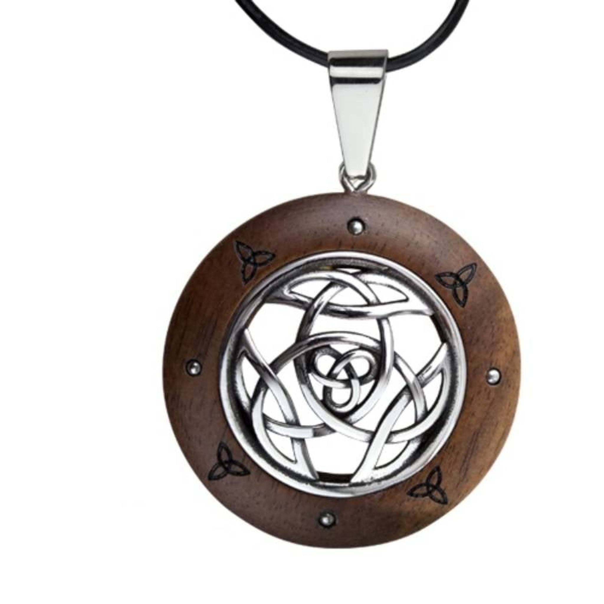 En cirkel i valnötsträ och cirkelns mitt finns en keltisk knut i rostfritt stål.