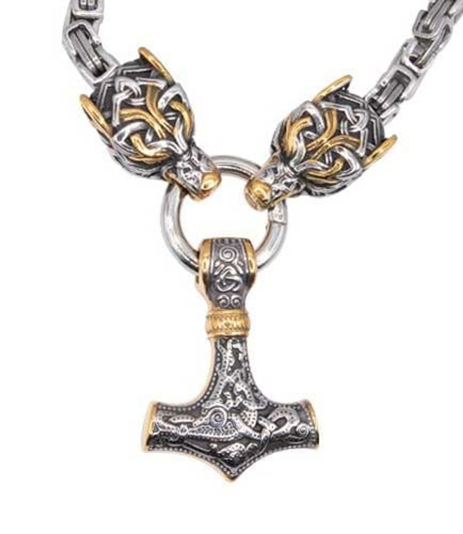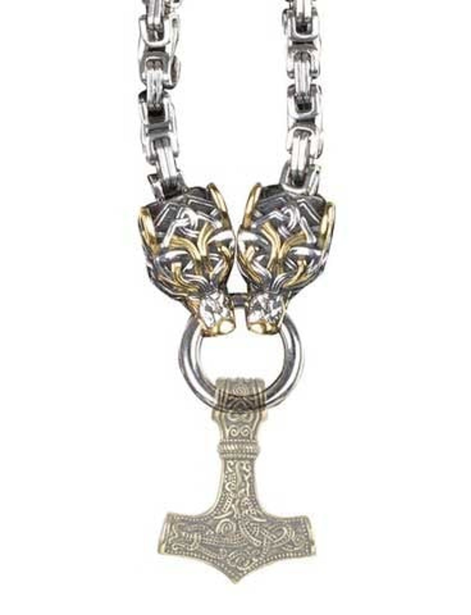 I detta utsökta smycke förenas hantverksskicklighet och mytologisk symbolik i en design som utstrålar både elegans och styrka. Halskedjan, som är smidd i rostfritt stål och delvis förgylld, är en manifestation av den kraft som vargar representerar i många kulturer, speciellt inom den nordiska mytologin. De två varghuvudena som pryder kedjan är detaljerade med guldpläterade inslag som accentuerar deras majestätiska drag och ger designen en djupare dimension.