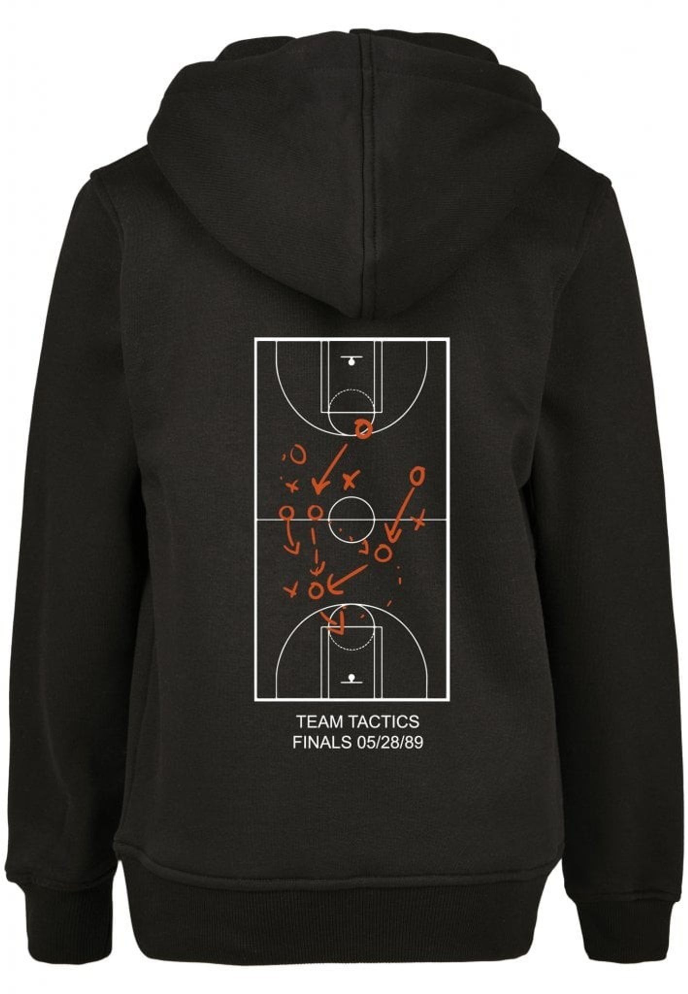Svart luvtröja för barn från Mister Tee med breda muddar. Bekväm med känguruficka och ett brösttryck med basketboll. På baksidan ett ryggtryck med tips på lagtaktik för basketplanen.