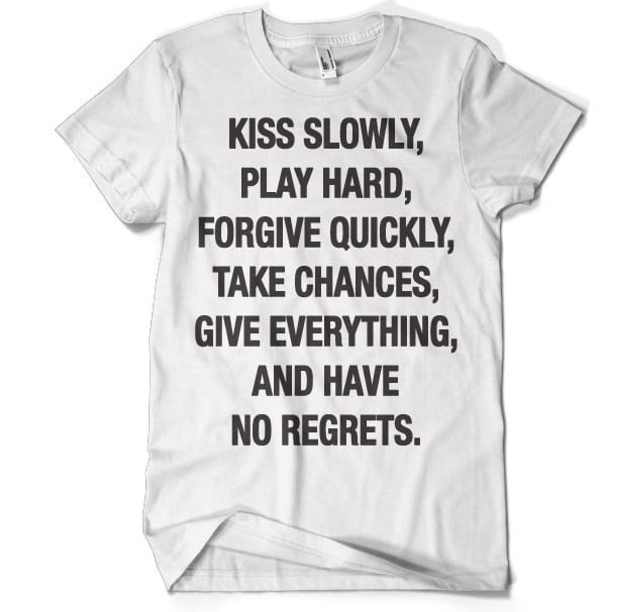 Så oavsett om du bär den under en skinnjacka och jeans, eller bara tillsammans med dina favoritjoggingbyxor, låt vår Kiss Slowly T-Shirt vara en påminnelse om att ta det lugnt. För i slutändan, är det inte bättre att sakta ner och njuta av livet?