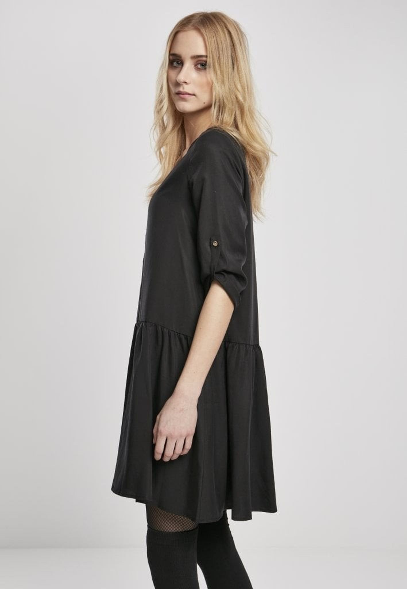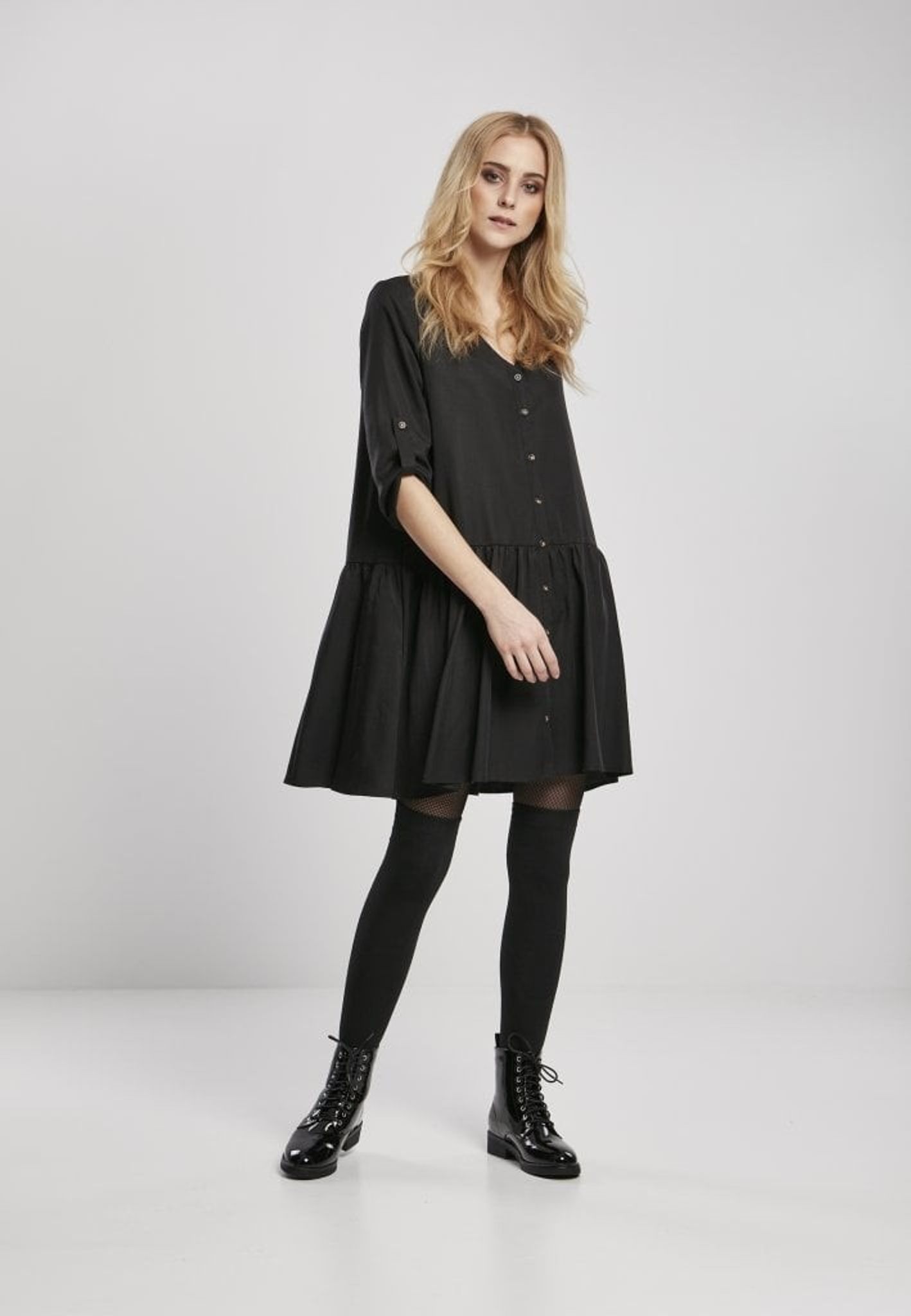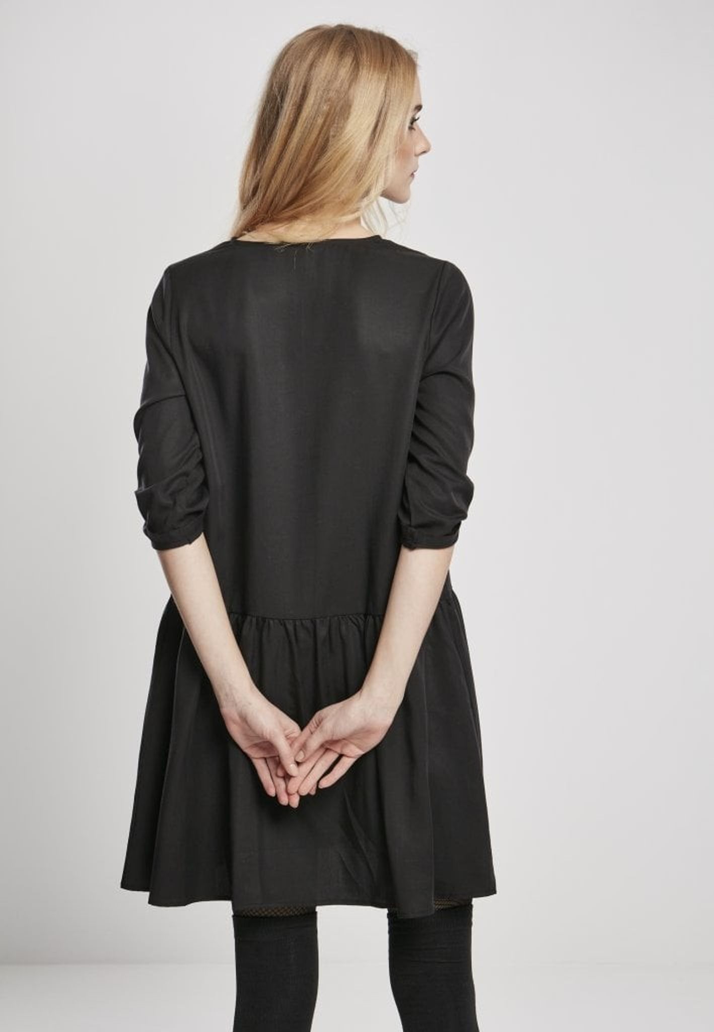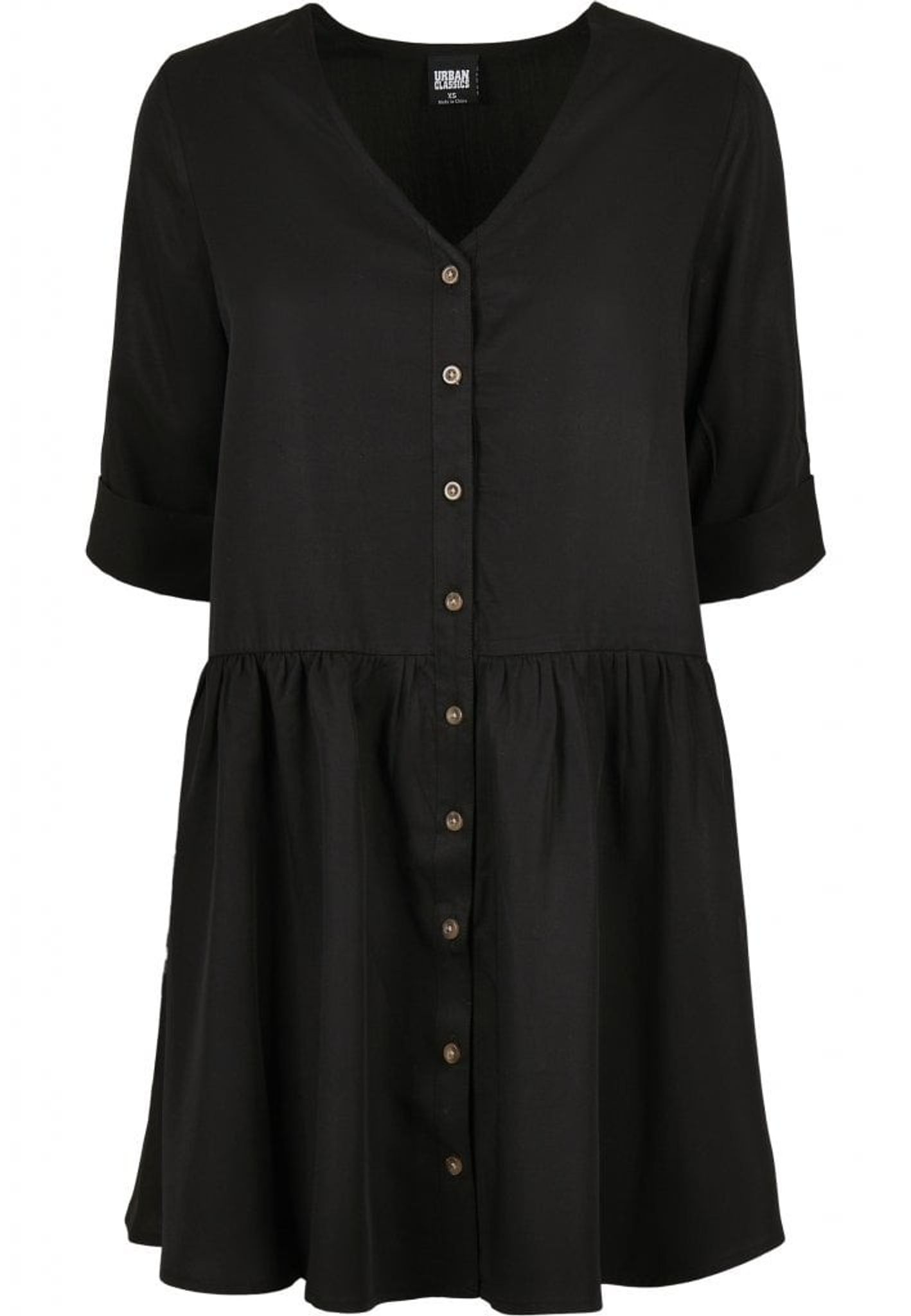 Detta är en svart skjortklänning med en lekfull, sportig design.