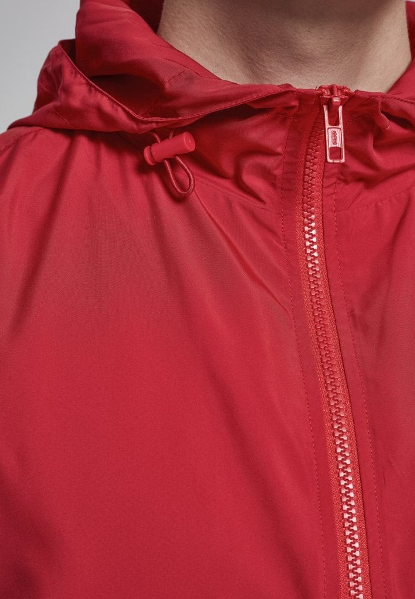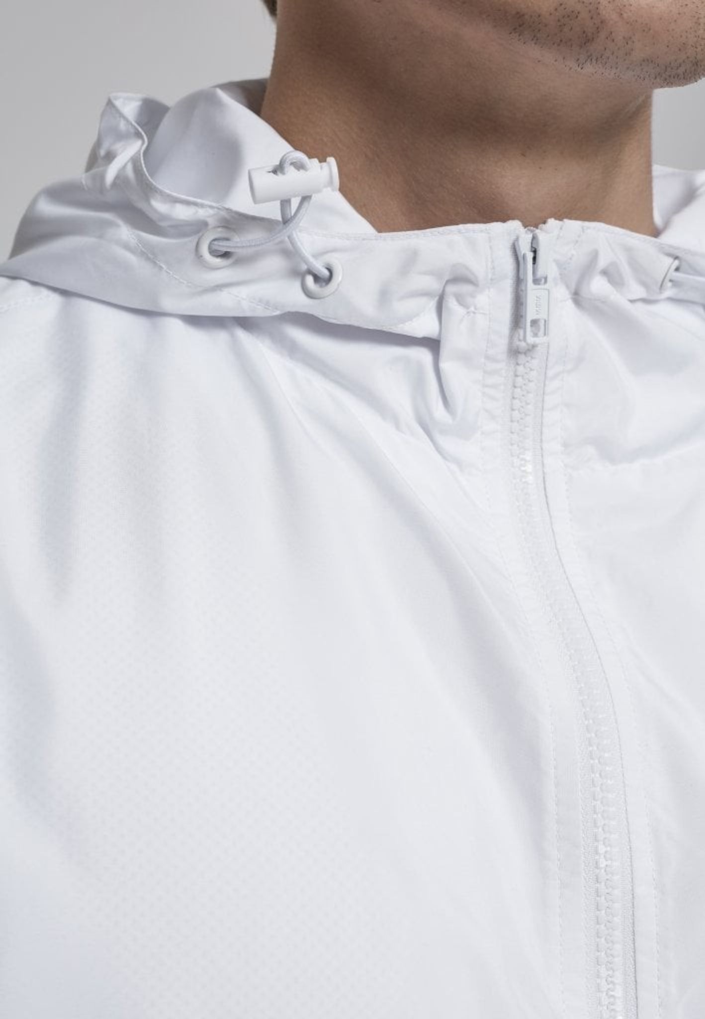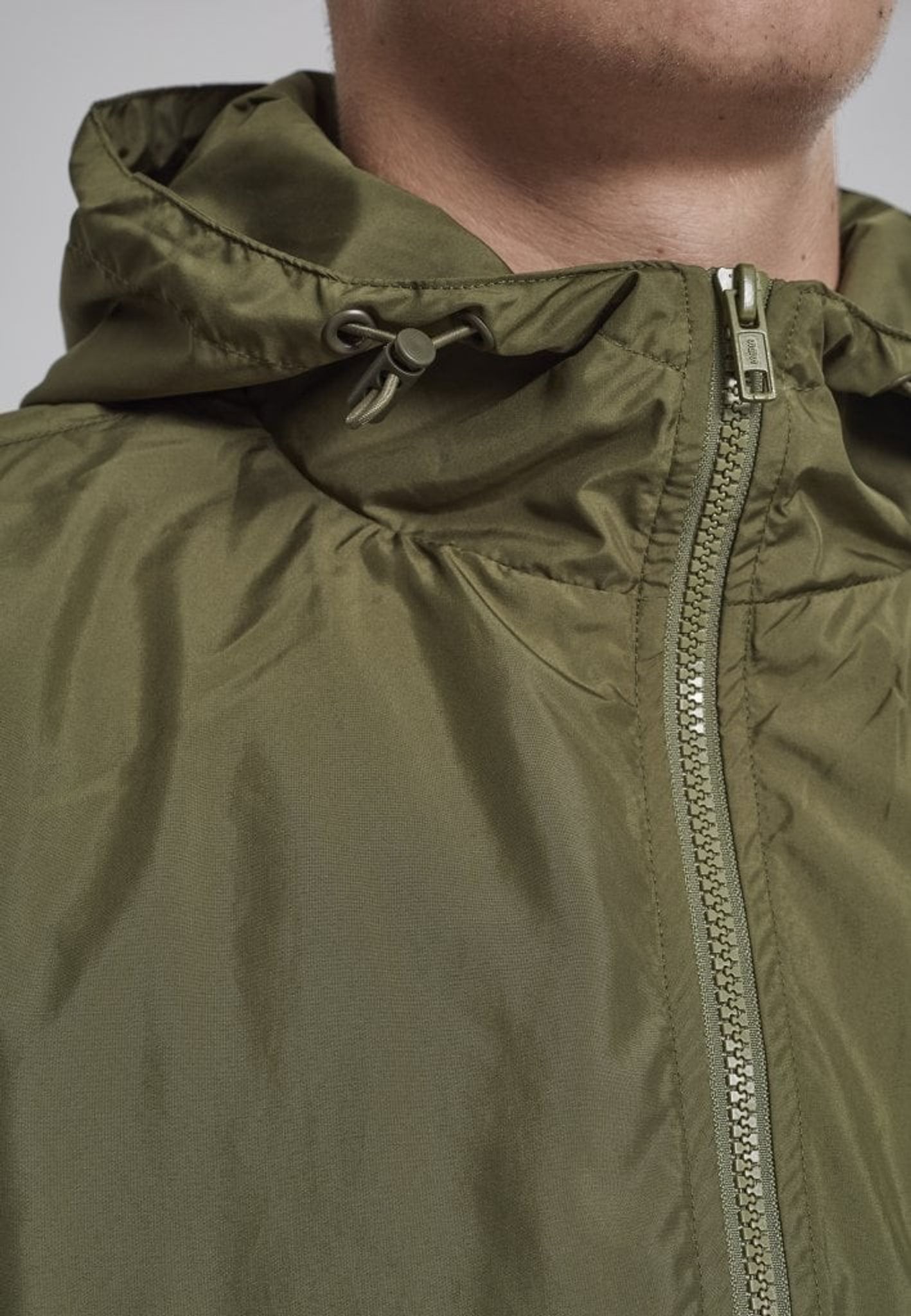 Jackan har en dragkedja i halsen och en huva.