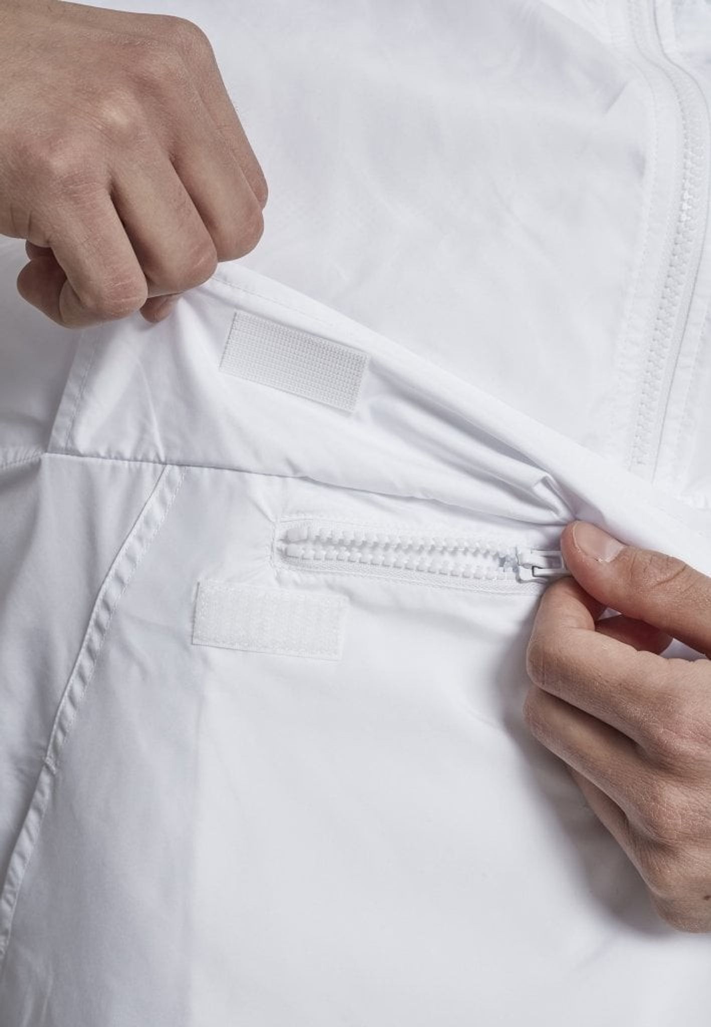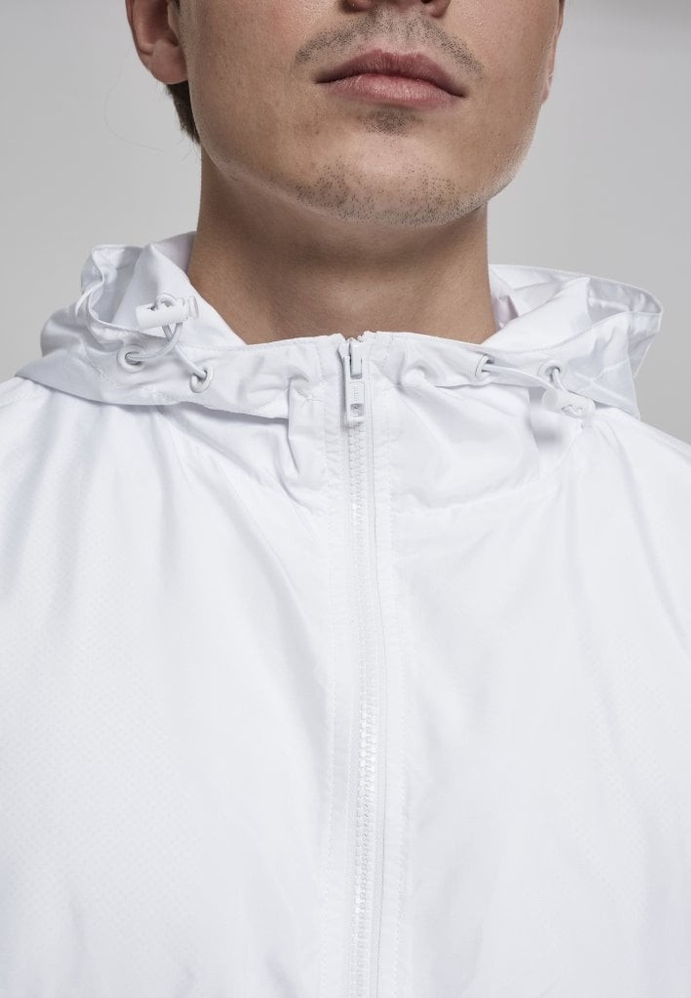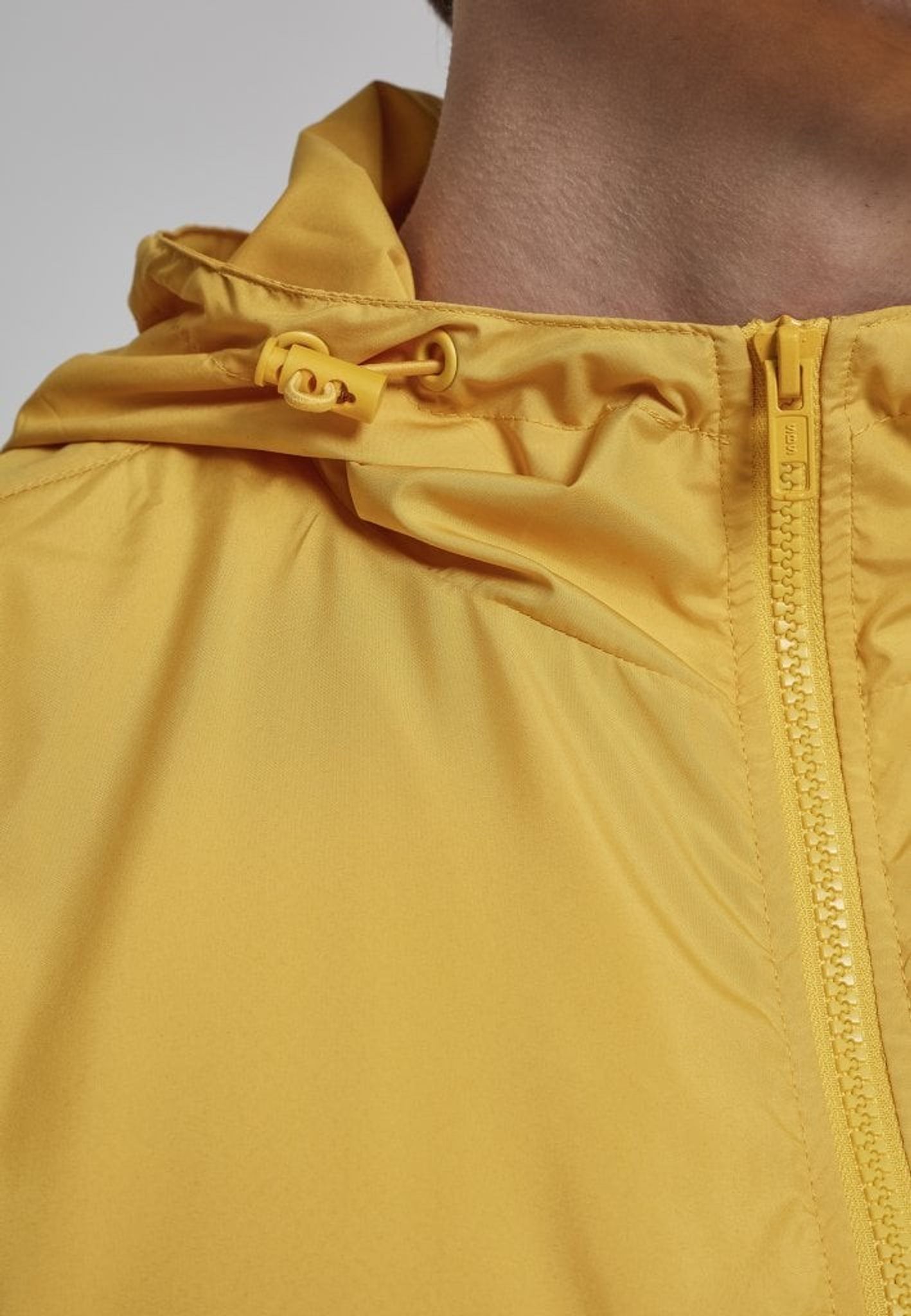 Jackan har en dragkedja i halsen och en huva.