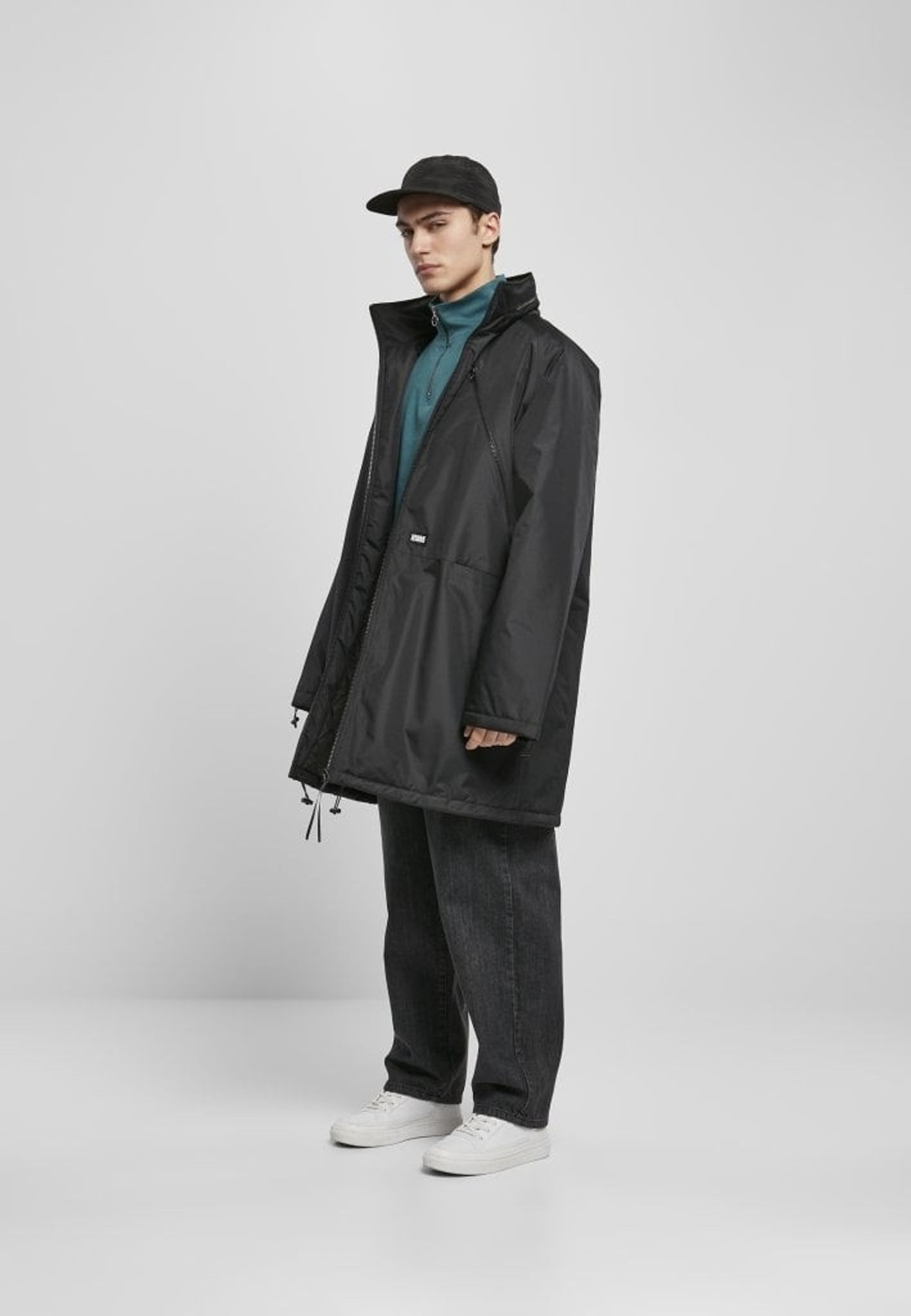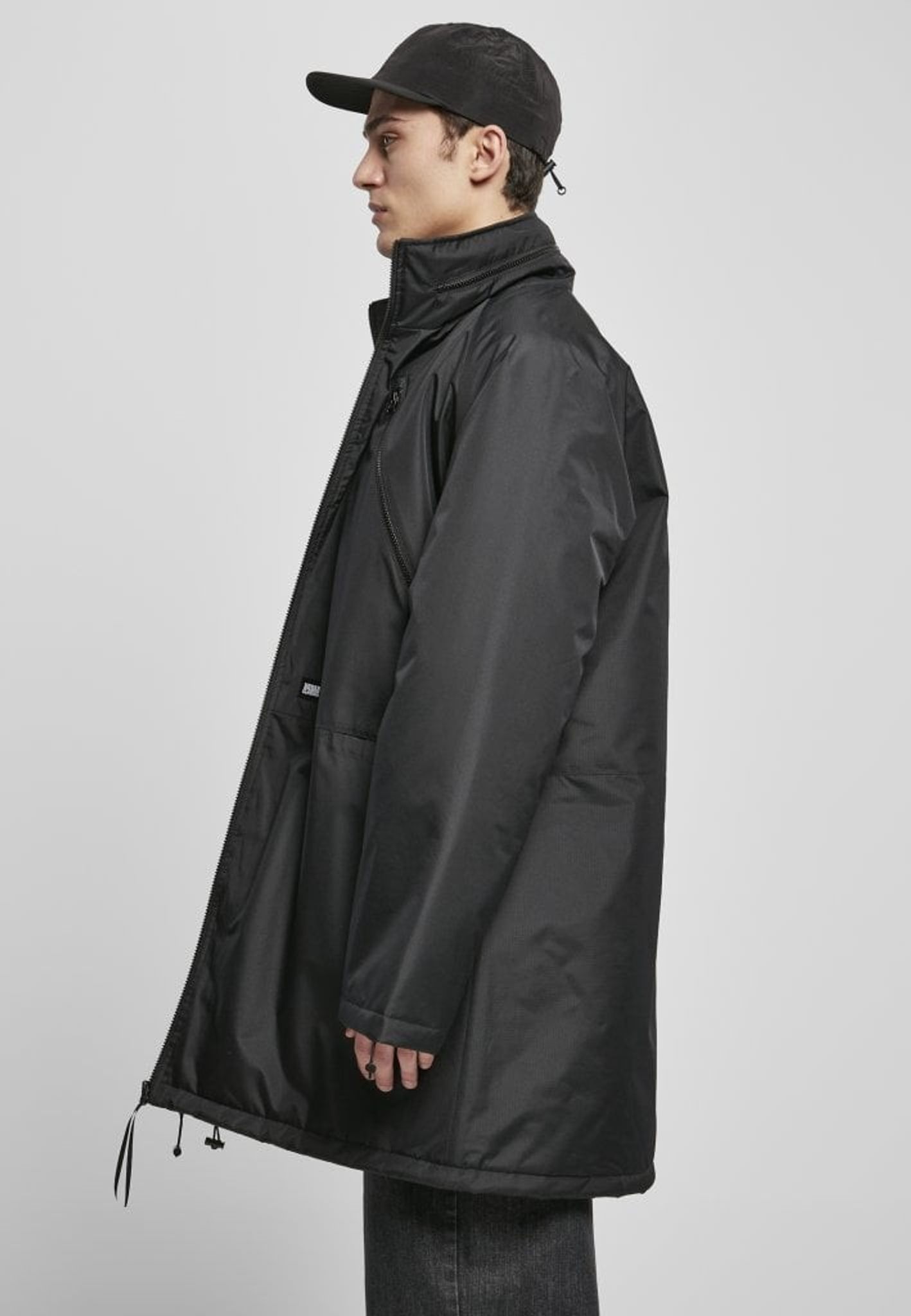 I kragen finns en luva som kan gömas in i kragen med en dragkedja.